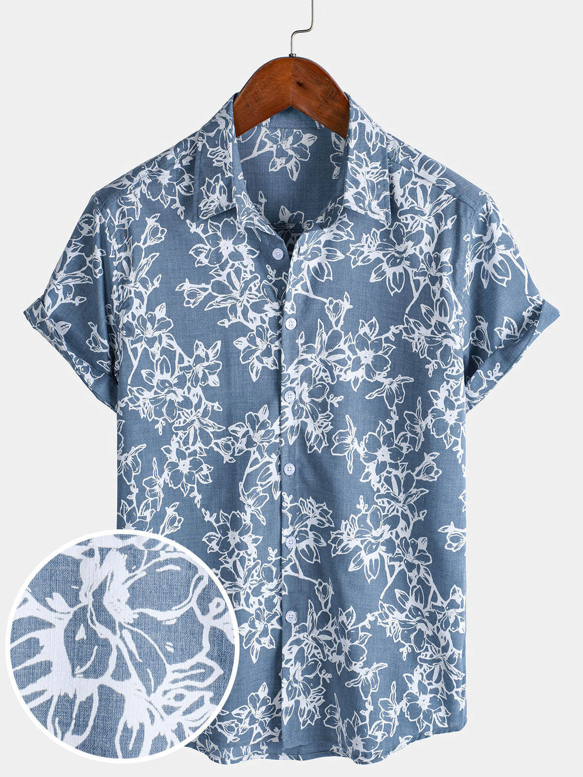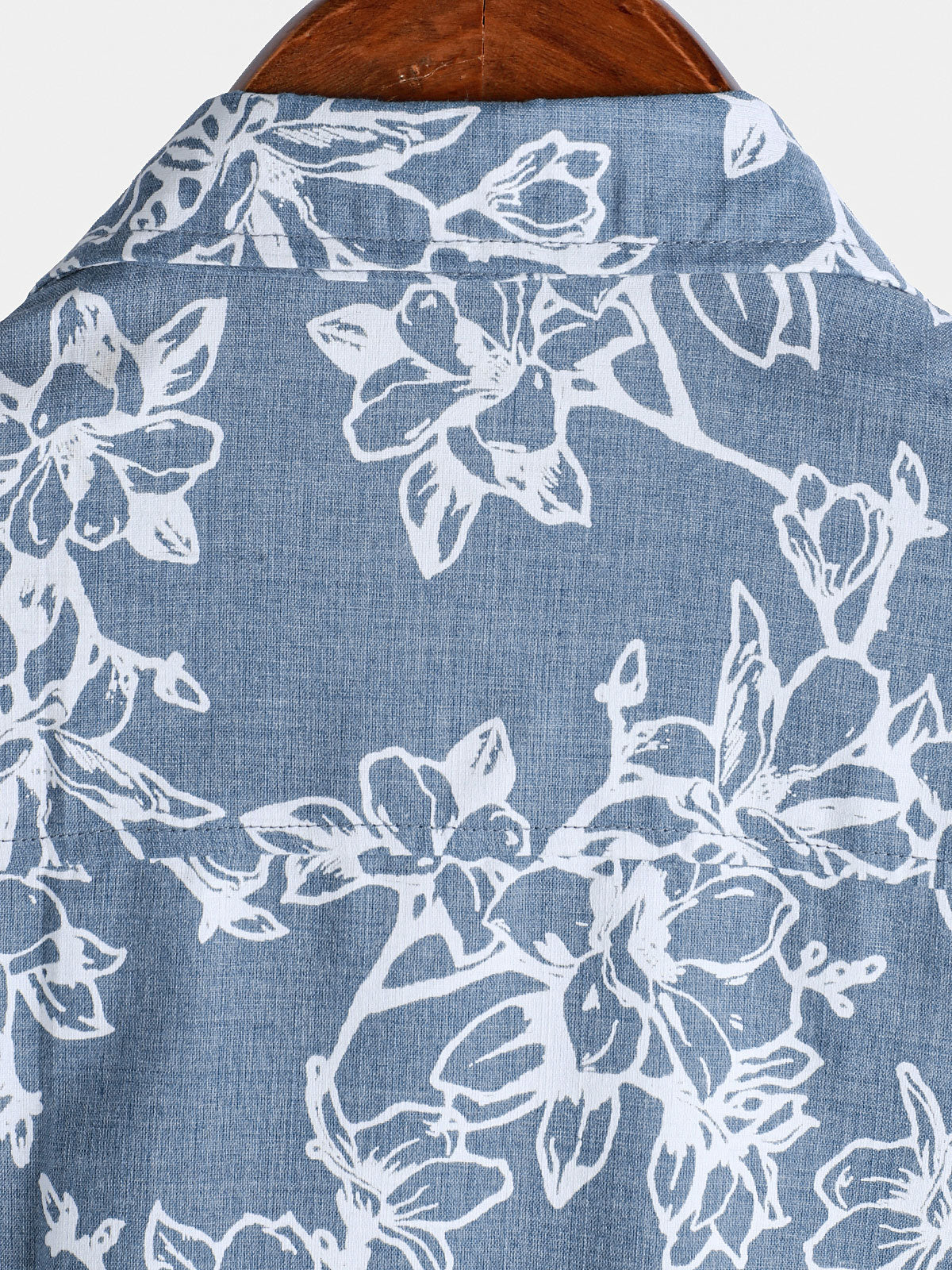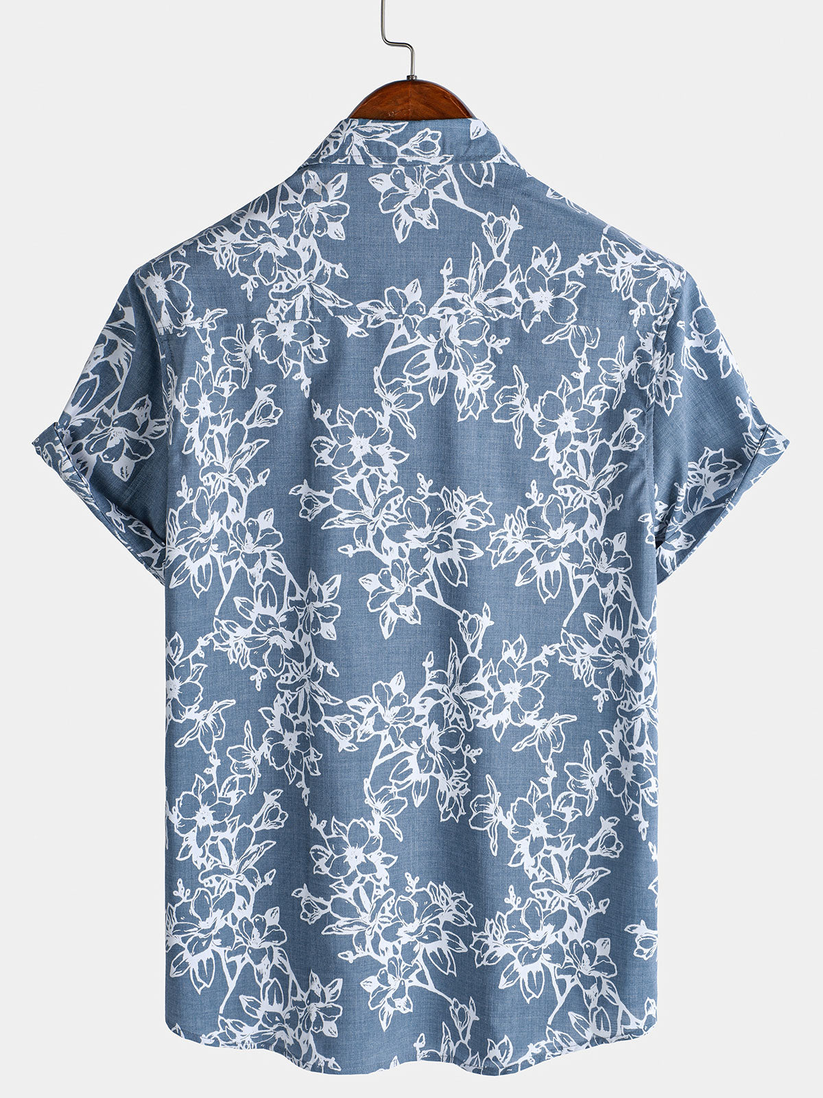 Men's Blue Hawaiian Floral Print Short Sleeve Summer Cotton Shirt