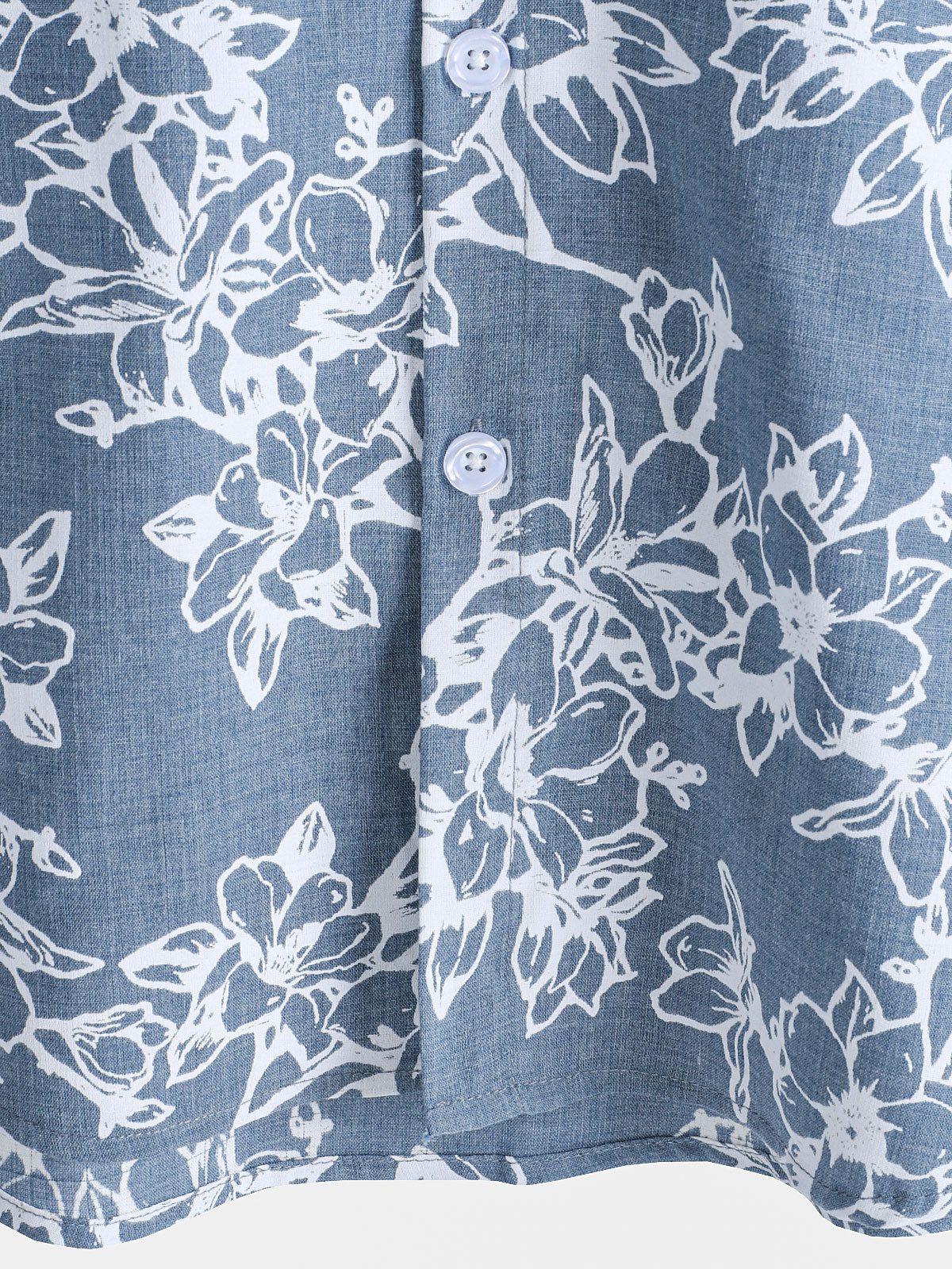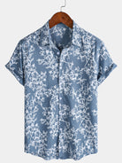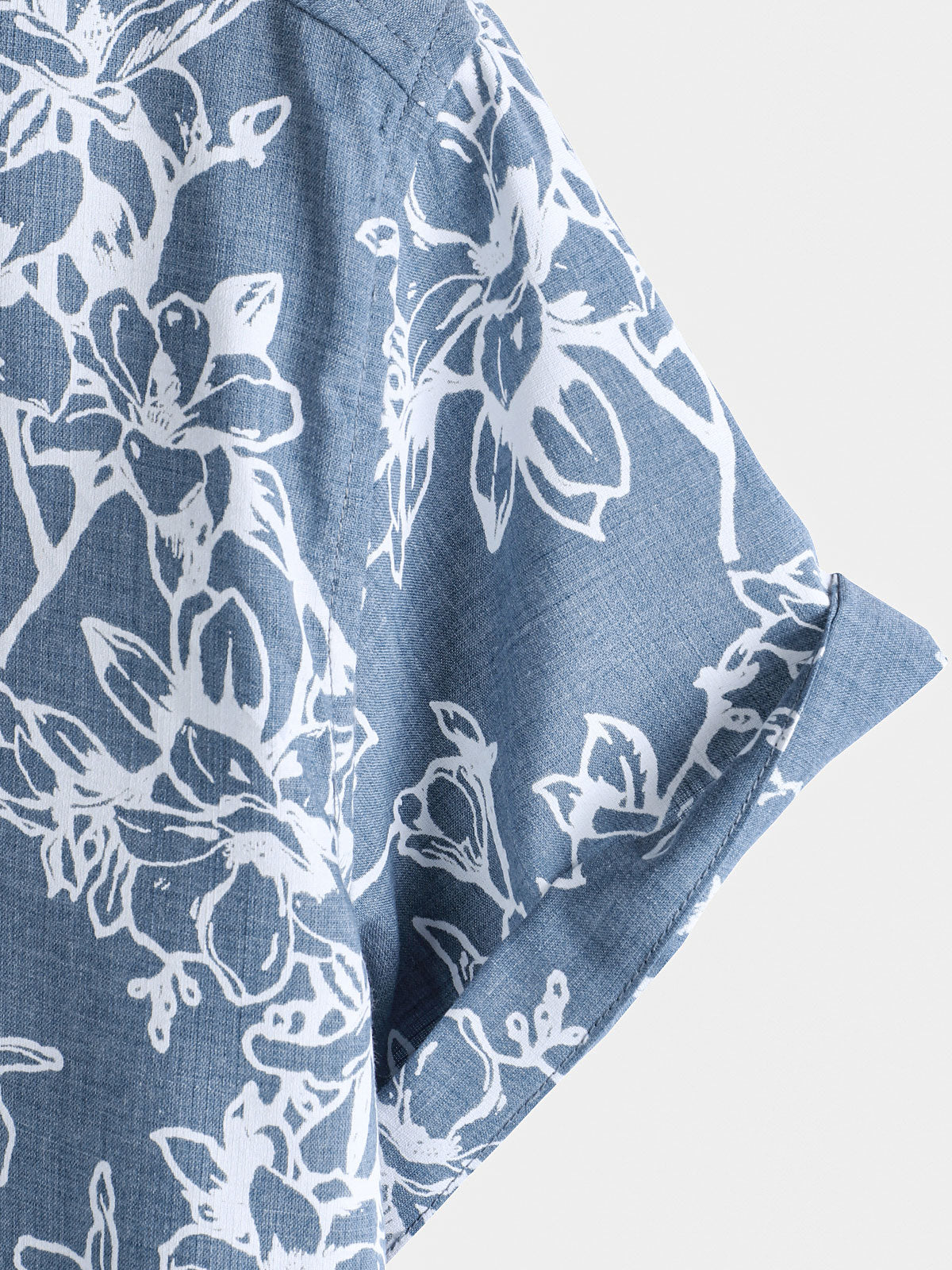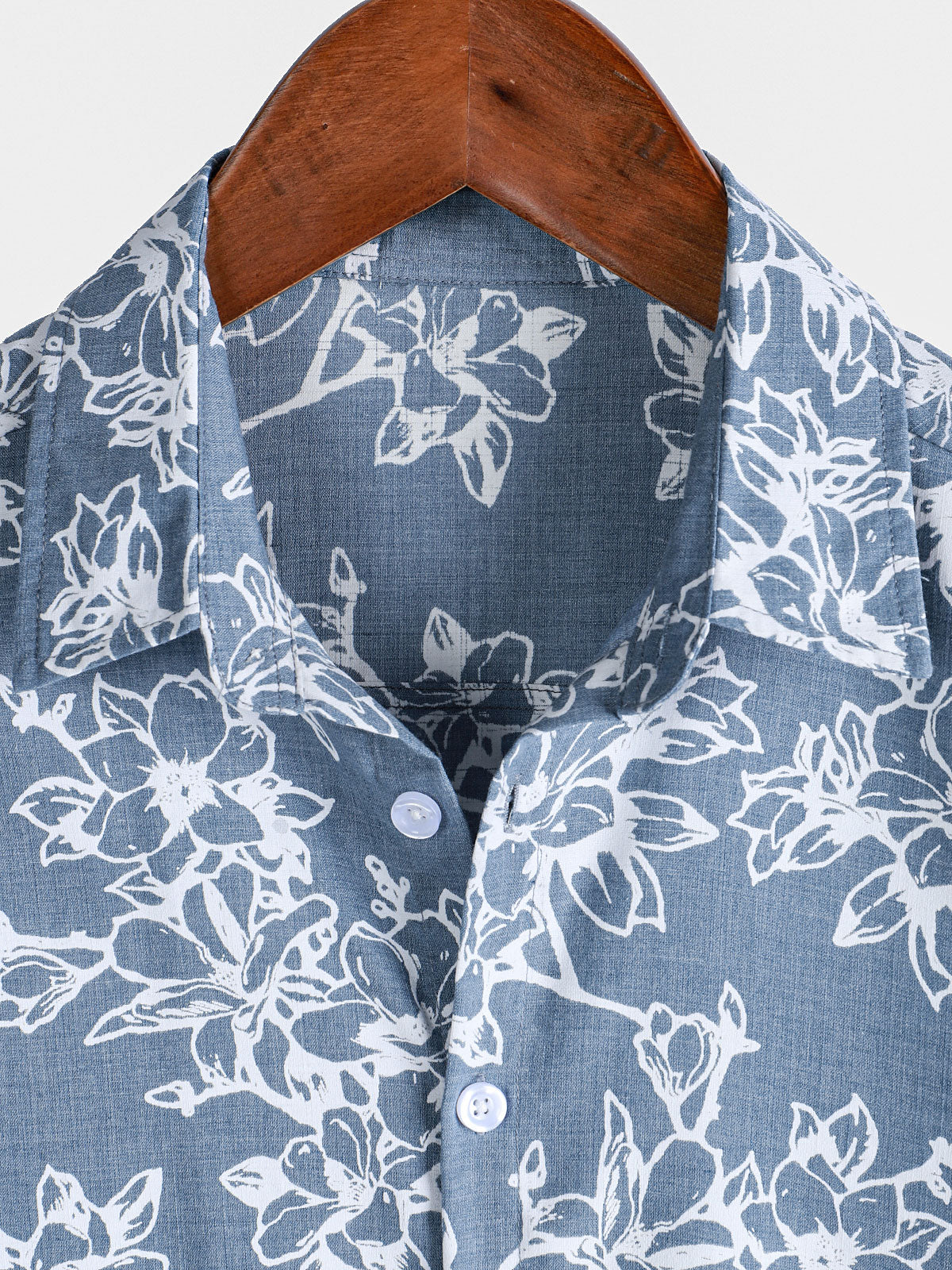 Men's Blue Hawaiian Floral Print Short Sleeve Summer Cotton Shirt