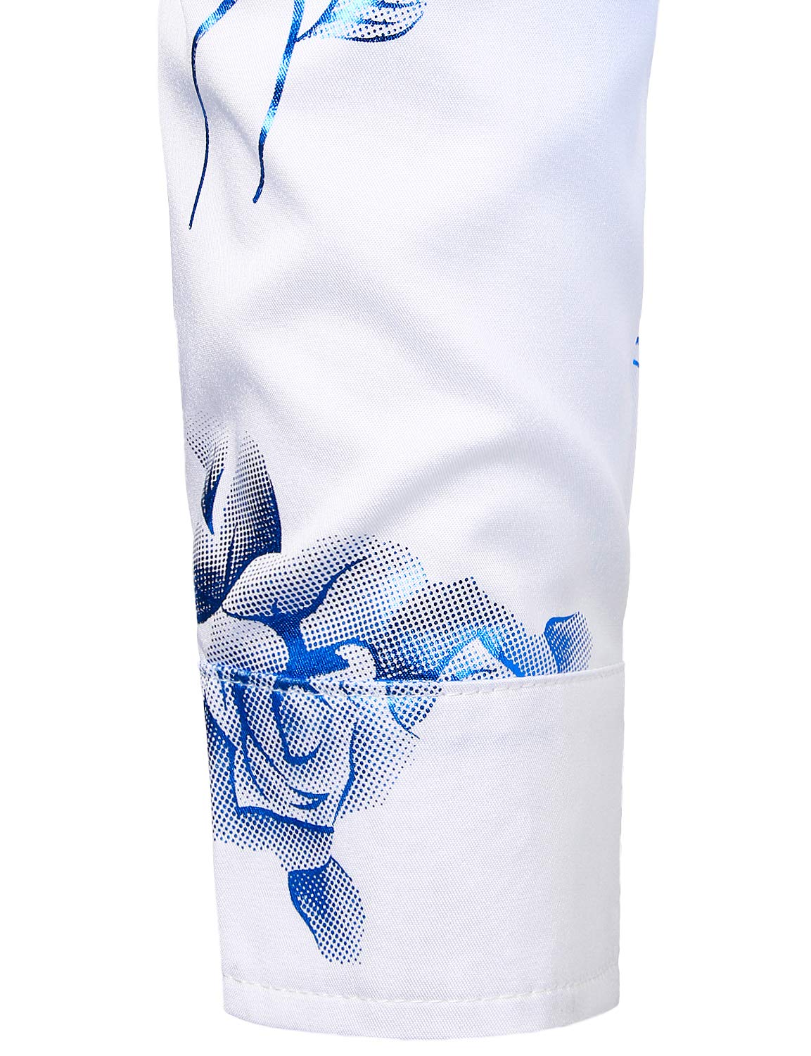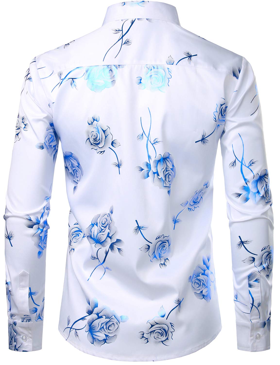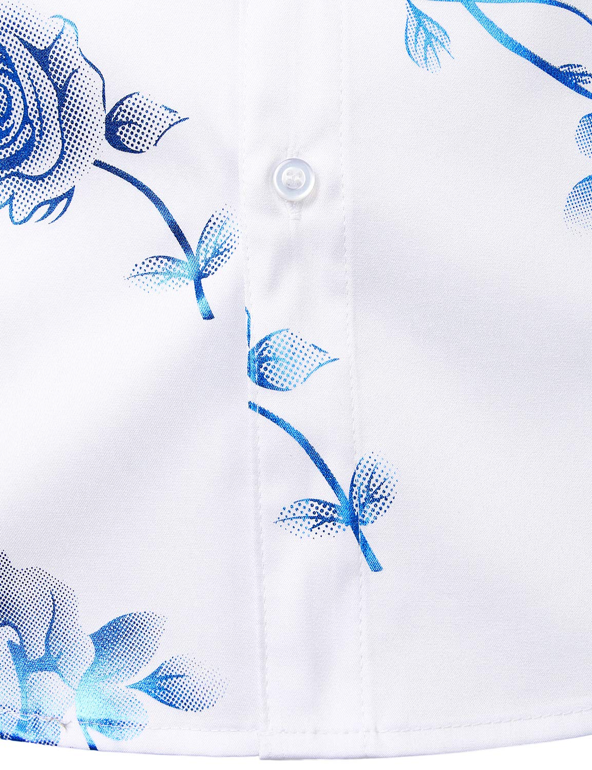 Men's Casual Blue Rose Floral Print Button Up Long Sleeve Dress Shirt