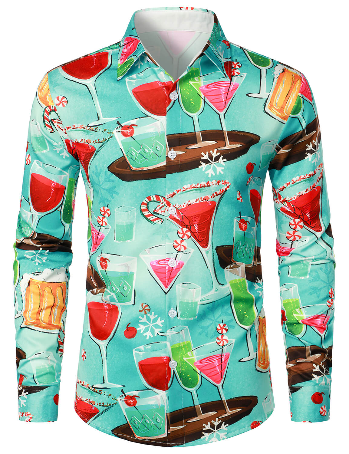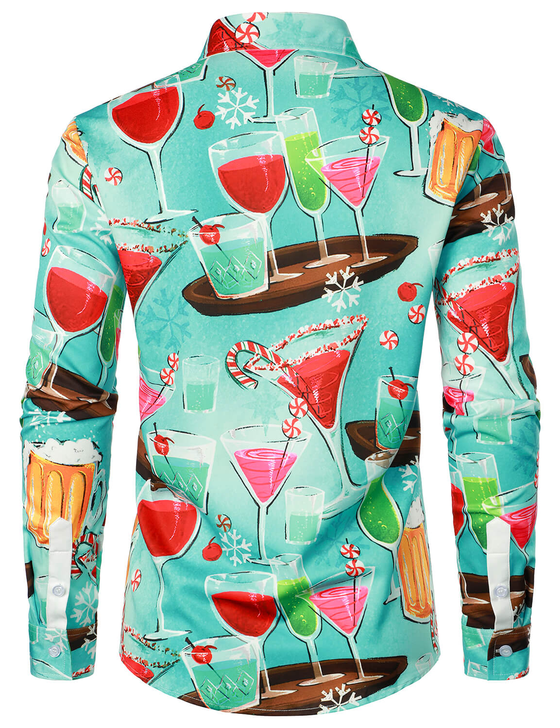 Men's Casual Holiday Wine Glass Print Button Up Long Sleeve Cotton Party Shirt