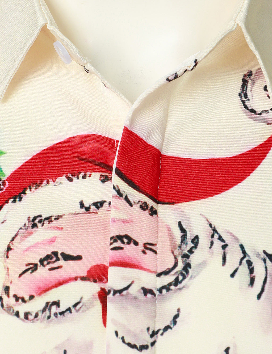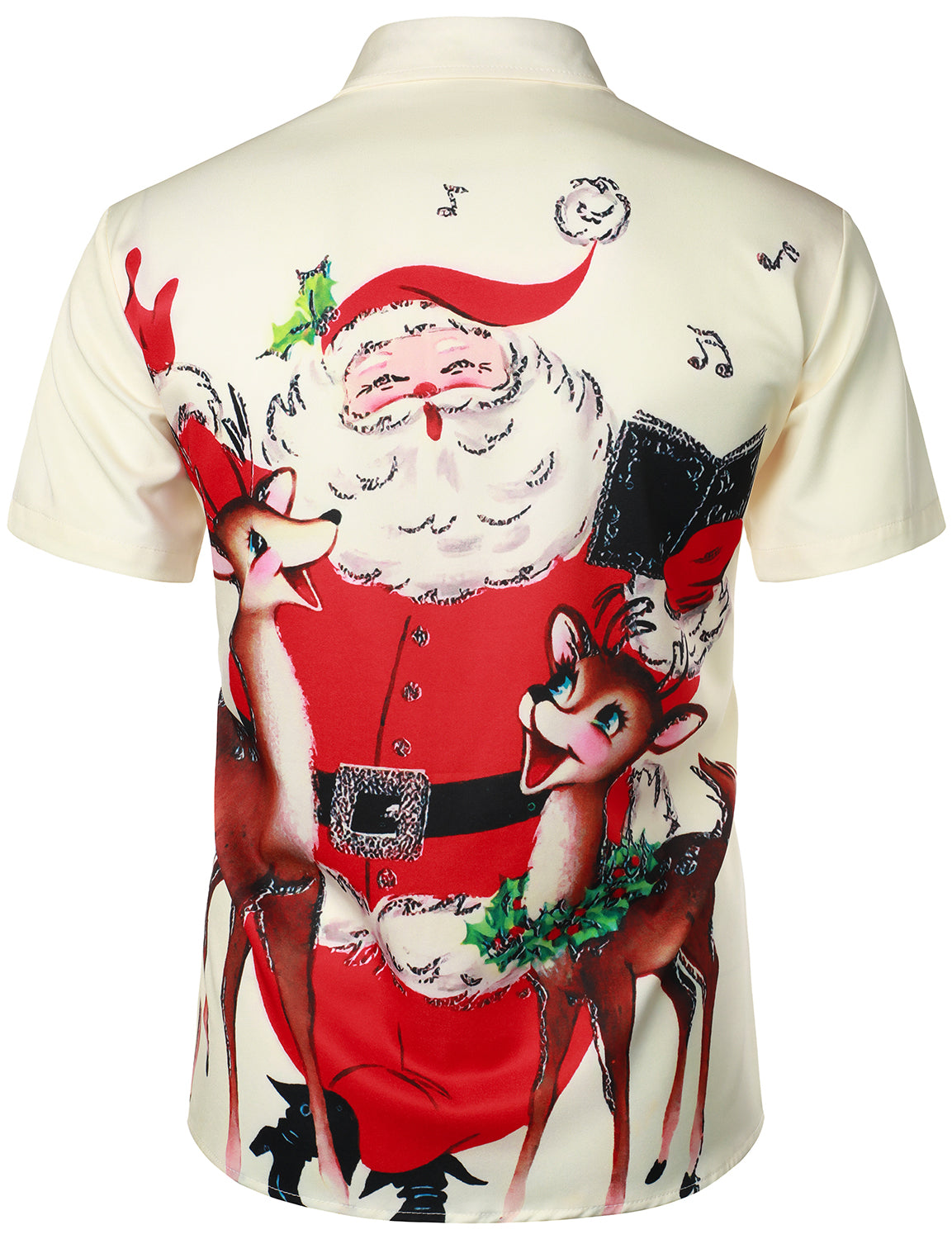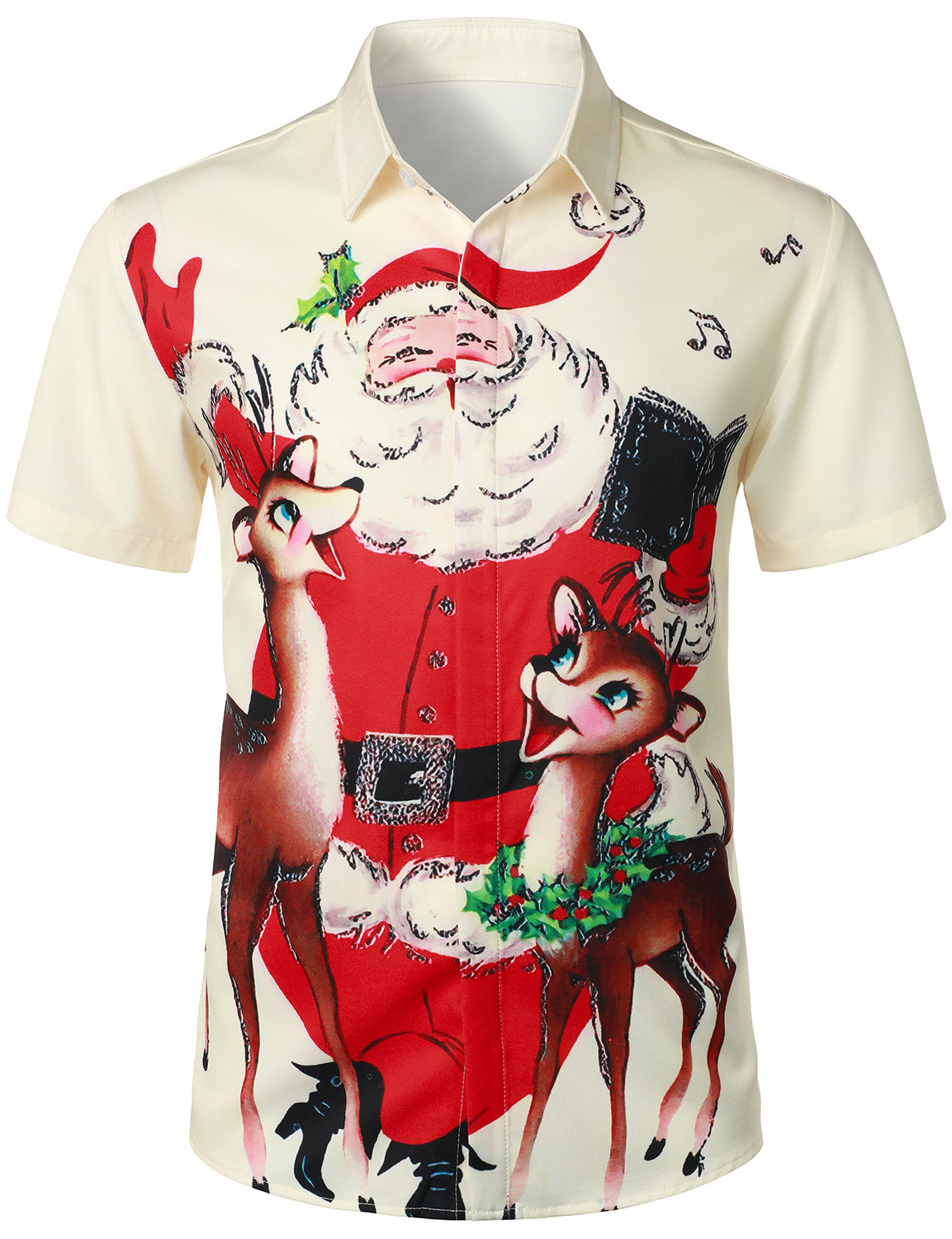 Men's Beige Vintage Santa Claus Elk Print Xmas Short Sleeve Christmas Shirt