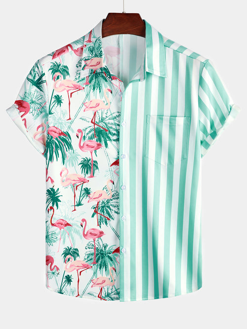 Men's Flamingo & Striped Patchwork Pocket Short Sleeve Shirt