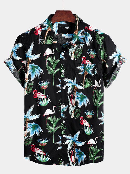 Men's Black Flamingo Print Cotton Hawaiian Short Sleeve Shirt