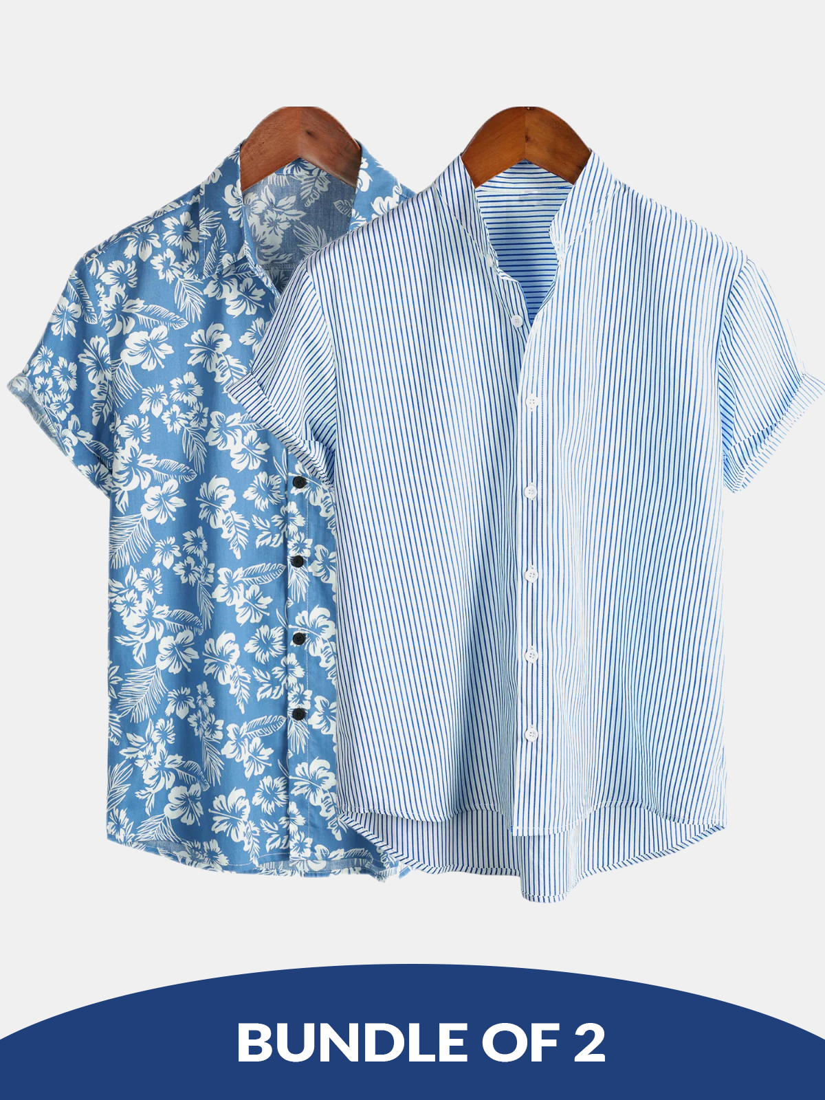 Bundle Of 2 | Men's Blue Cotton Button Up Short Sleeve Shirt
