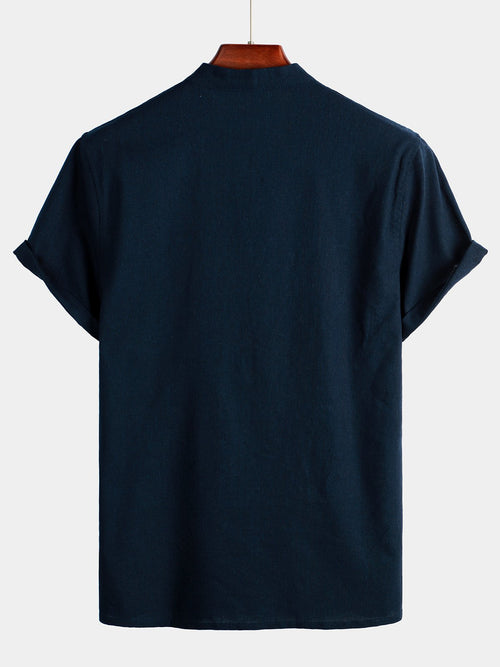 Men's Solid Color Stand Collar Half Button Pocket Front Linen & Cotton Shirt
