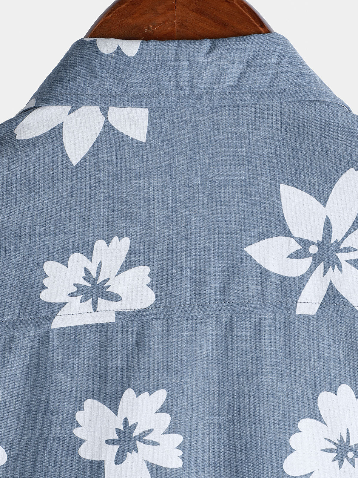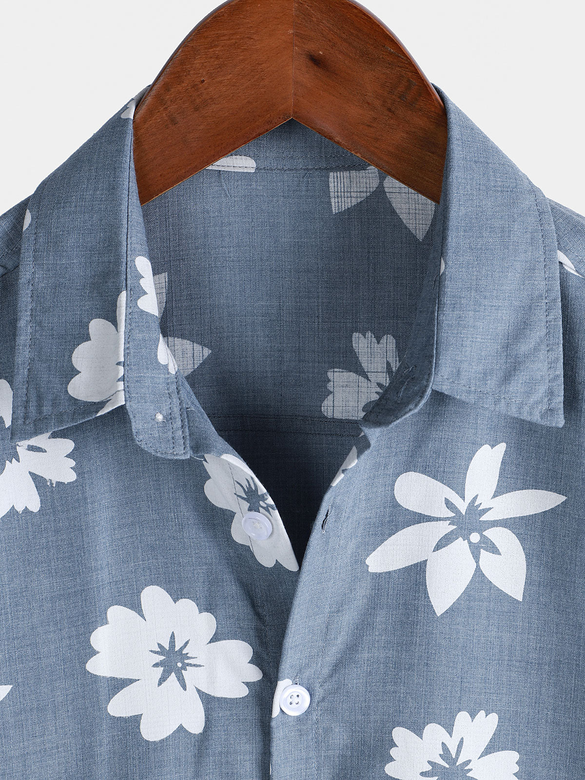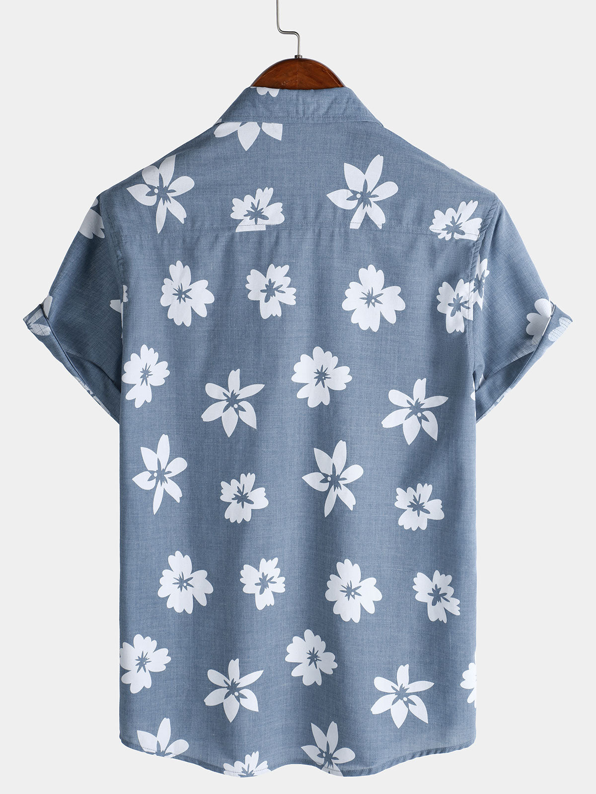 Men's Blue Hawaiian Floral Print Short Sleeve Summer Cotton Shirt