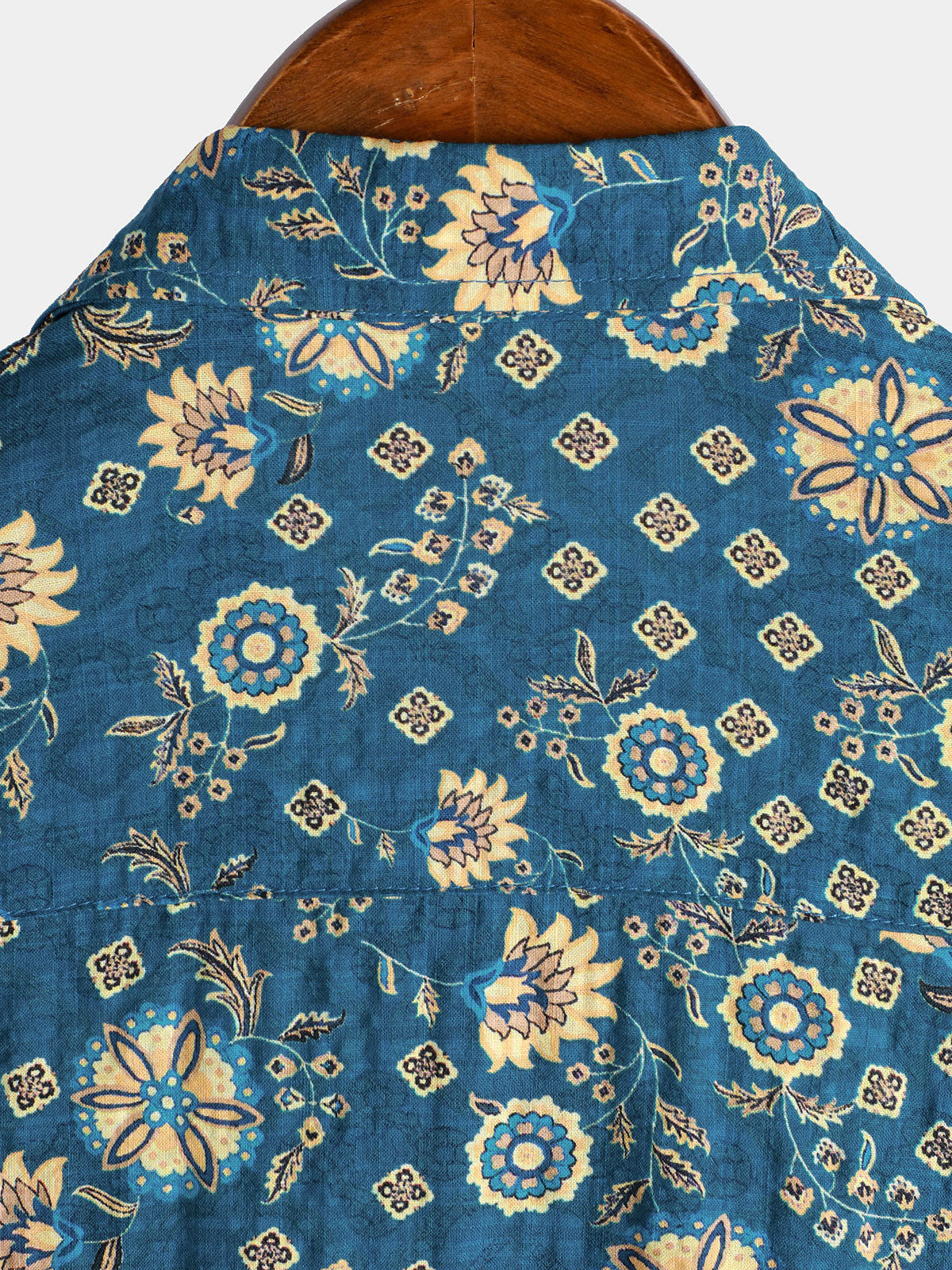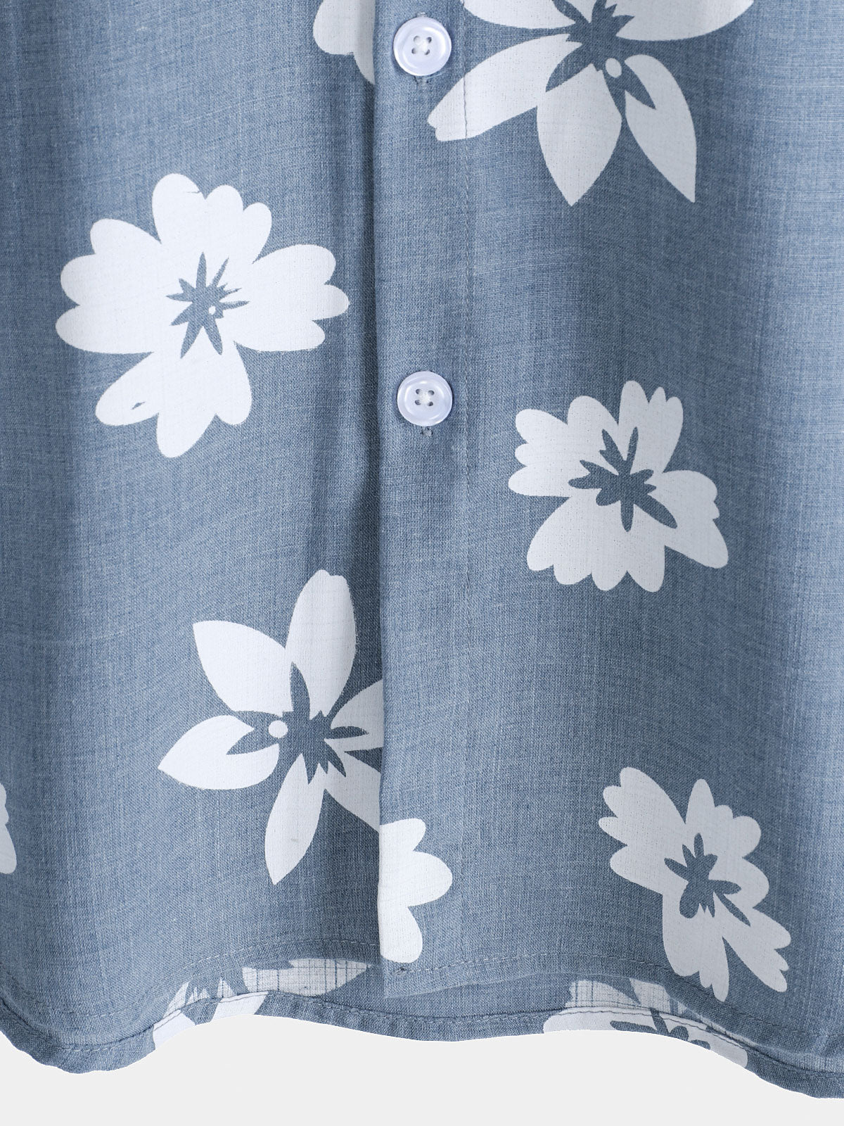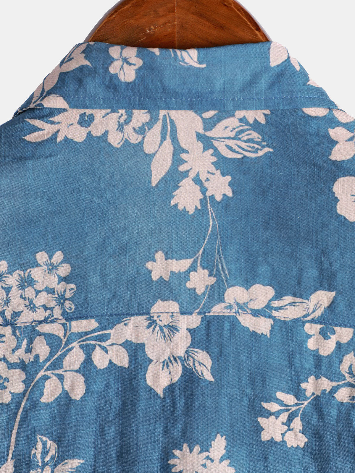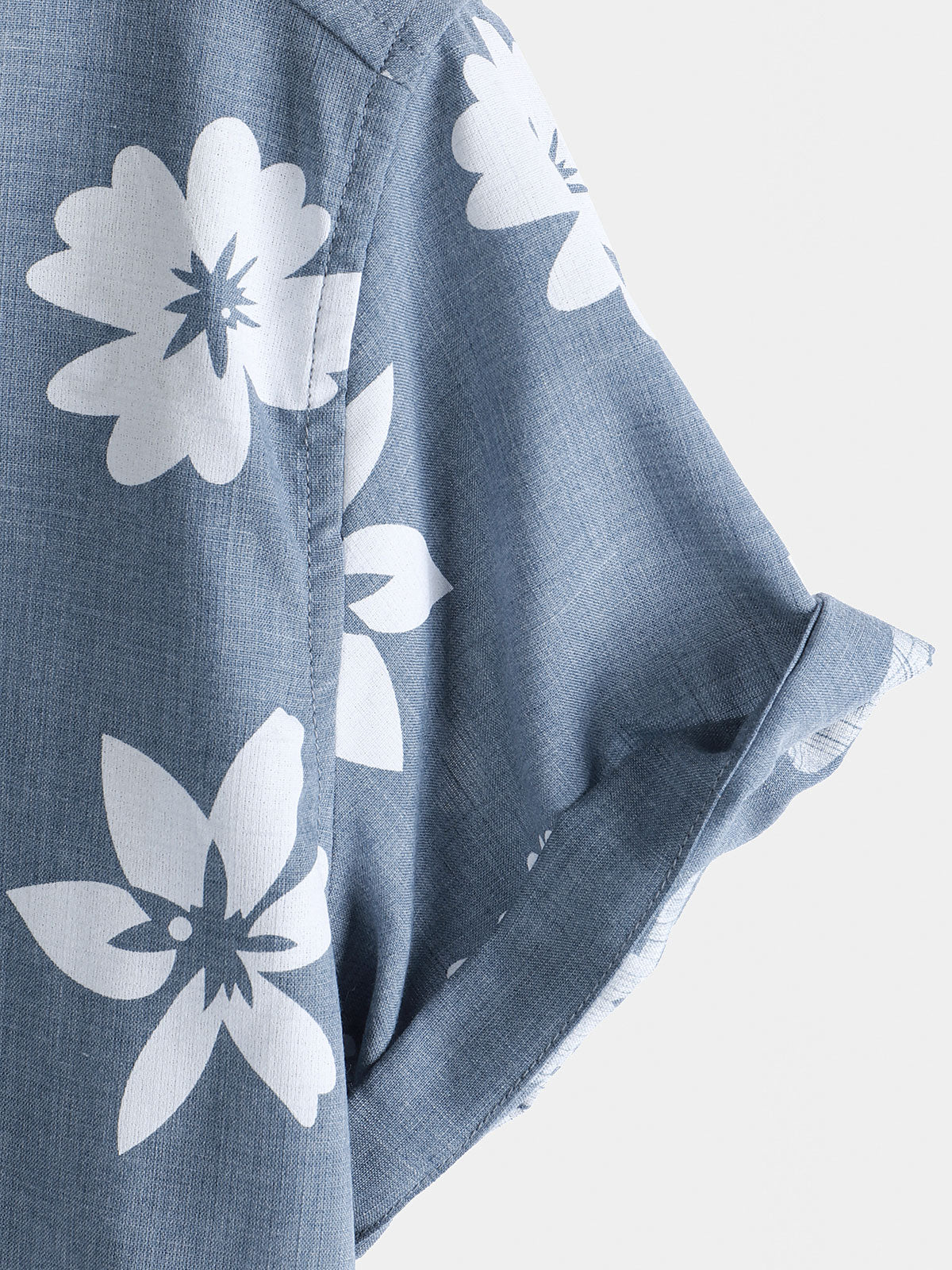 Men's Blue Hawaiian Floral Print Short Sleeve Summer Cotton Shirt