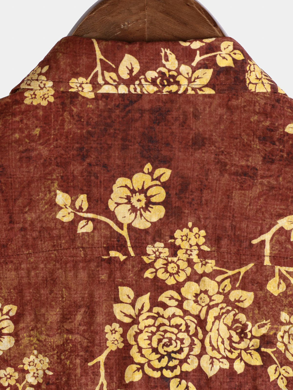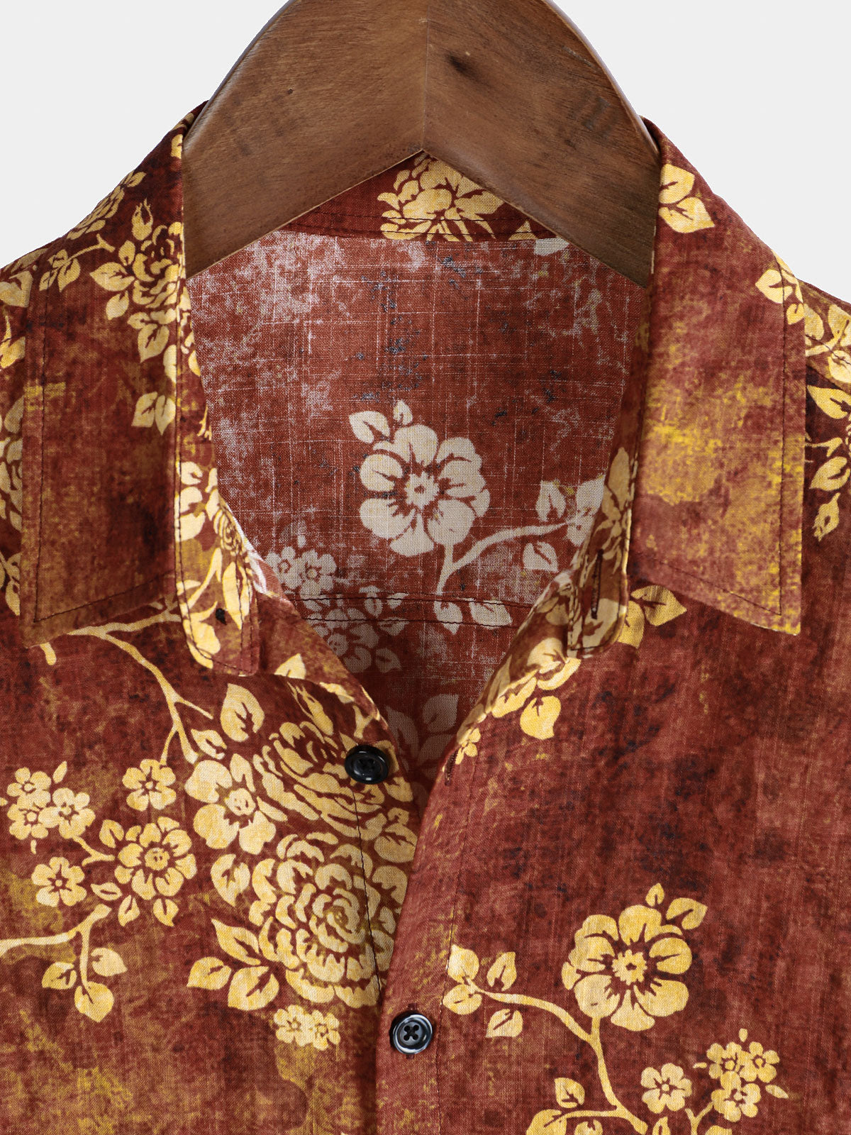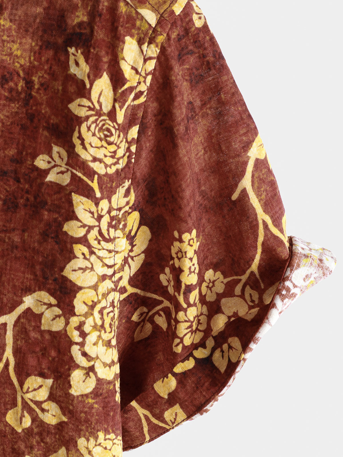 Men's Floral Print Vintage Holiday Brown Hawaiian Short Sleeve Shirt