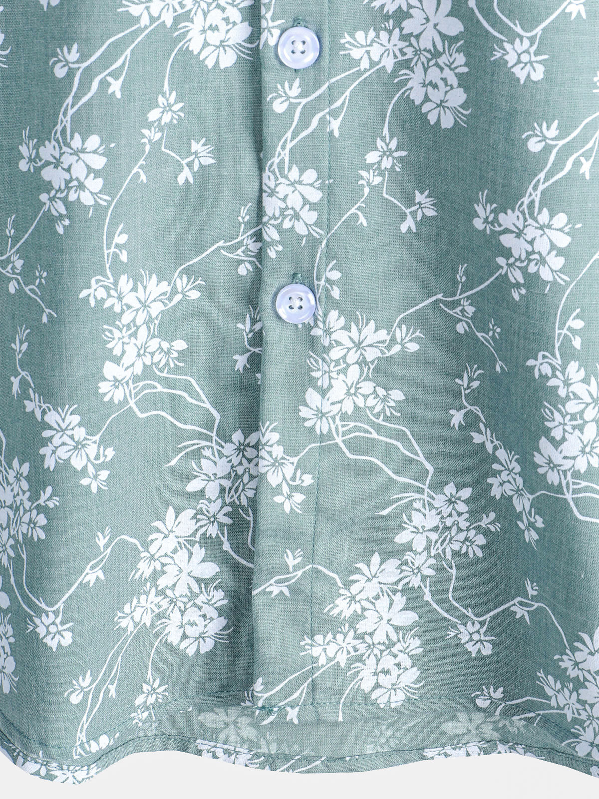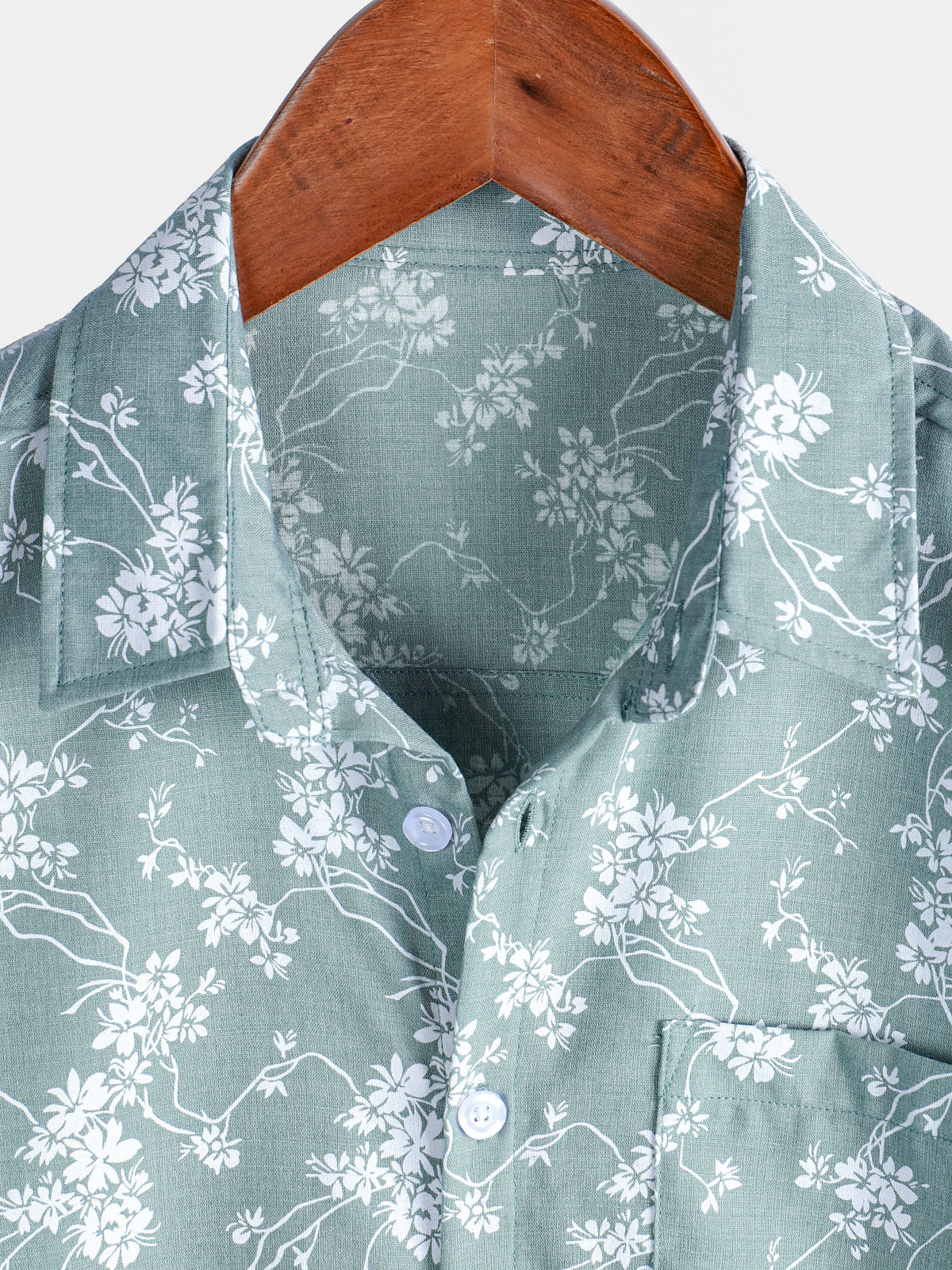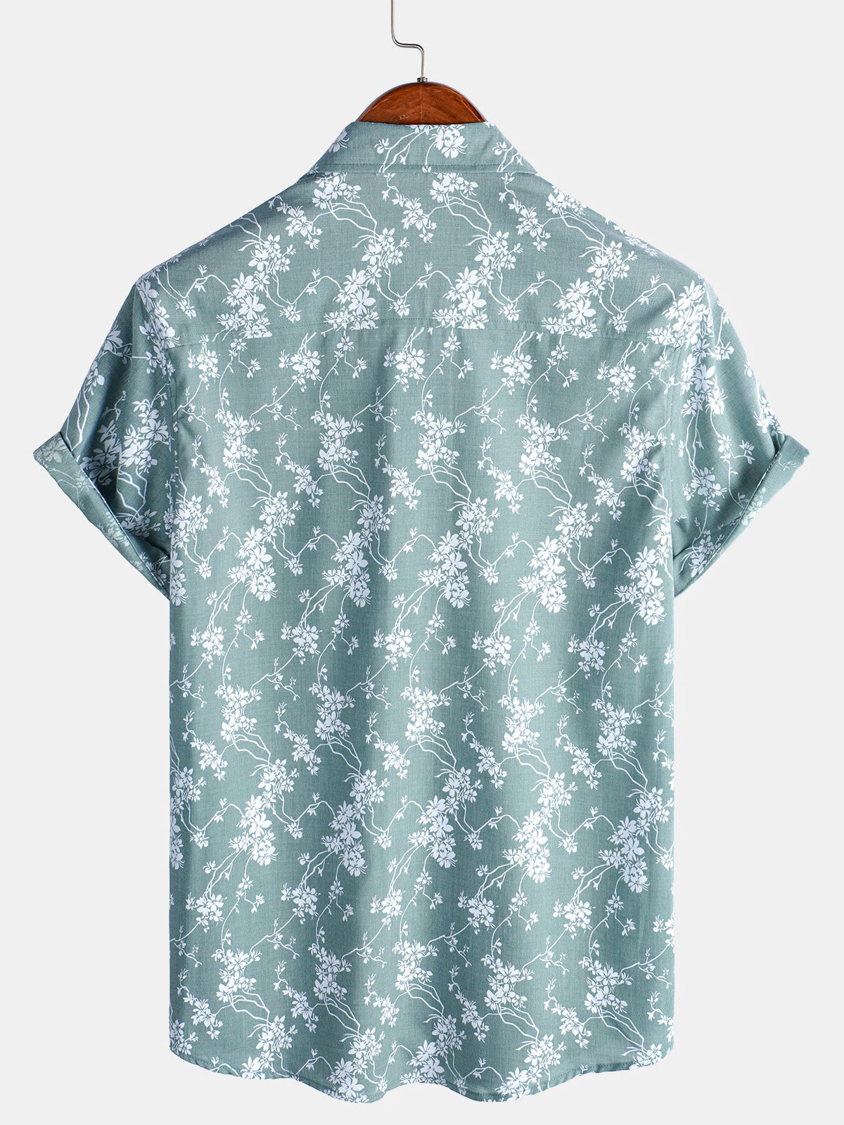Men's Short Sleeve Casual Holiday Vintage Floral Button Green Cotton Shirt