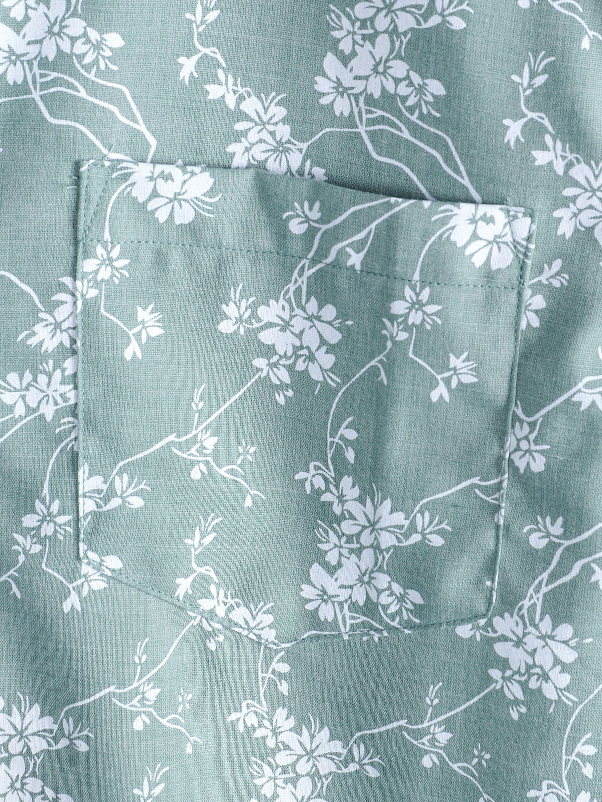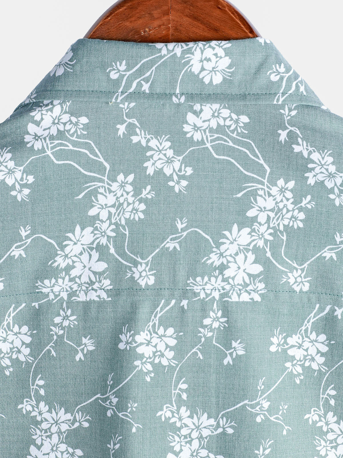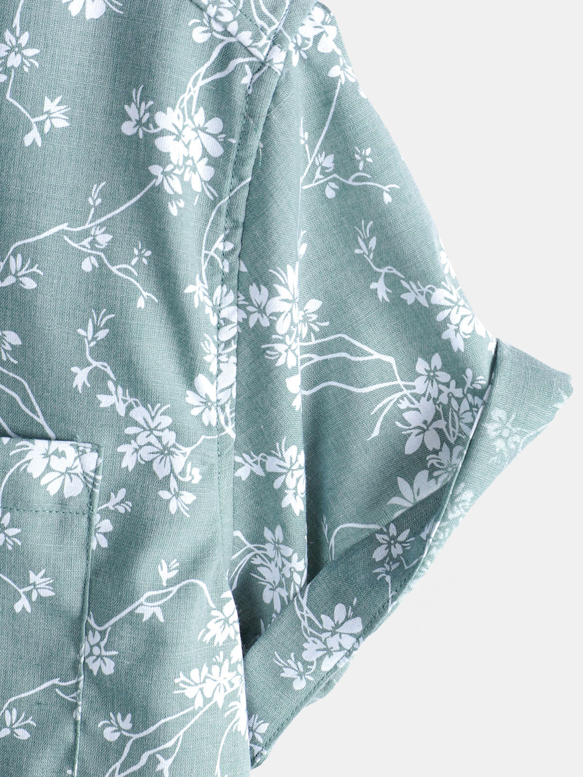 Men's Short Sleeve Casual Holiday Vintage Floral Button Green Cotton Shirt