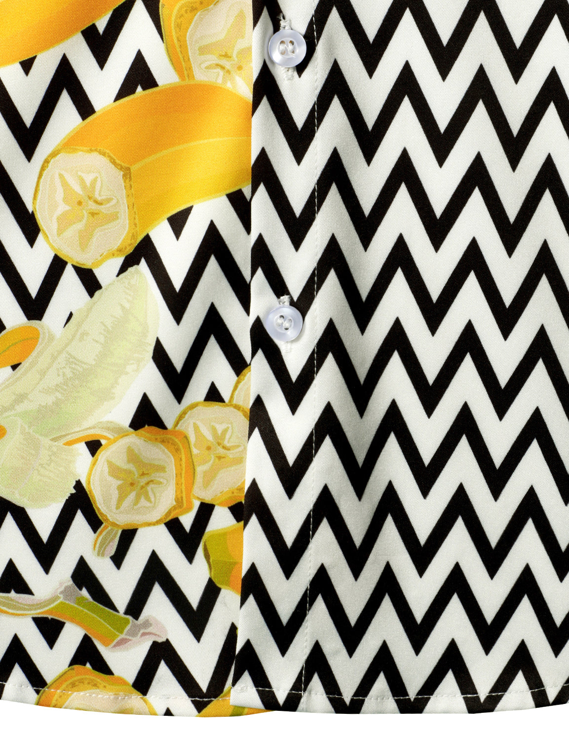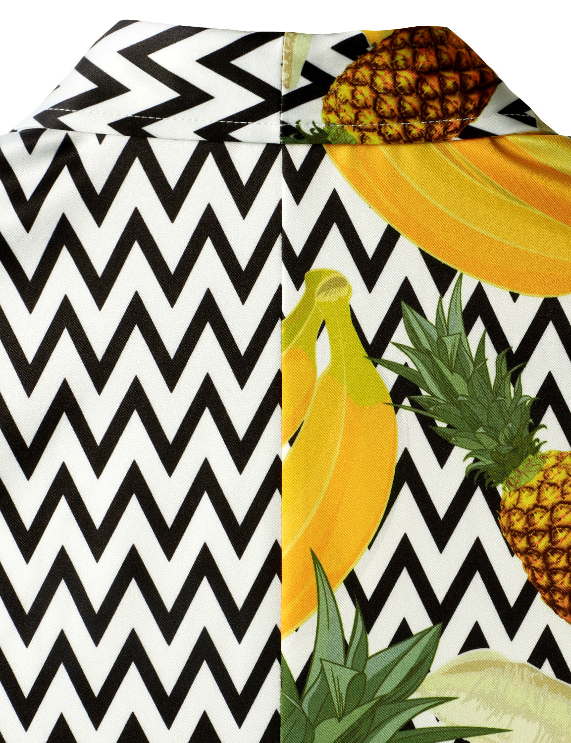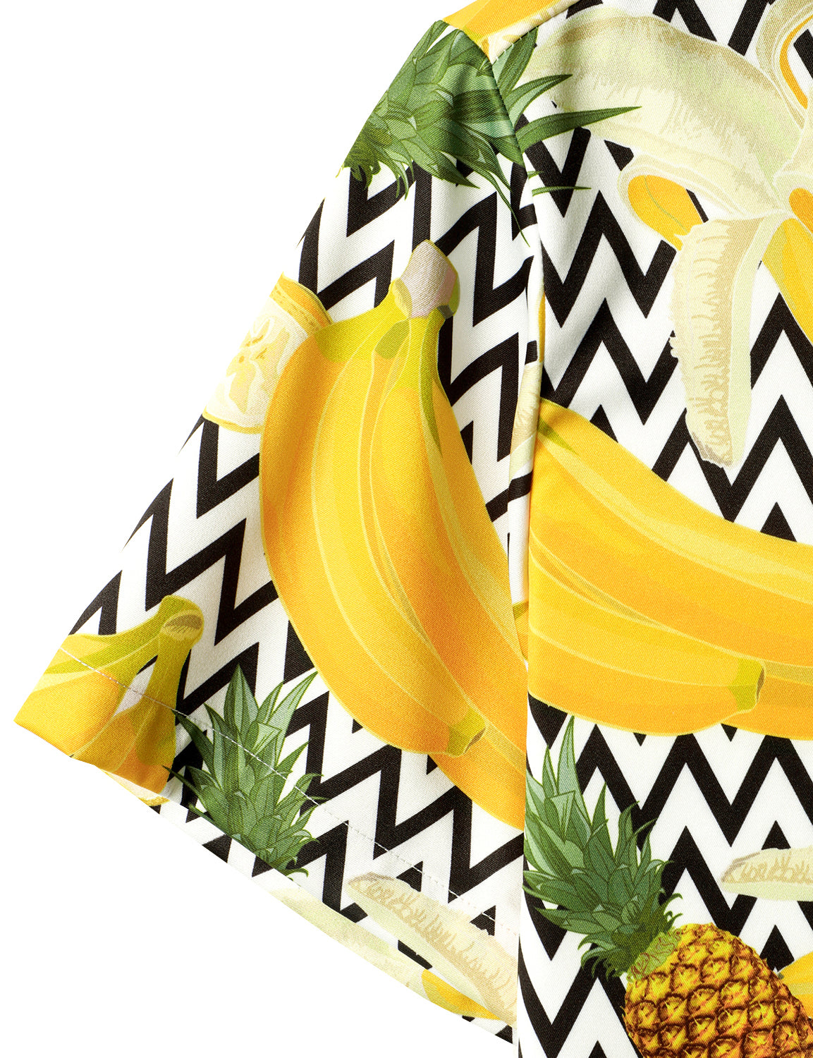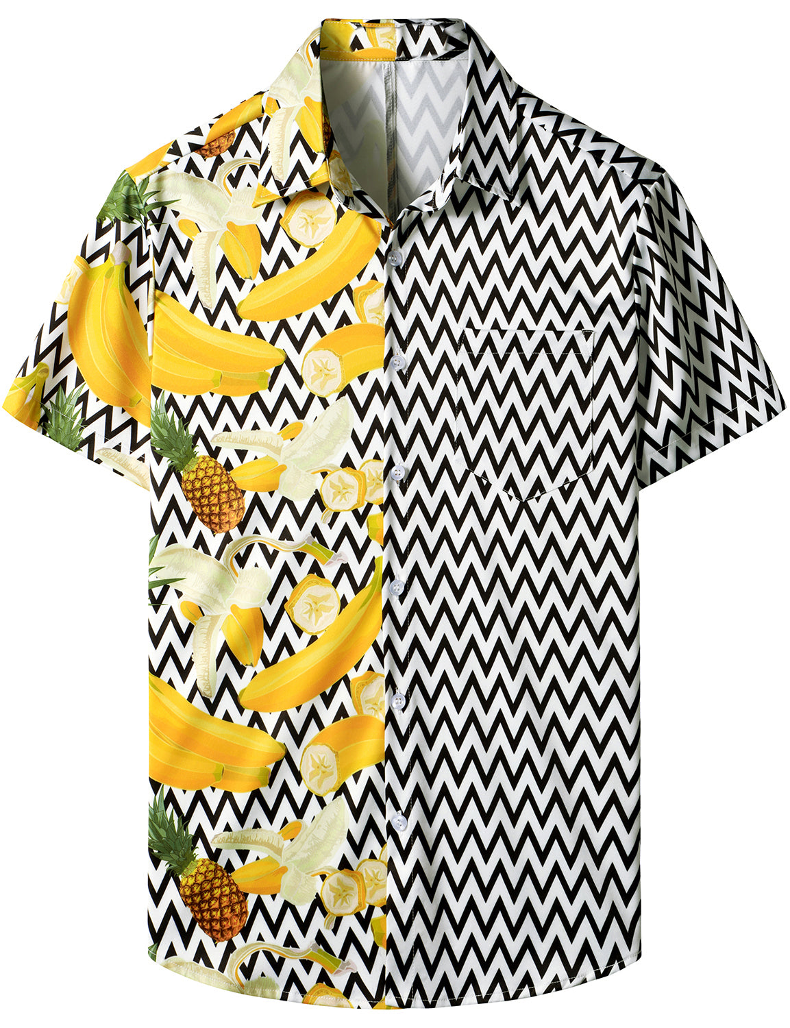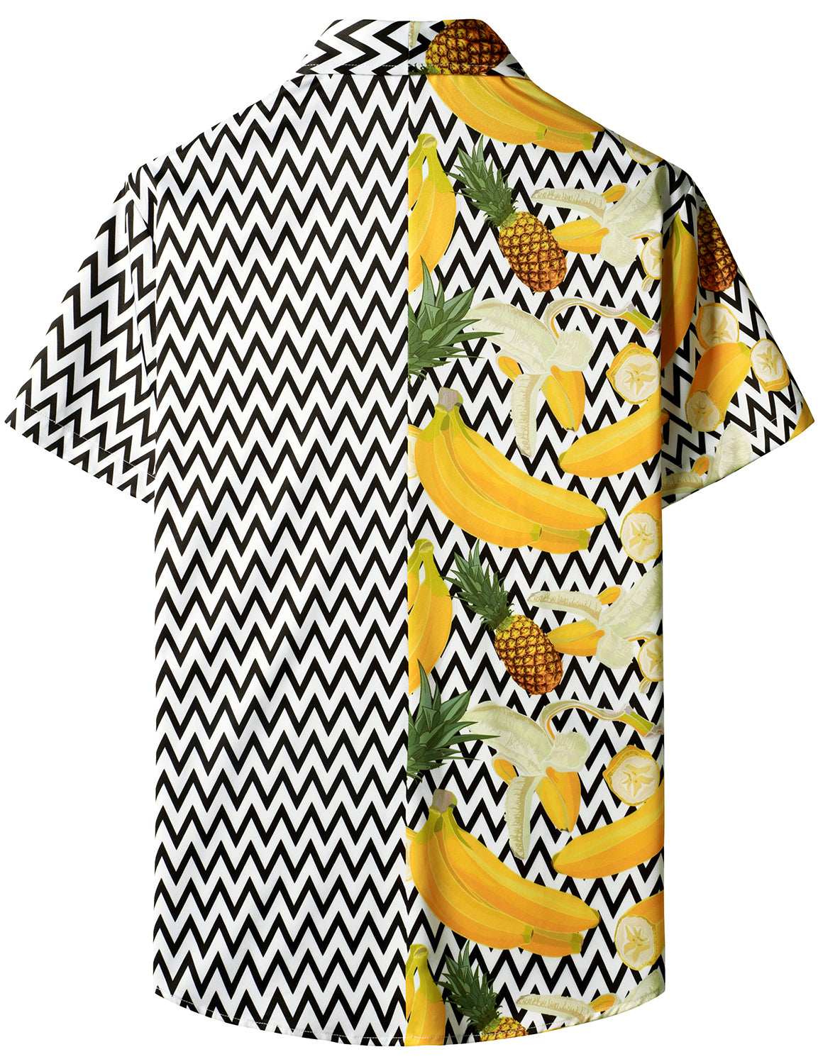 Men's Banana Pineapple Black and White Wave Print Pocket Vacation Tropical Fruit Short Sleeve Summer Vacation Beach Shirt