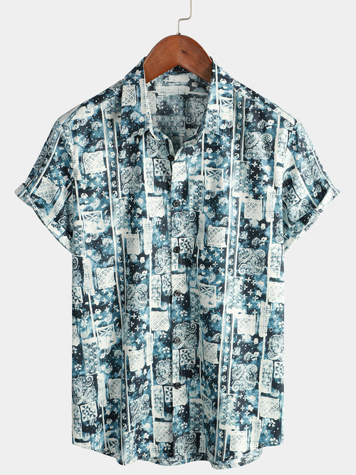 Men's Blue Cocktail Print Casual Long Sleeve Cotton Holiday Parties Shirt