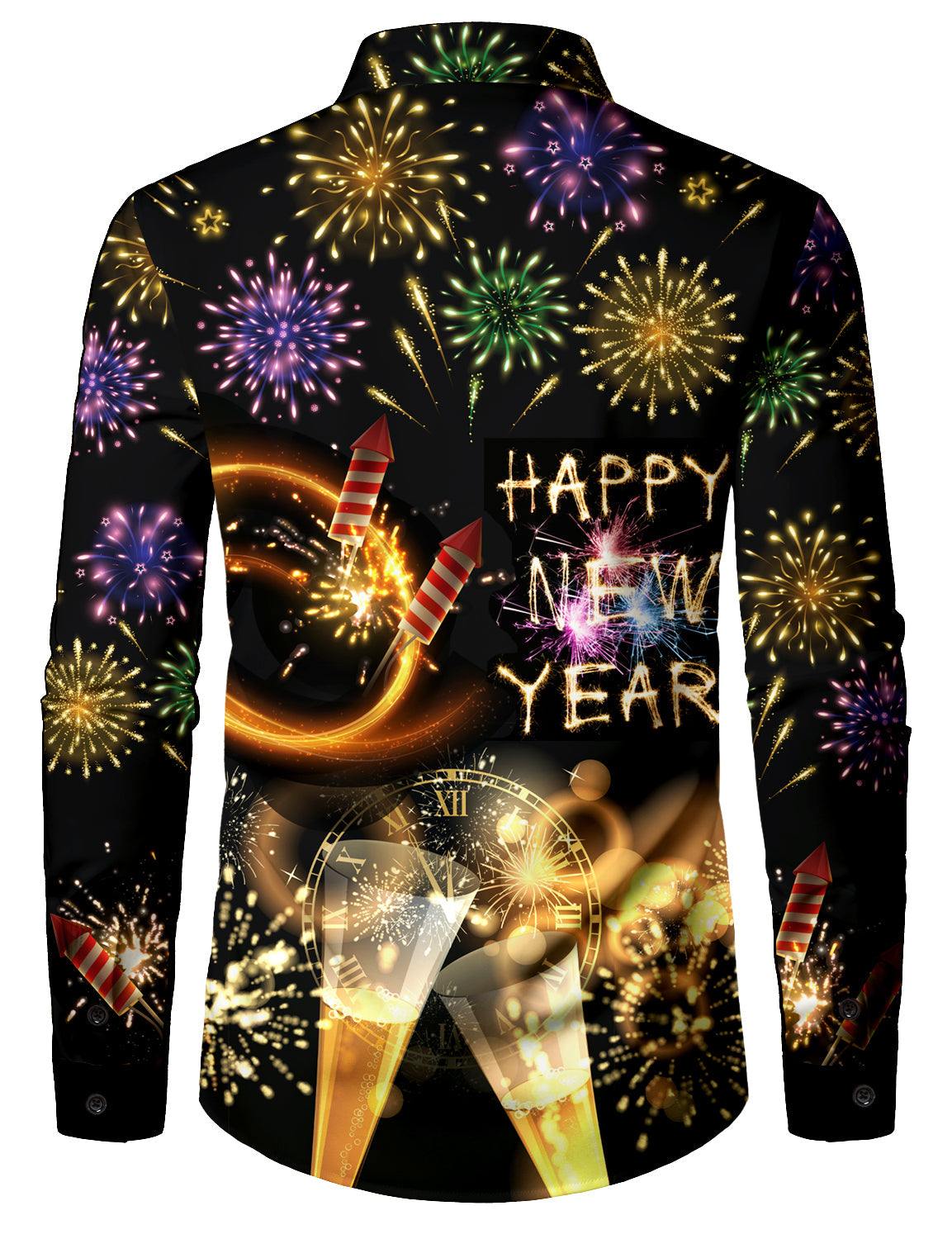Men's Happy New Year Fireworks Print Long Sleeve Holiday Shirt