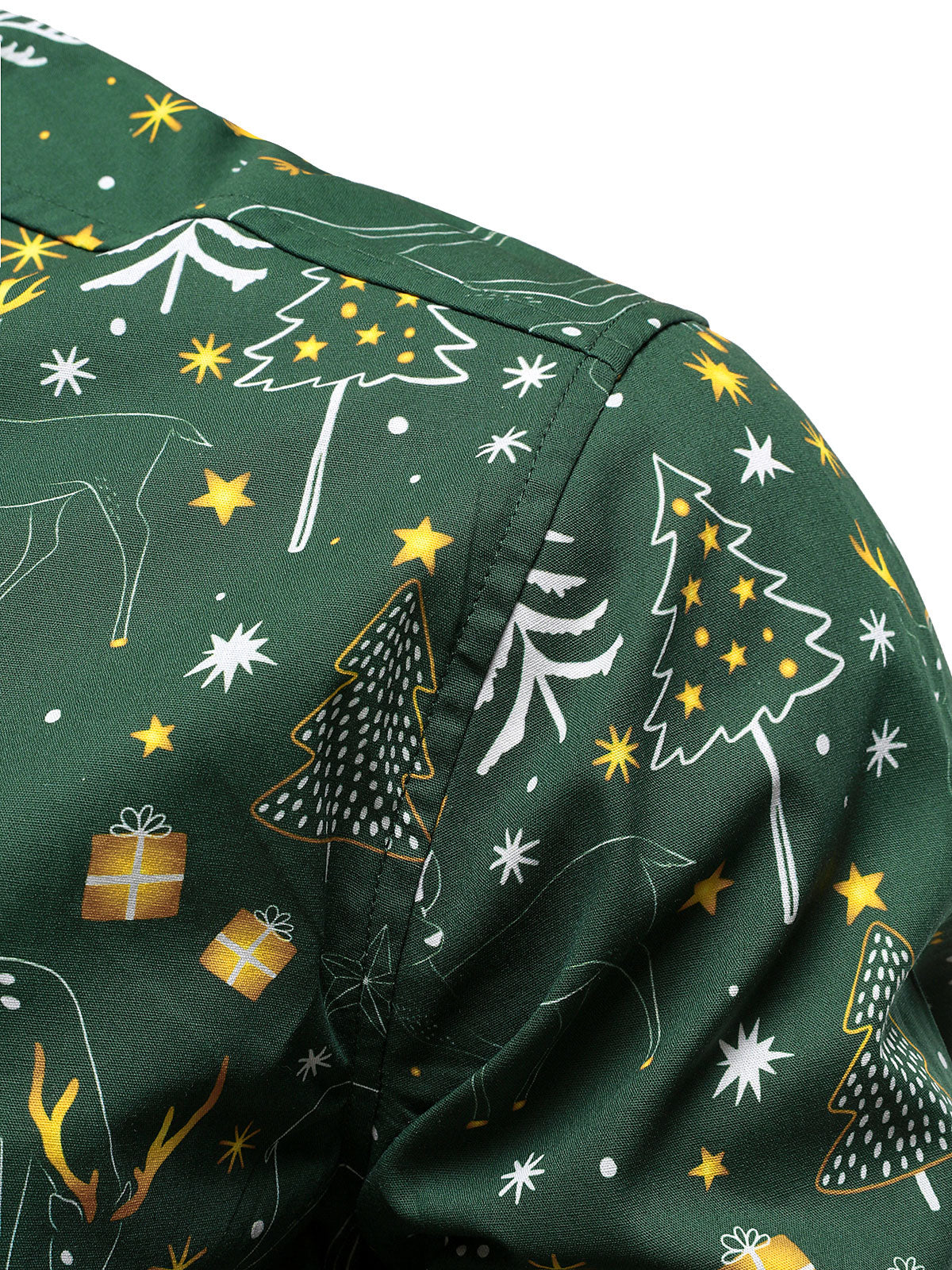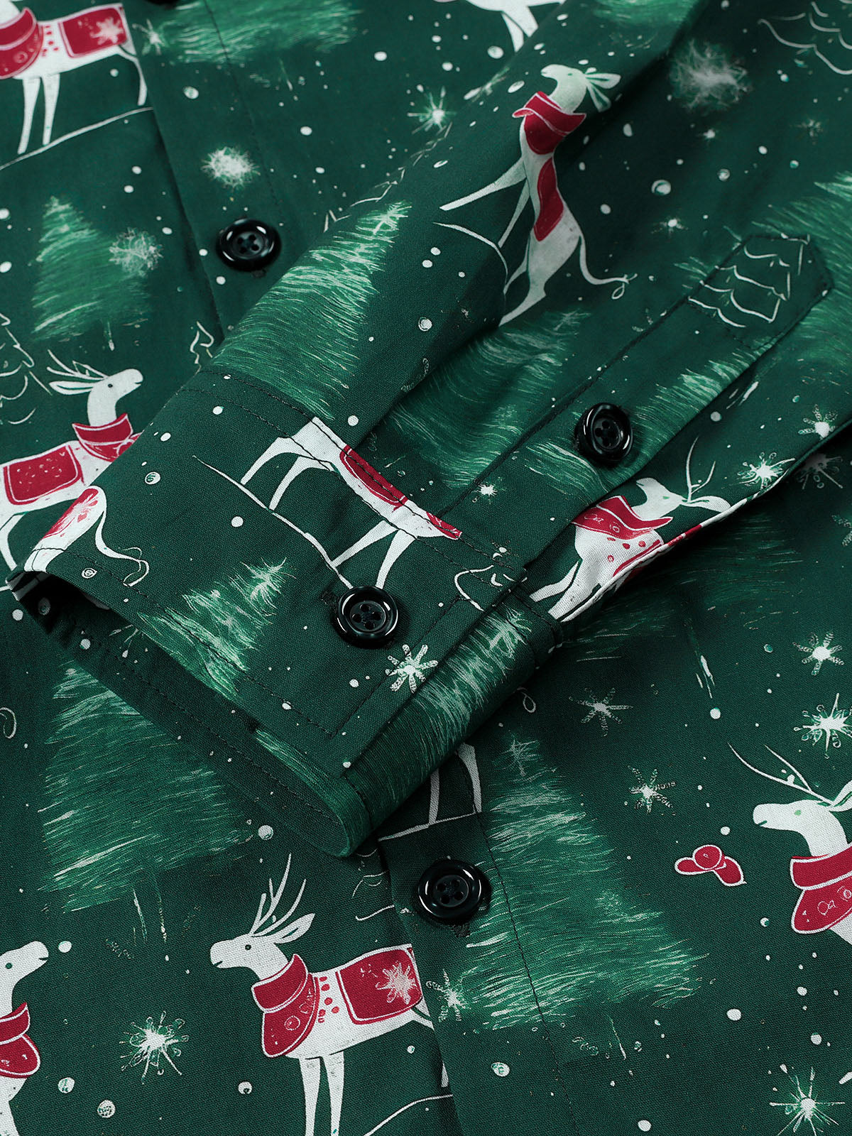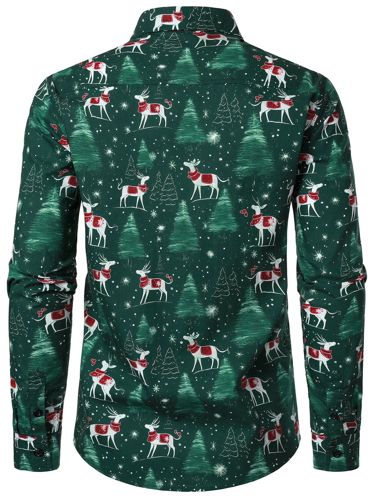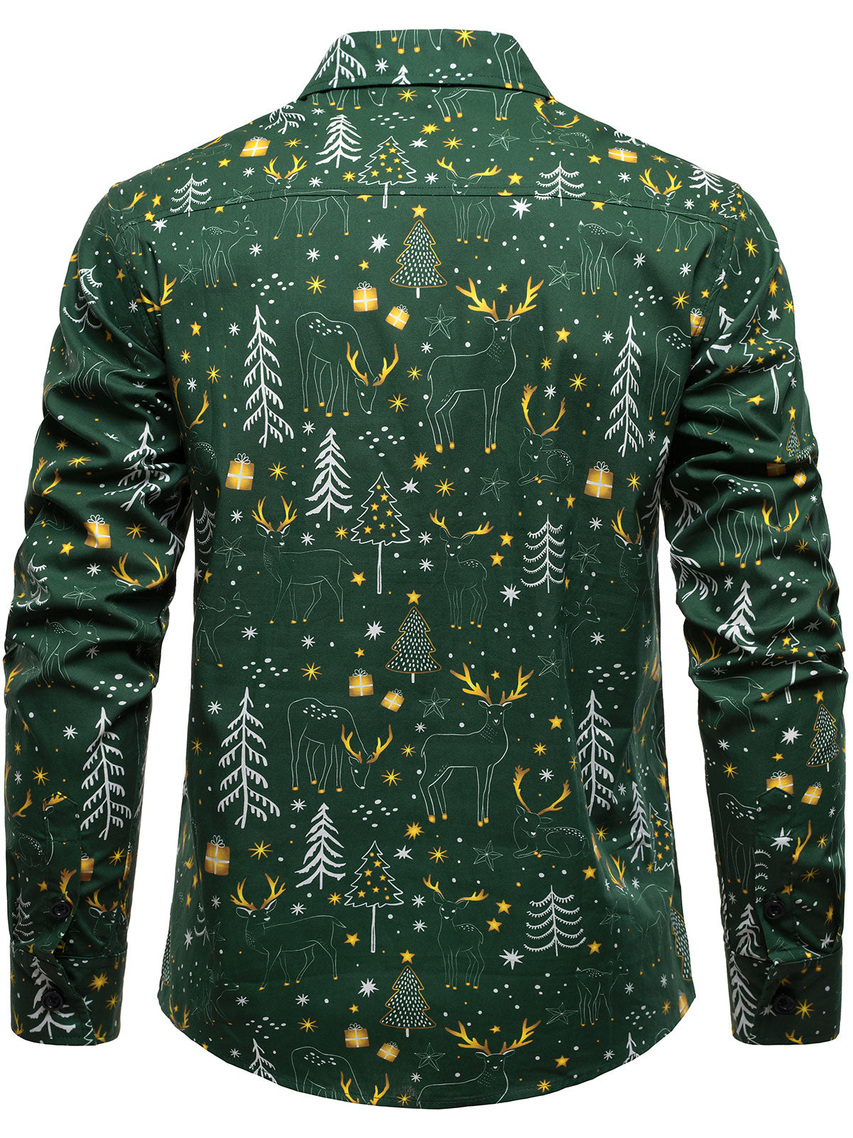 Men's Christmas Tree Reindeer Print Long Sleeve Cotton Shirt