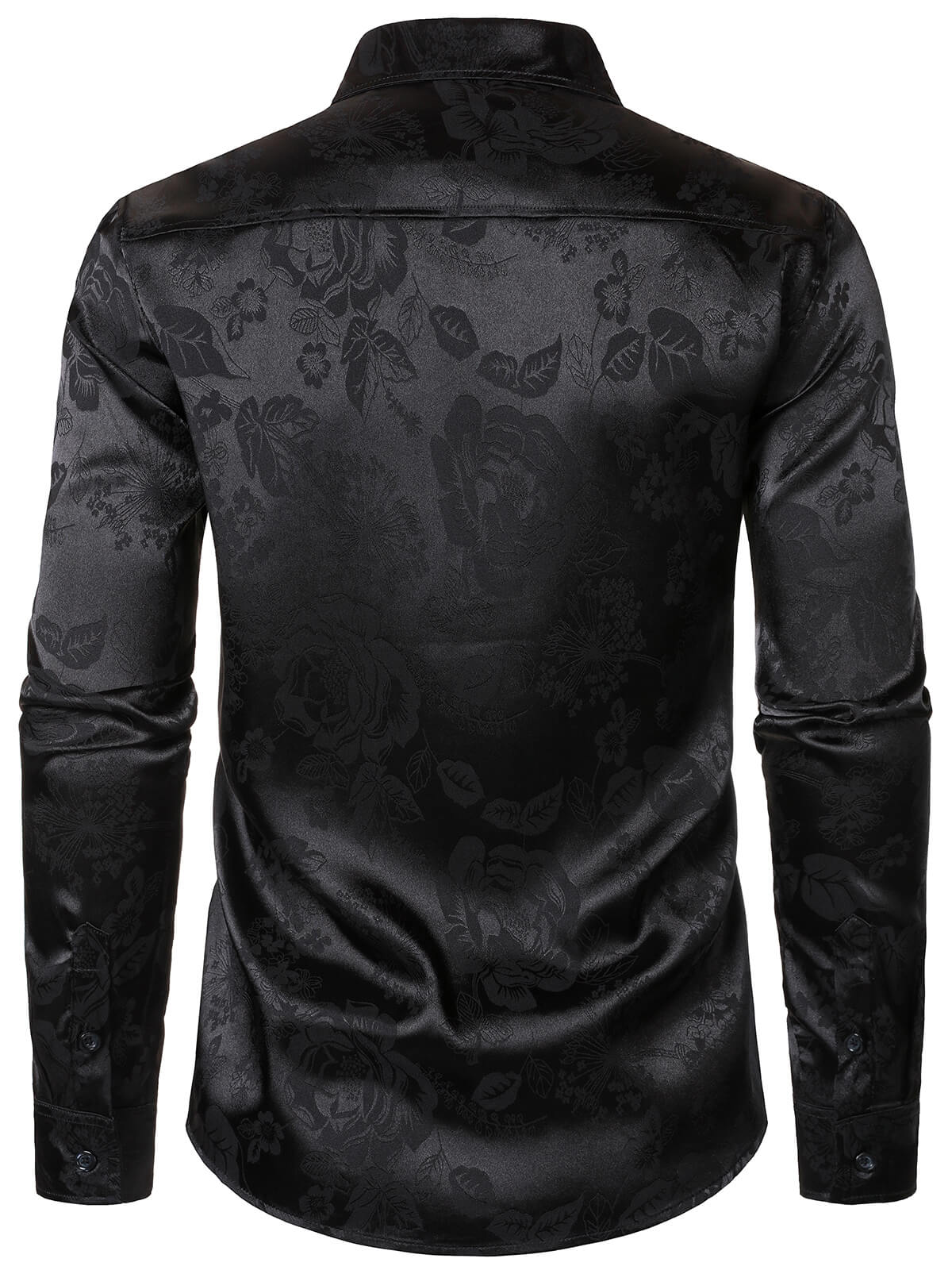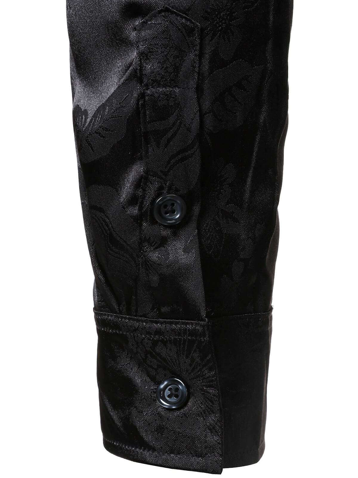 Men's Floral Jacquard Shiny Satin Black Long Sleeve Dress Shirt