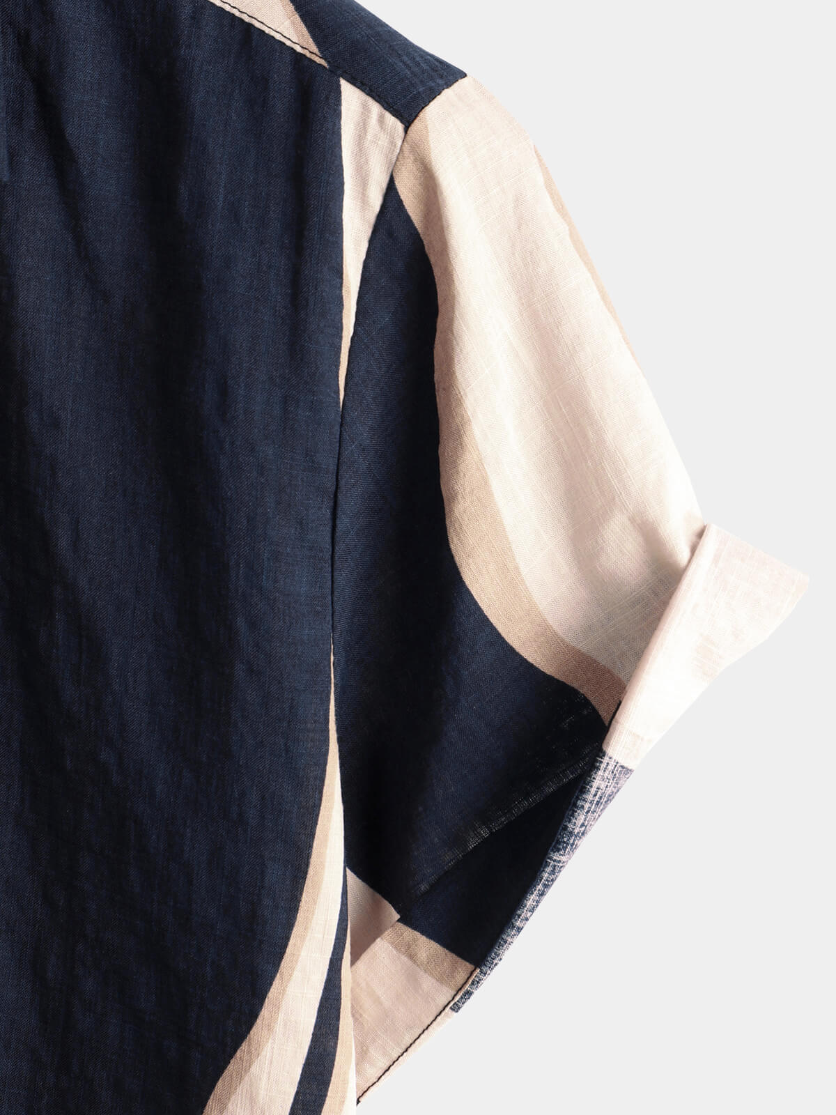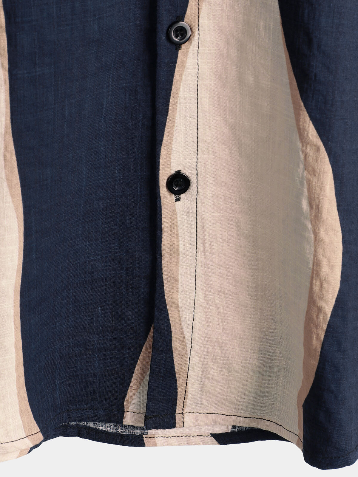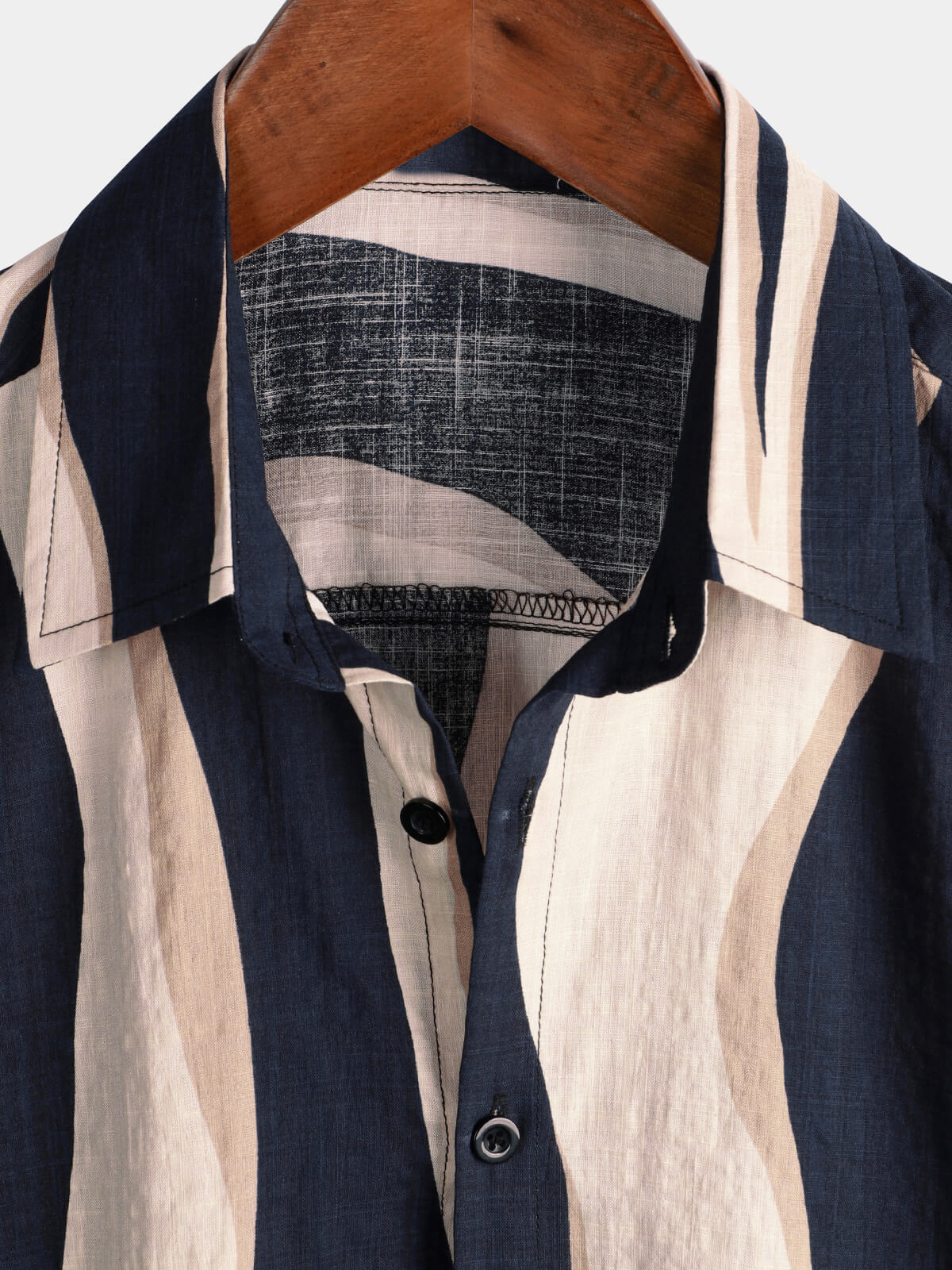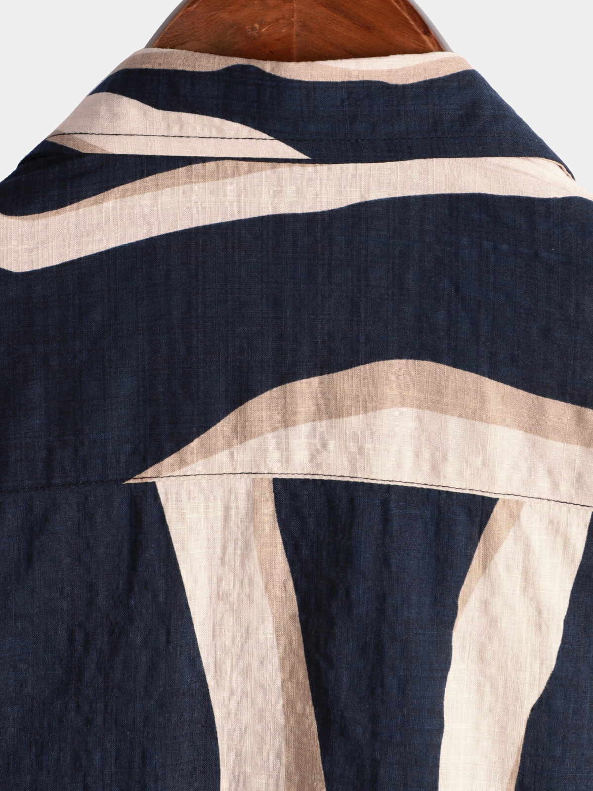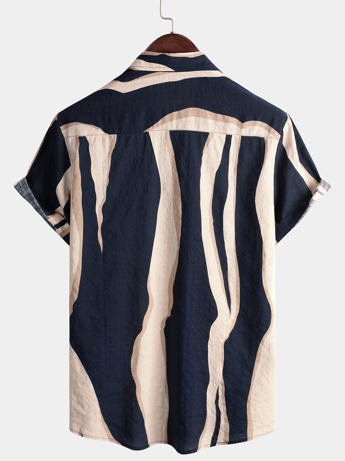 Men's Retro Casual Striped Summer Vacation Navy Blue Button Up Short Sleeve Shirt