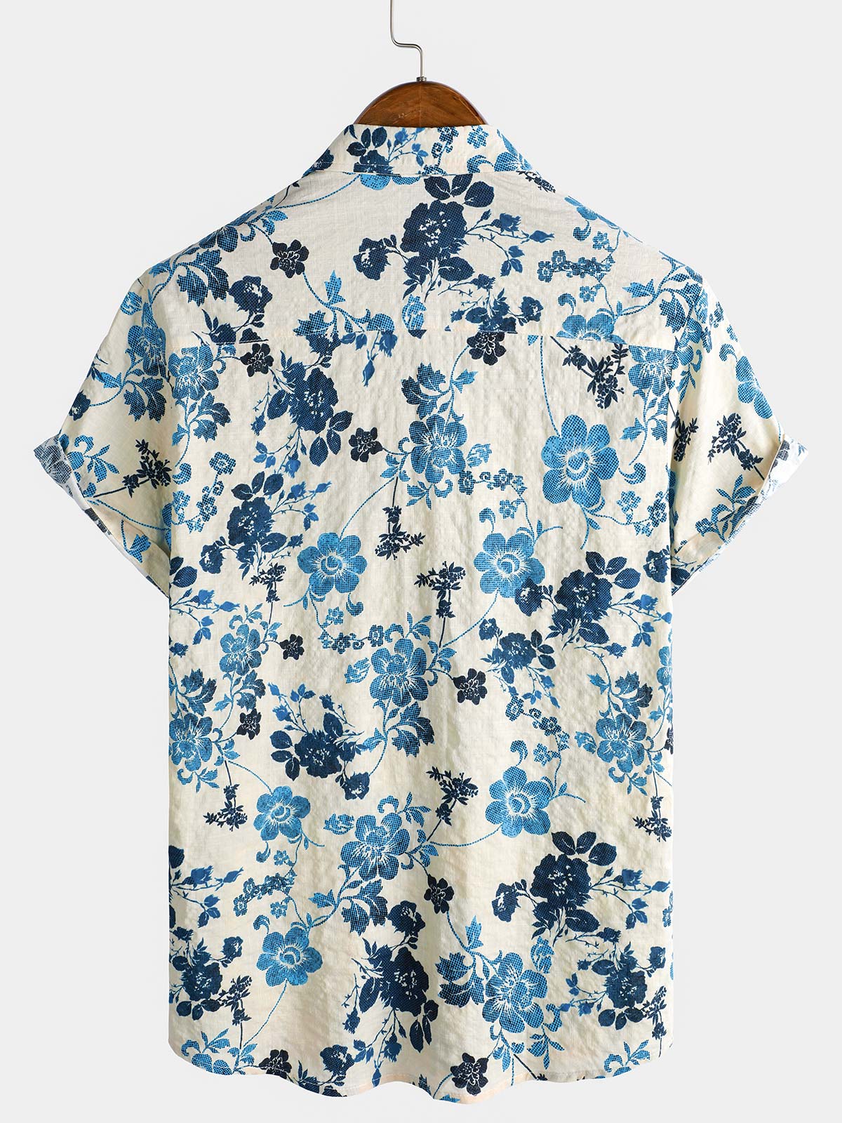 Men's Blue Hawaiian Floral Print Short Sleeve Summer Cotton Shirt