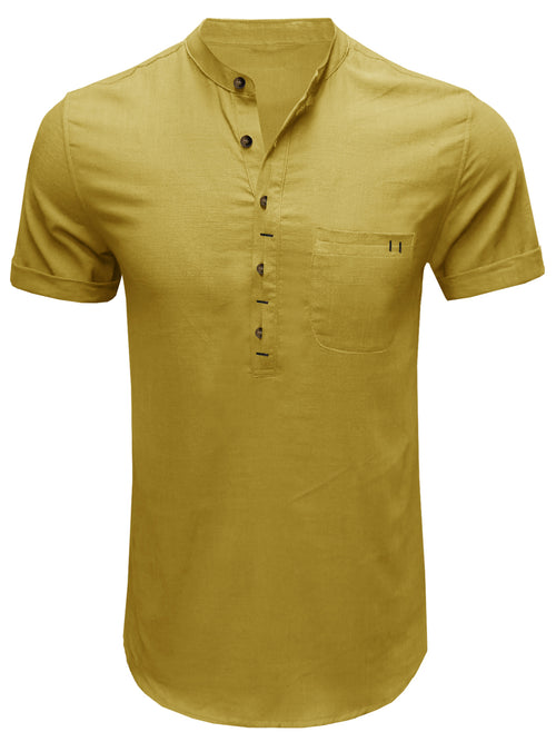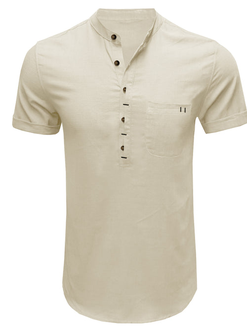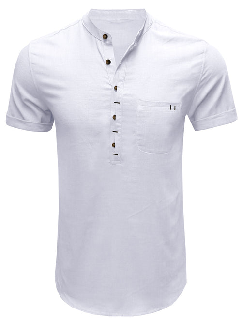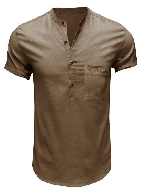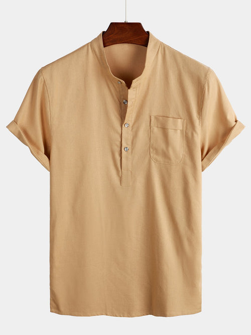 Men's Solid Color Stand Collar Half Button Pocket Front Linen & Cotton Shirt