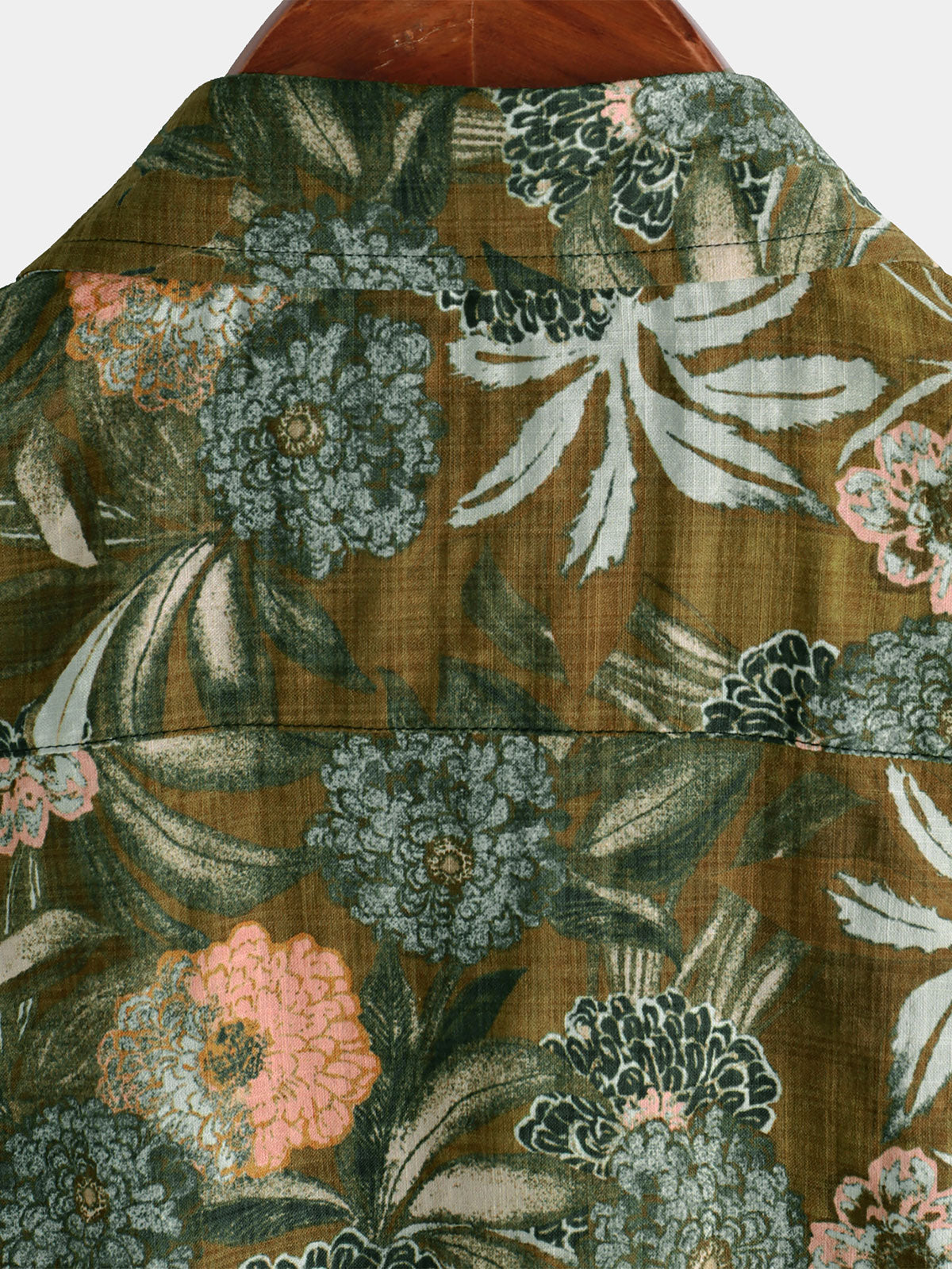 Men's Floral Print Vintage Holiday Brown Hawaiian Short Sleeve Shirt