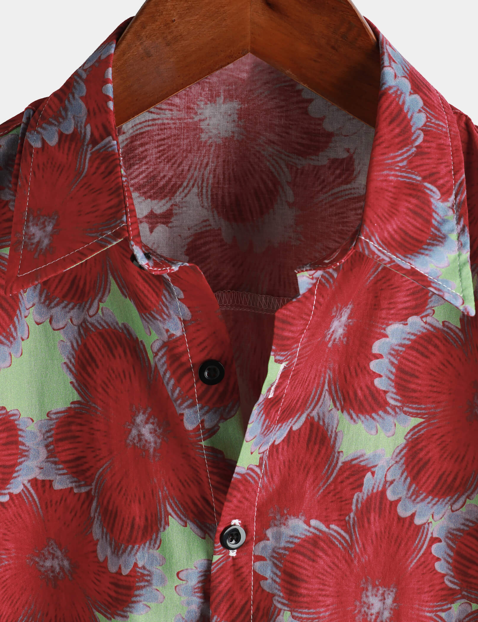 Men‘s 100% Cotton Hawaiian Red Floral Short Sleeve Button Summer Beach Shirt