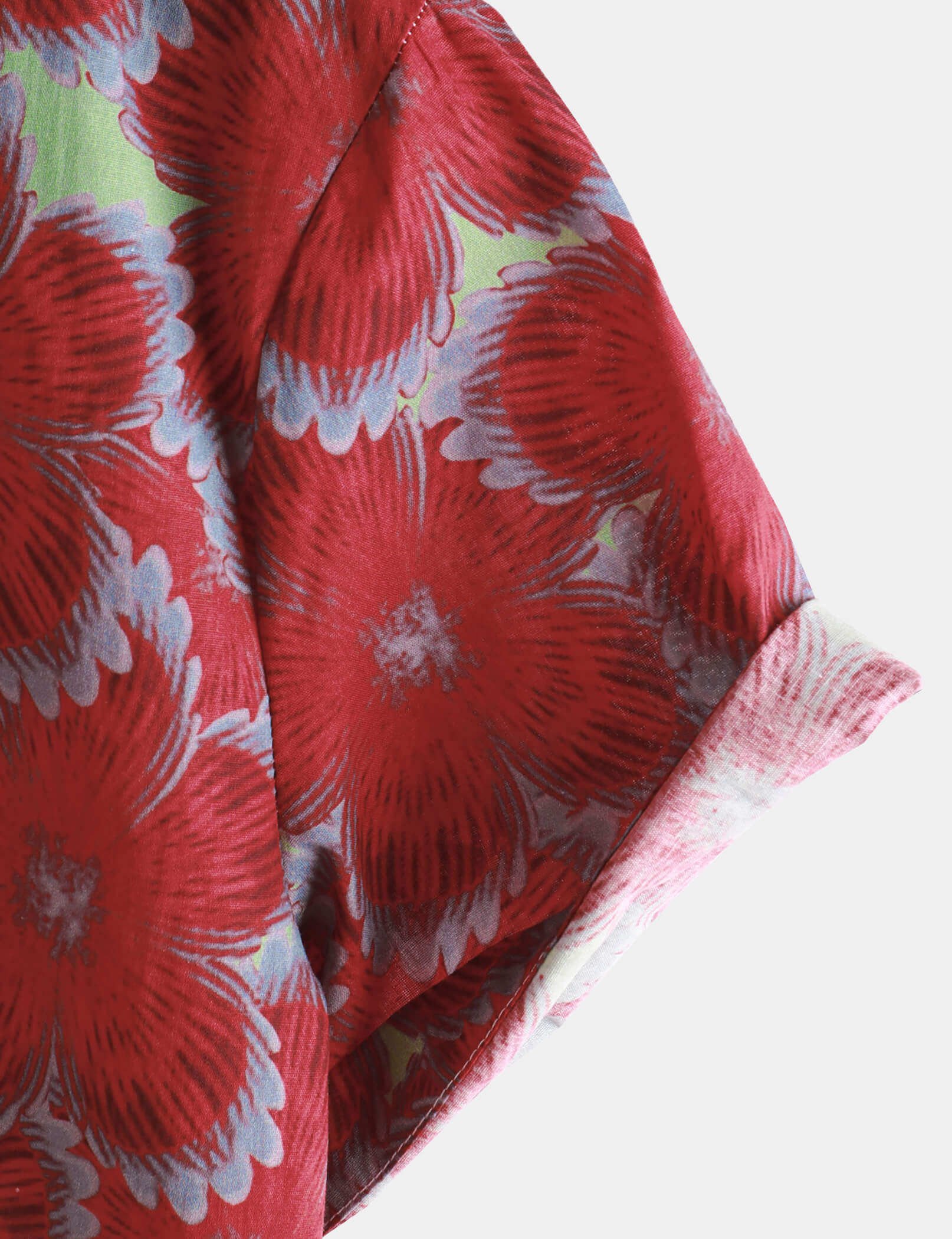 Men's Red Vintage Floral Summer Holiday Hawaiian Breathable Button Up Short Sleeve Shirt
