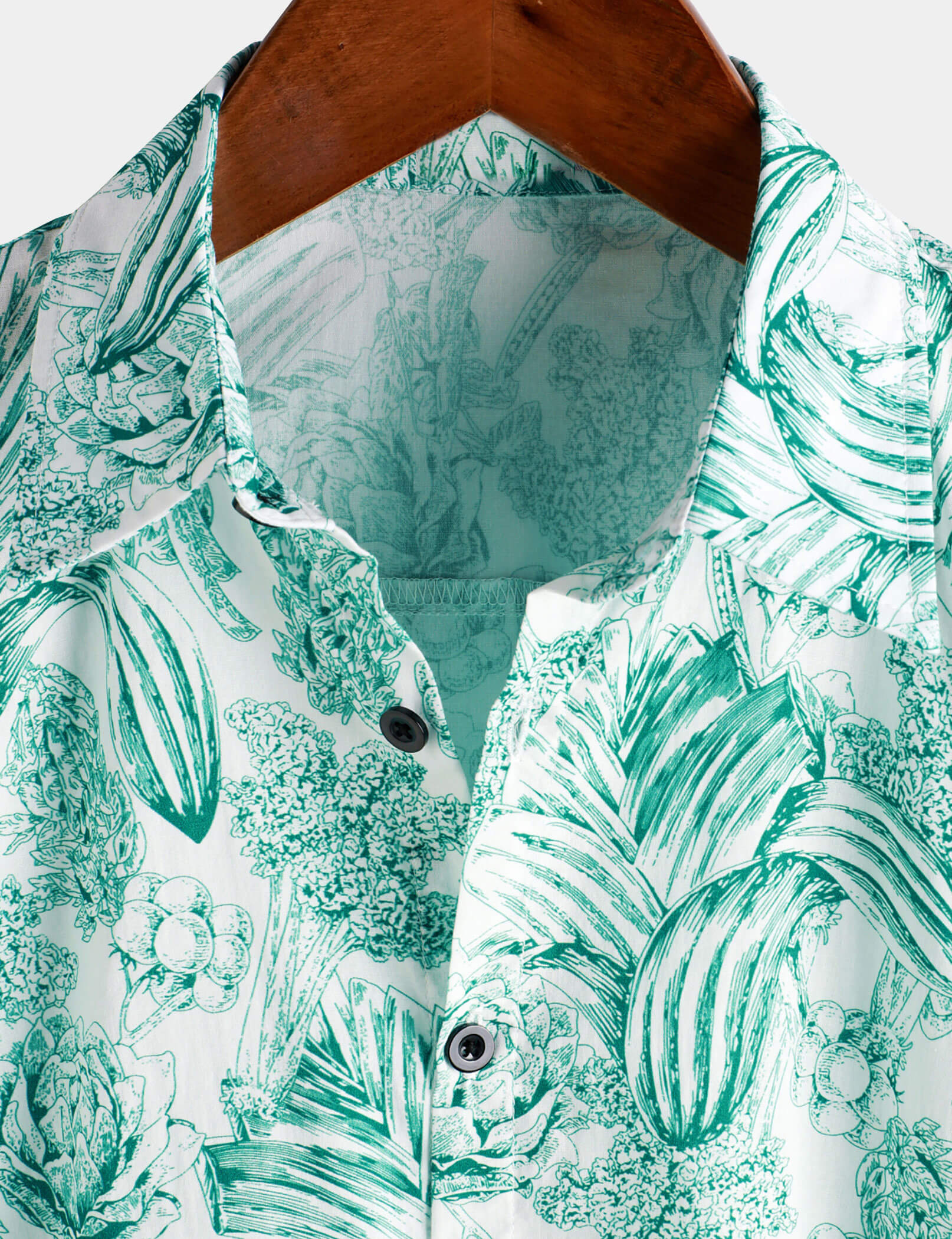 Men‘s 100% Cotton Green Floral Hawaiian Short Sleeve Button Shirt
