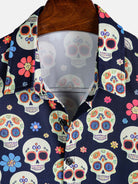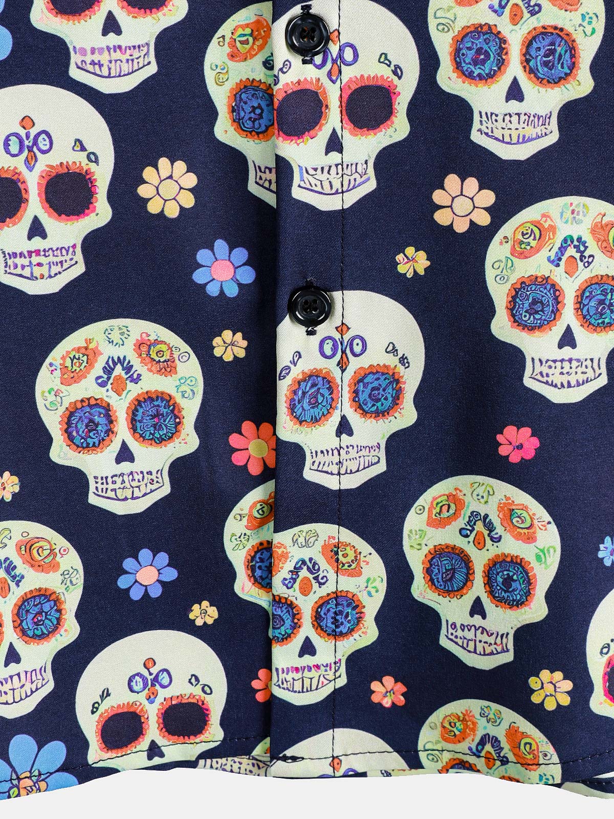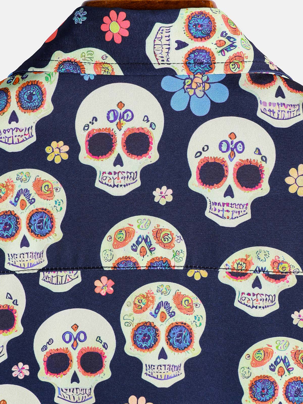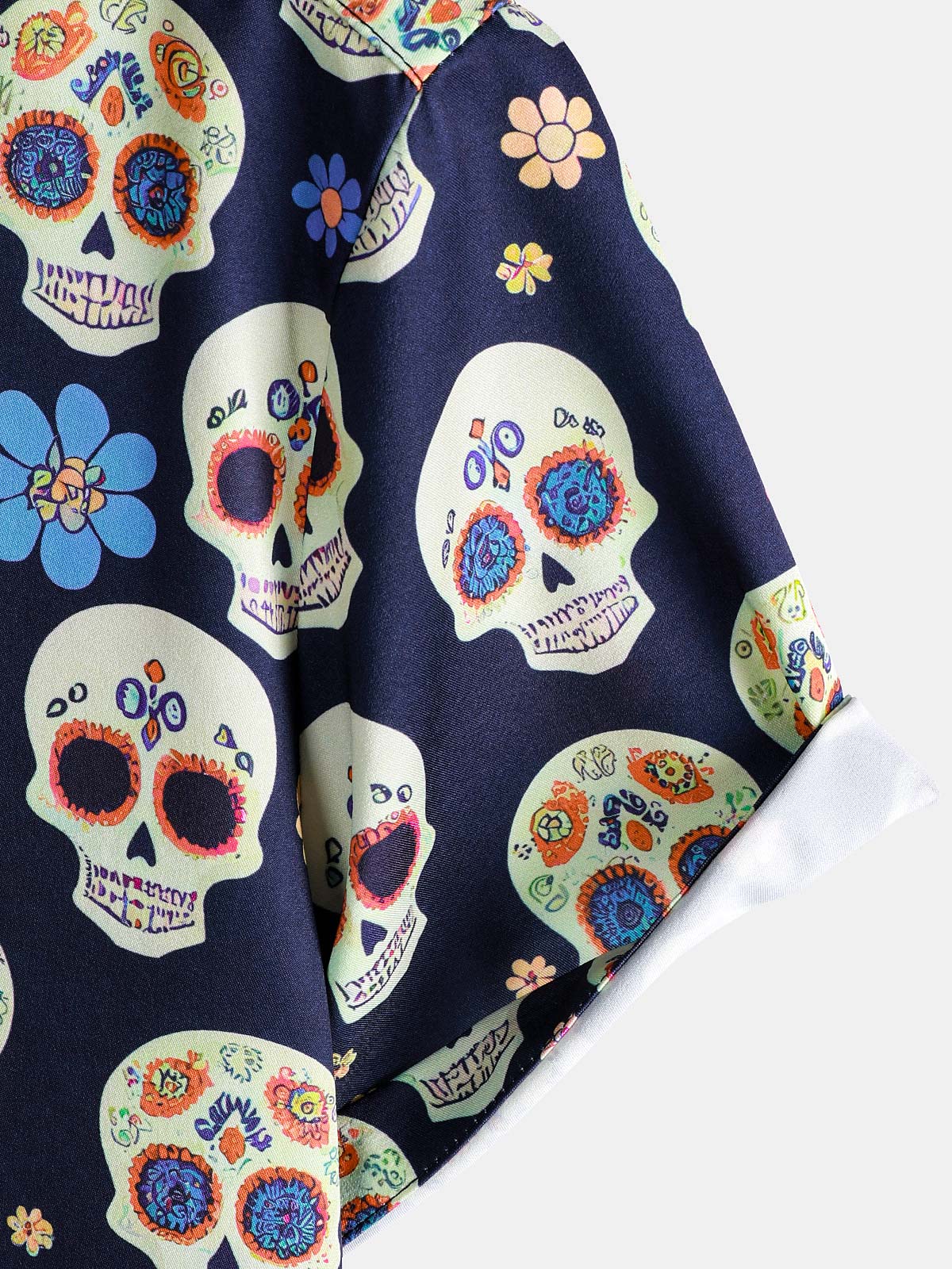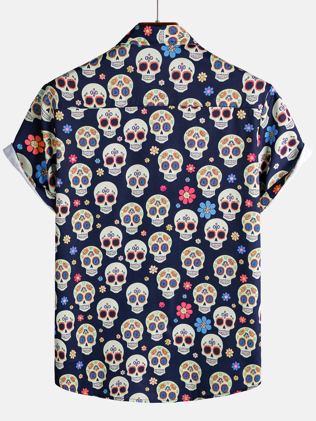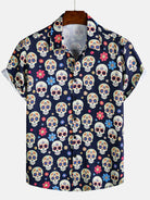 Men's Floral Skull Cool Graphic Button Up Short Sleeve Punk Rock Art Shirt