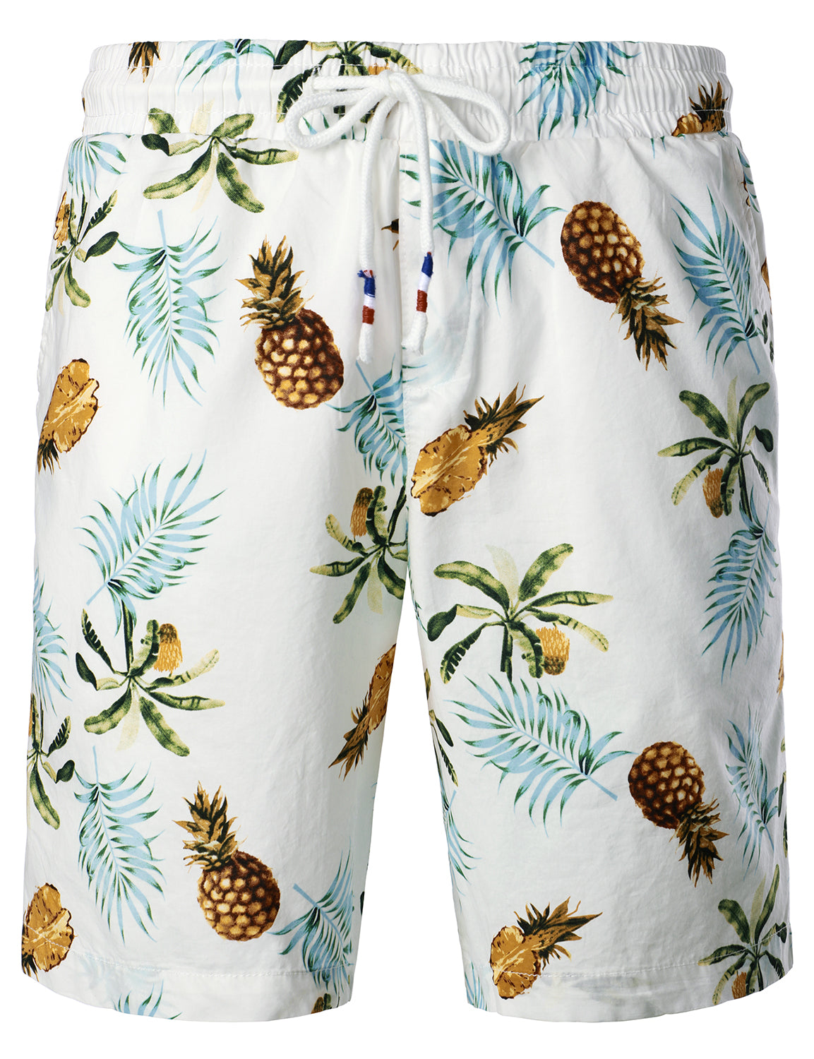 - About Shorts: flat-front casual all-over printing shorts with slanted side pockets and rear pockets, mid-rise, elastic waist, and drawstring