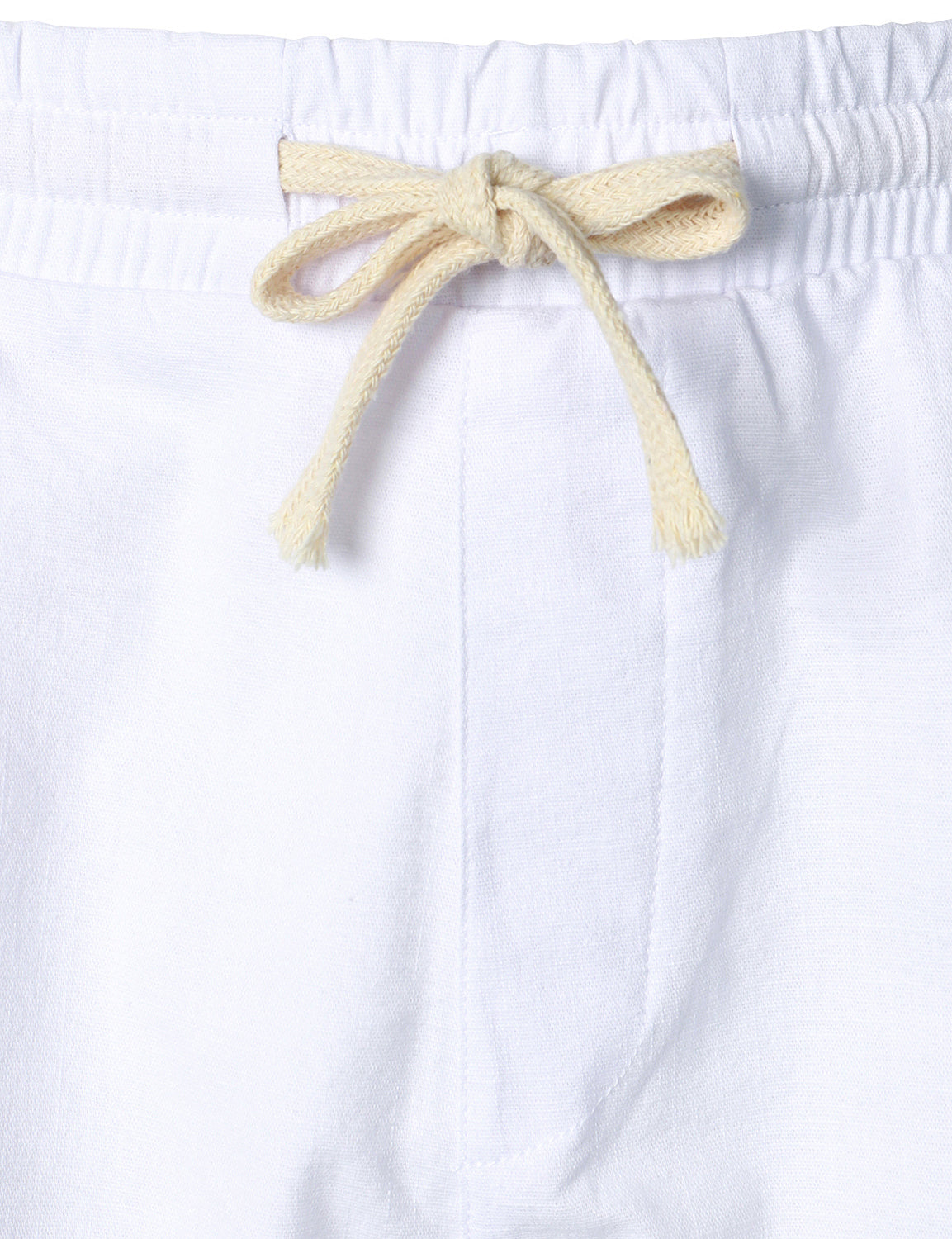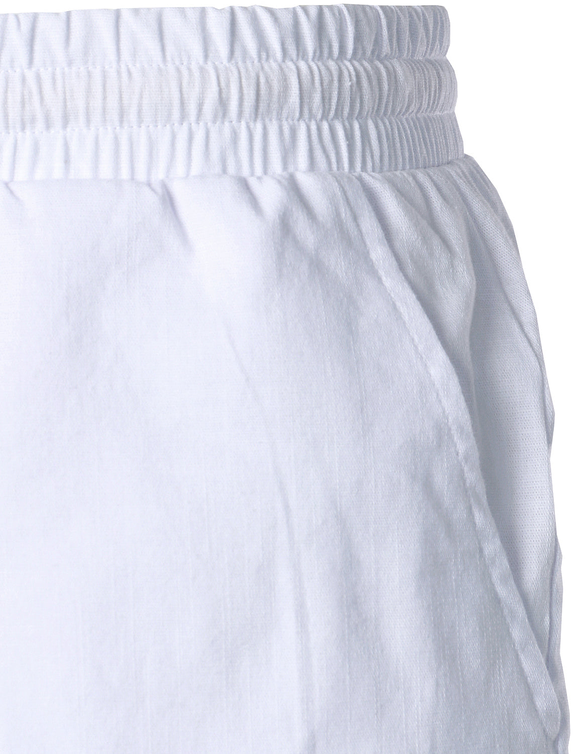 - Flat-front casual shorts with slanted side pockets and rear pockets, mid-rise, elastic waist, and drawstring closure