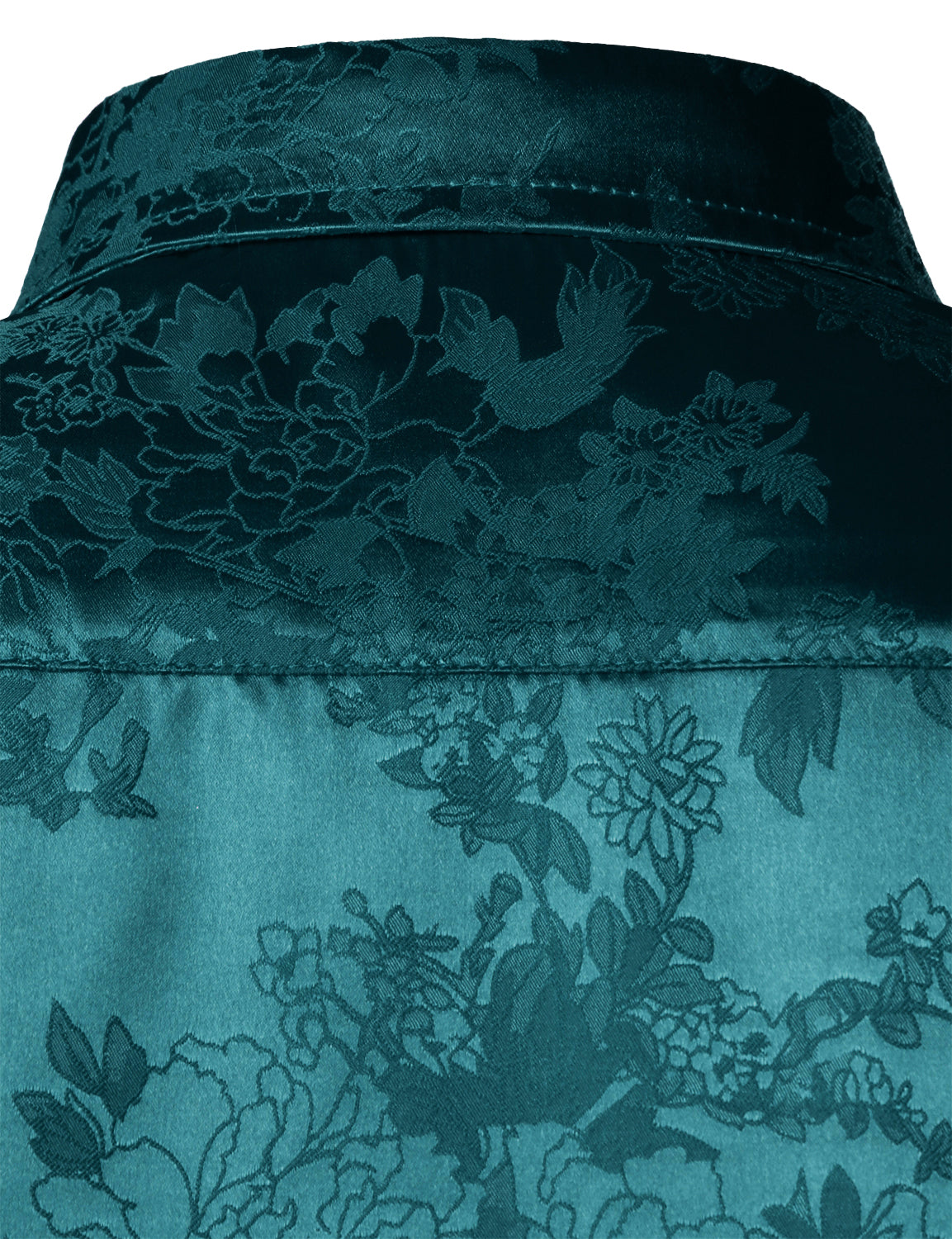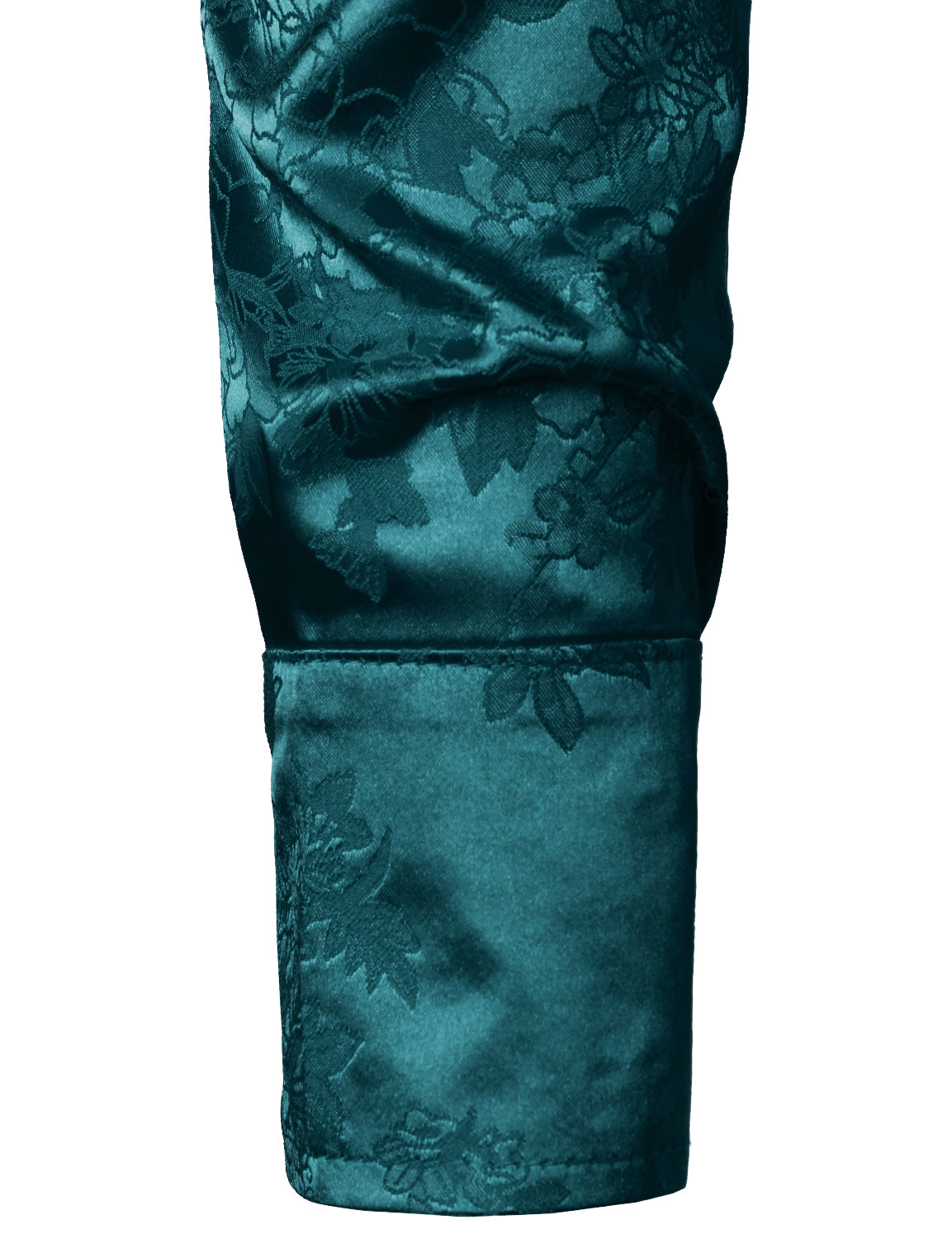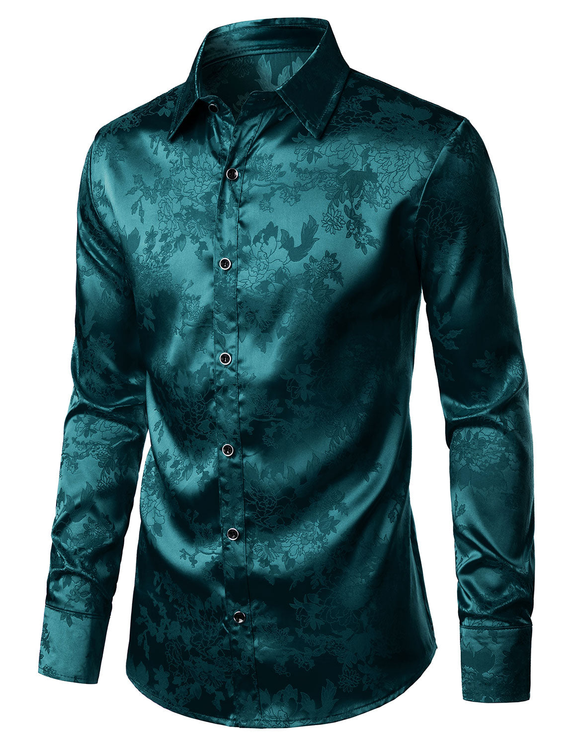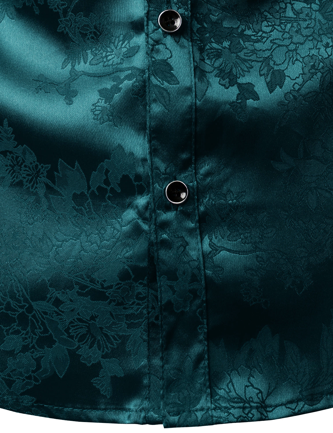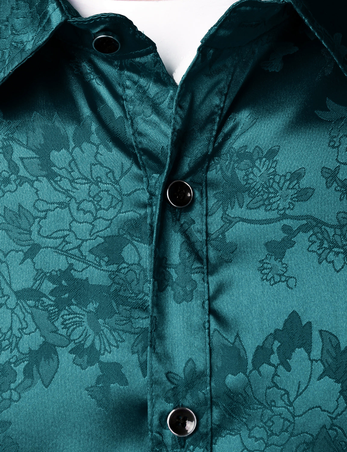 Men's Shiny Satin Floral Jacquard Casual Long Sleeve Button Up Dress Shirt