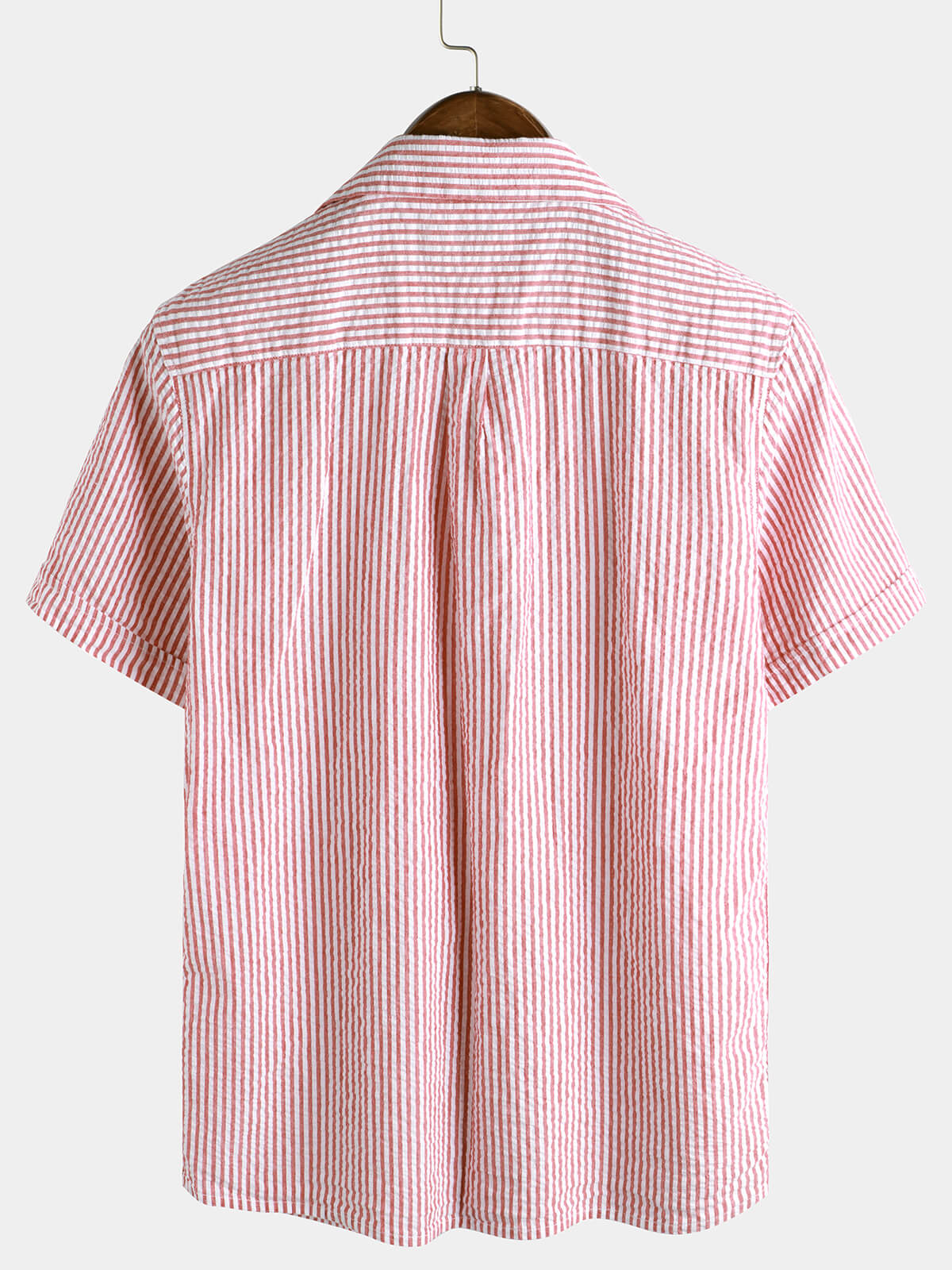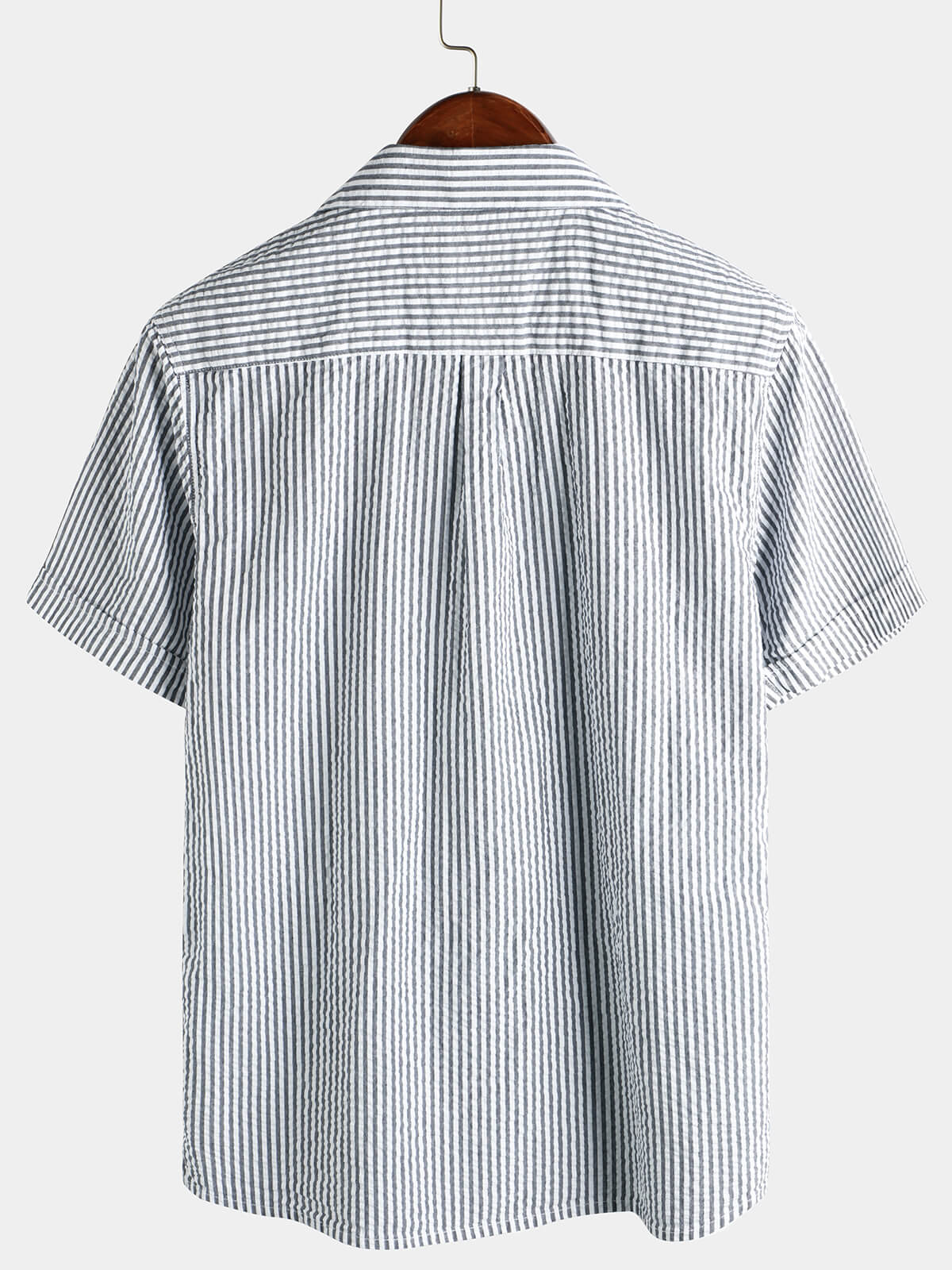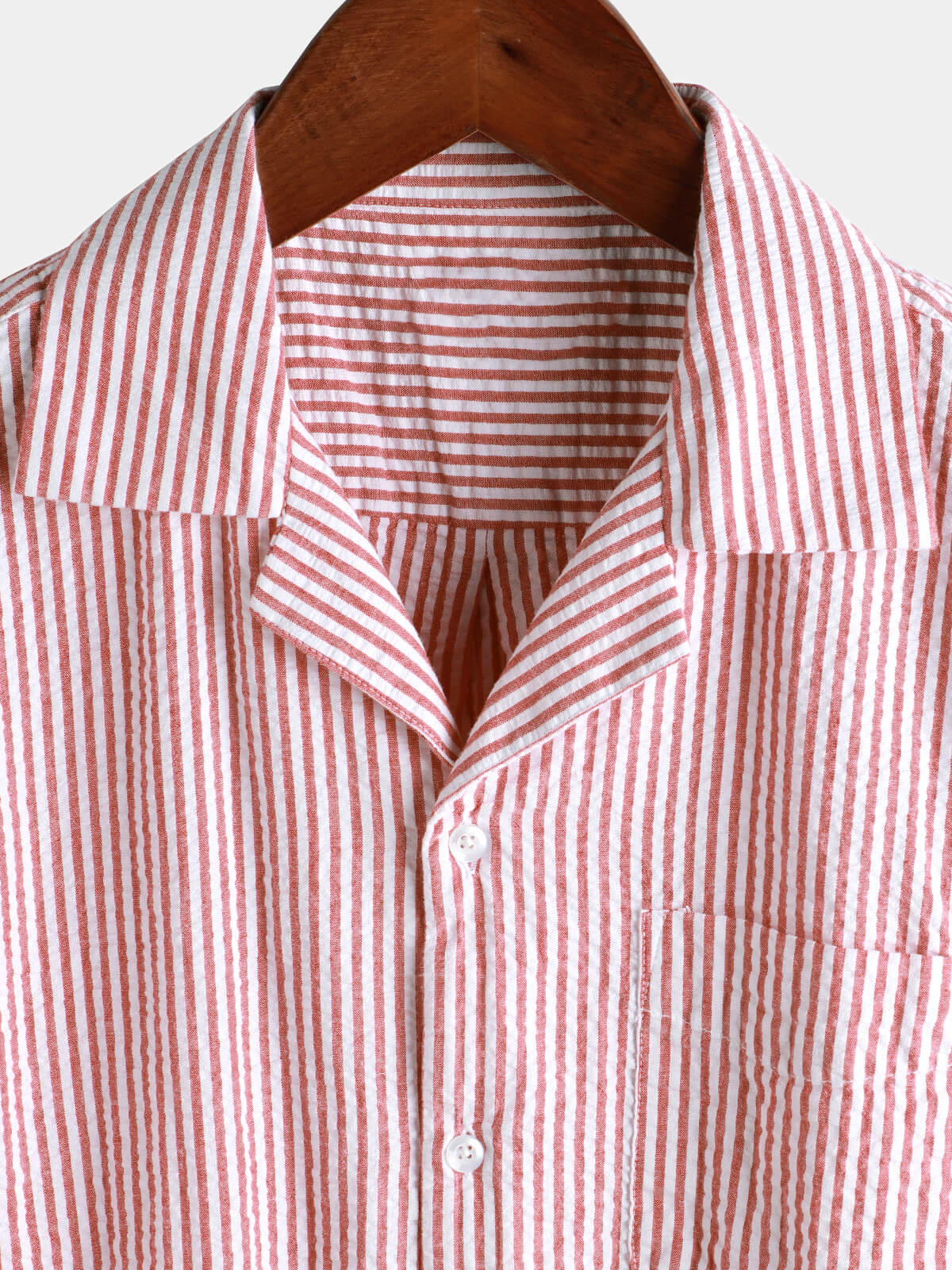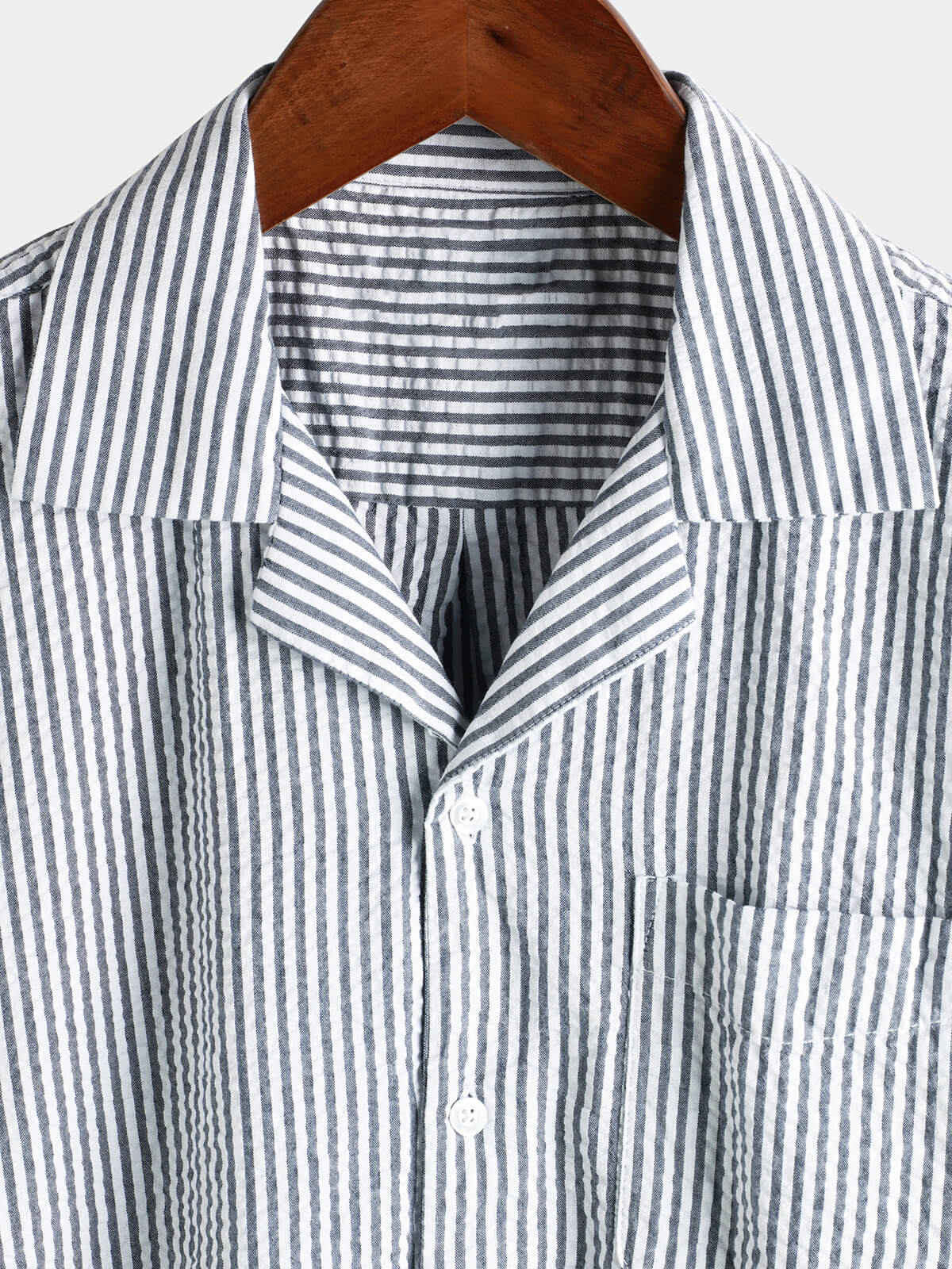 Men's Breathable Striped Cotton Button Up Summer Cuban Collar Camp Short Sleeve Beach Shirt