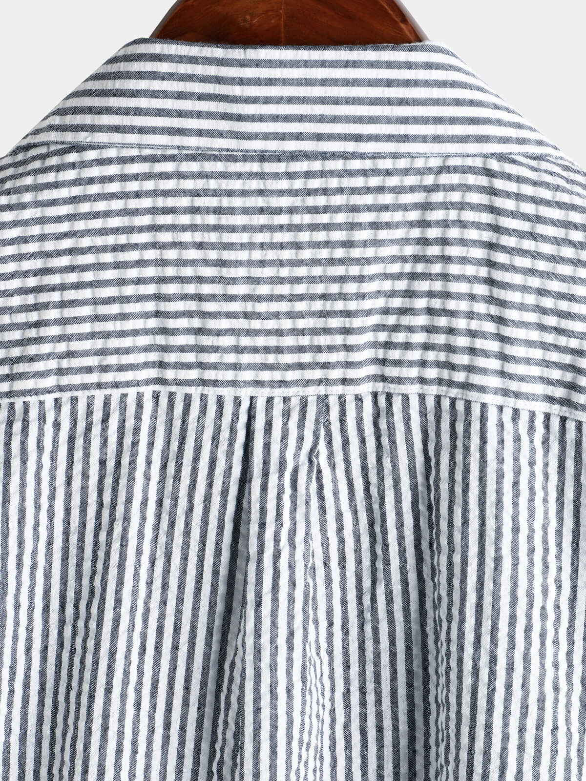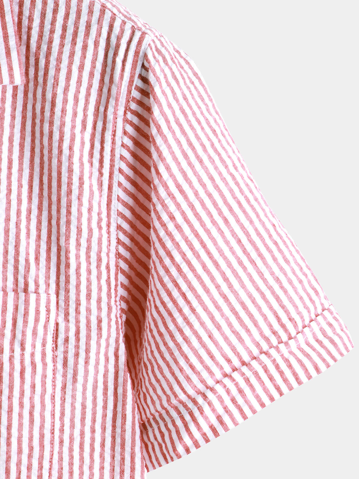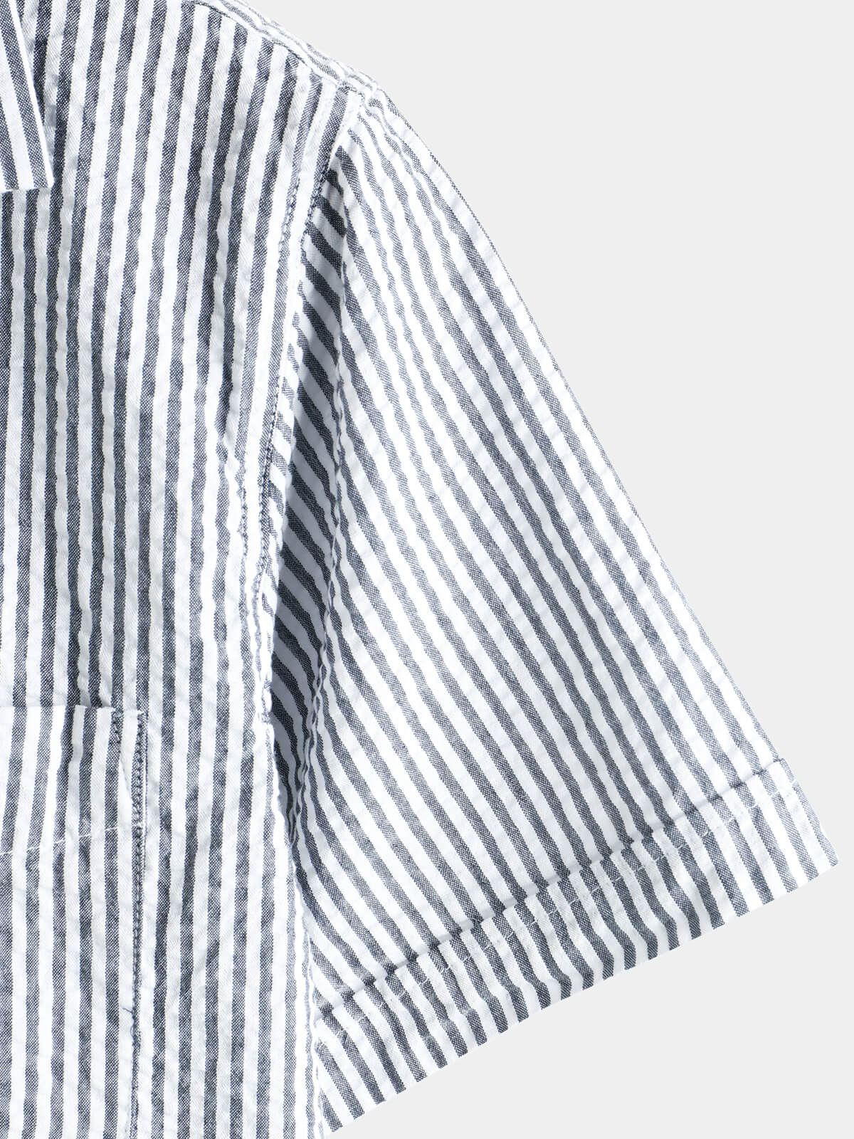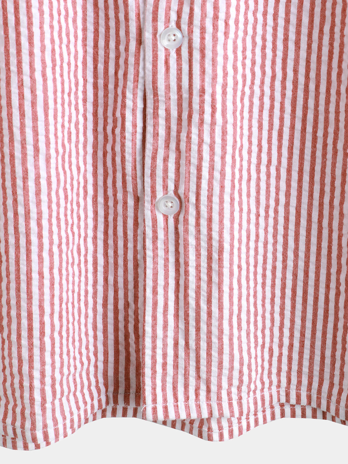 Men's Breathable Striped Cotton Button Up Summer Cuban Collar Camp Short Sleeve Beach Shirt