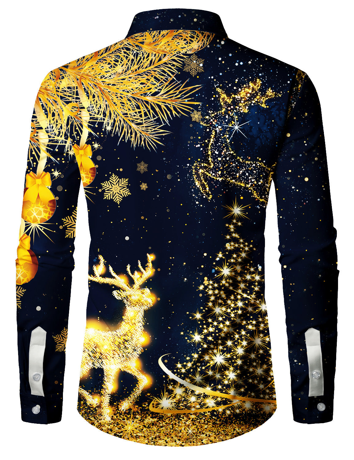 Men's Gold Christmas Reindeer And Tree Print Long Sleeve Shirt