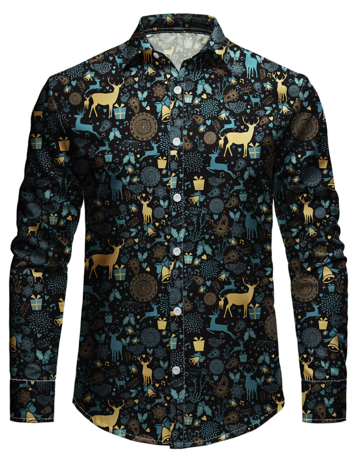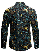 Men's Vintage Christmas Blue Reindeer Print Holiday Long Sleeve Shirt