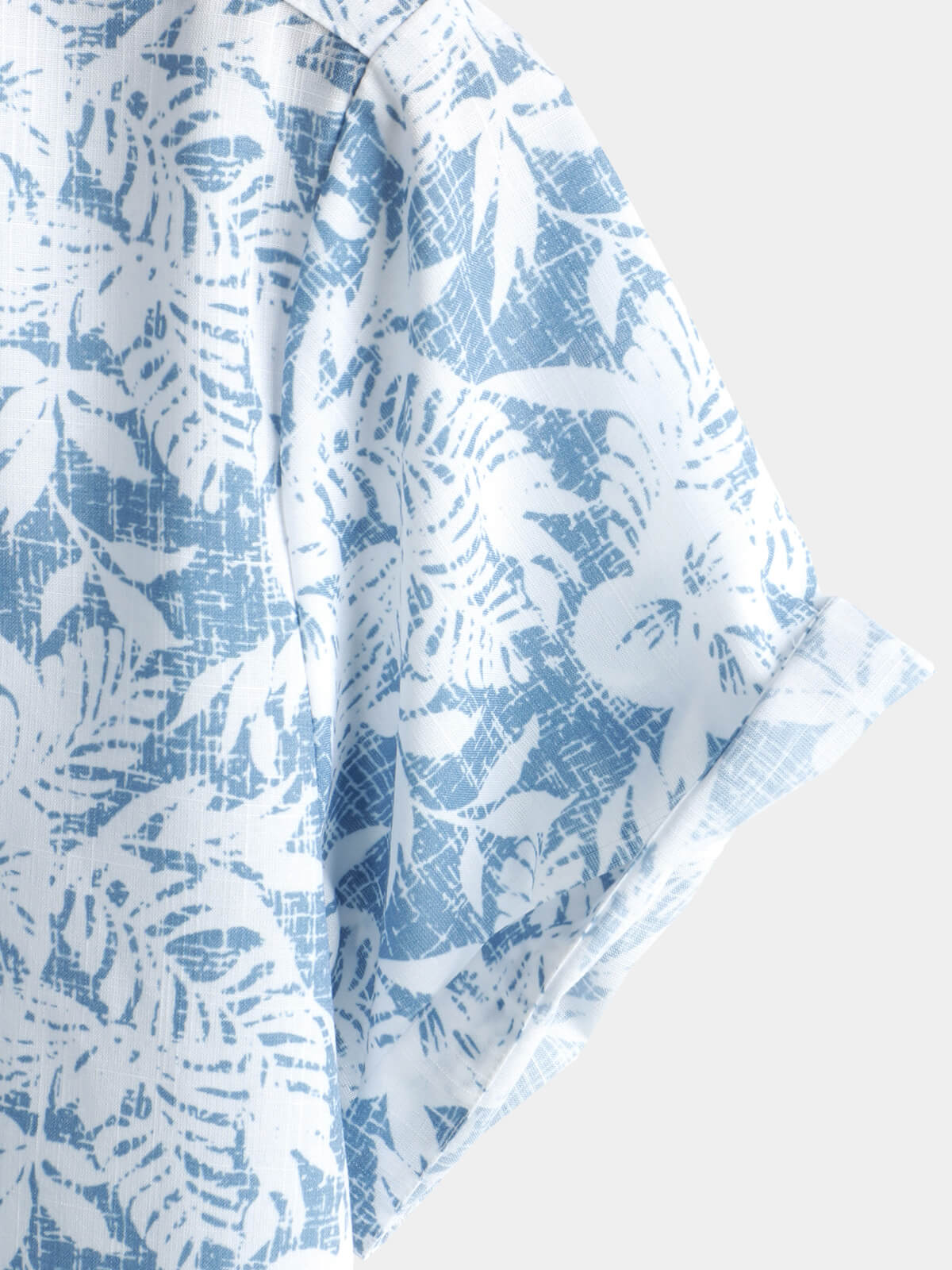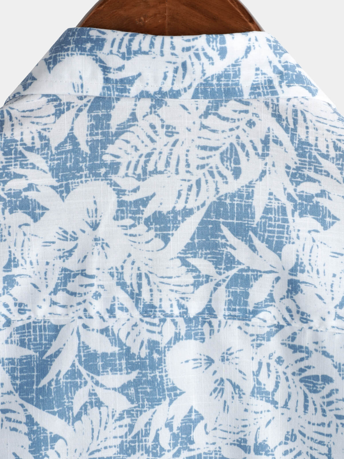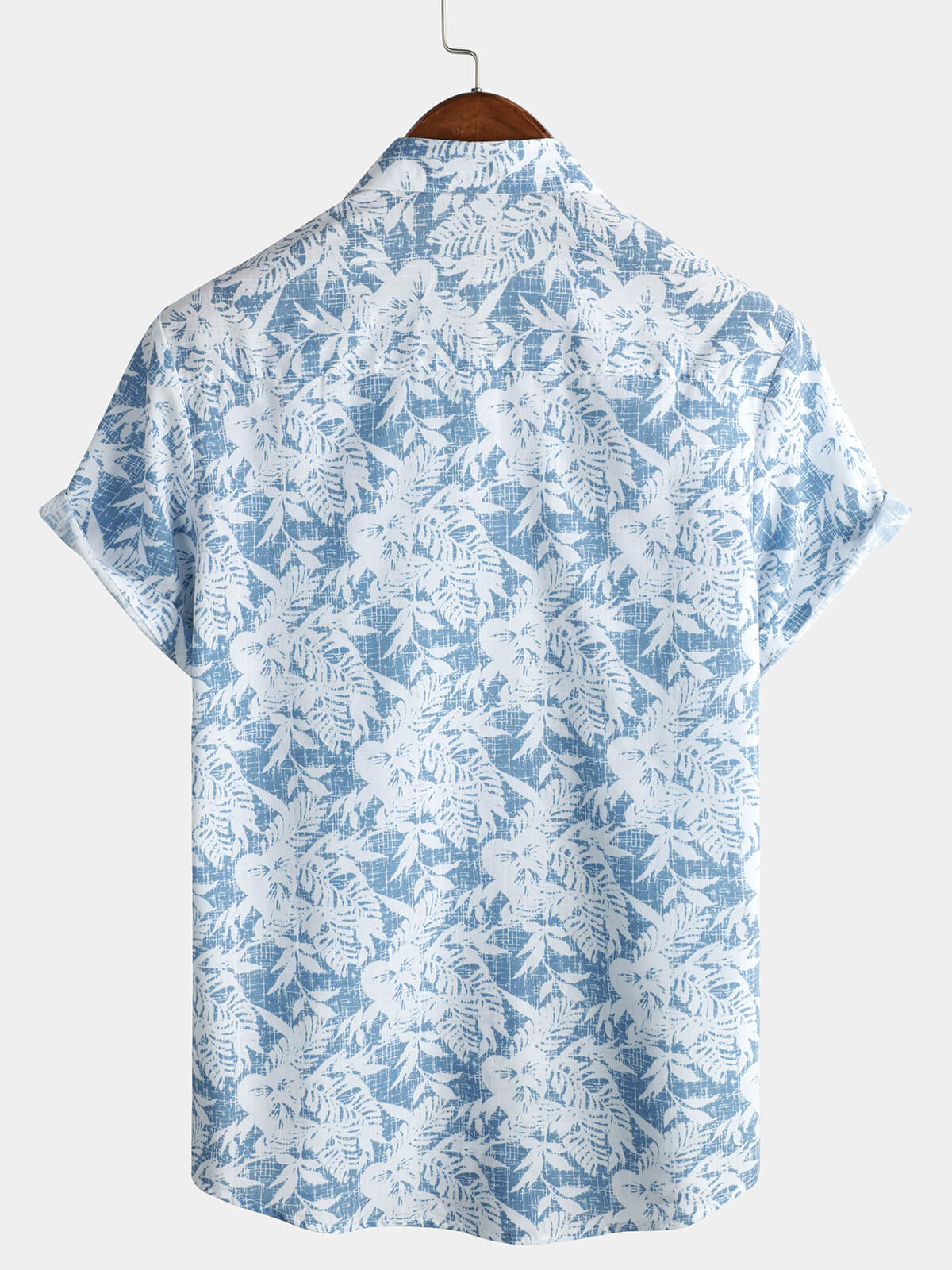 Men's Blue Cotton Vintage Floral Leaf Print Beach Hawaiian Short Sleeve Button Up Shirt