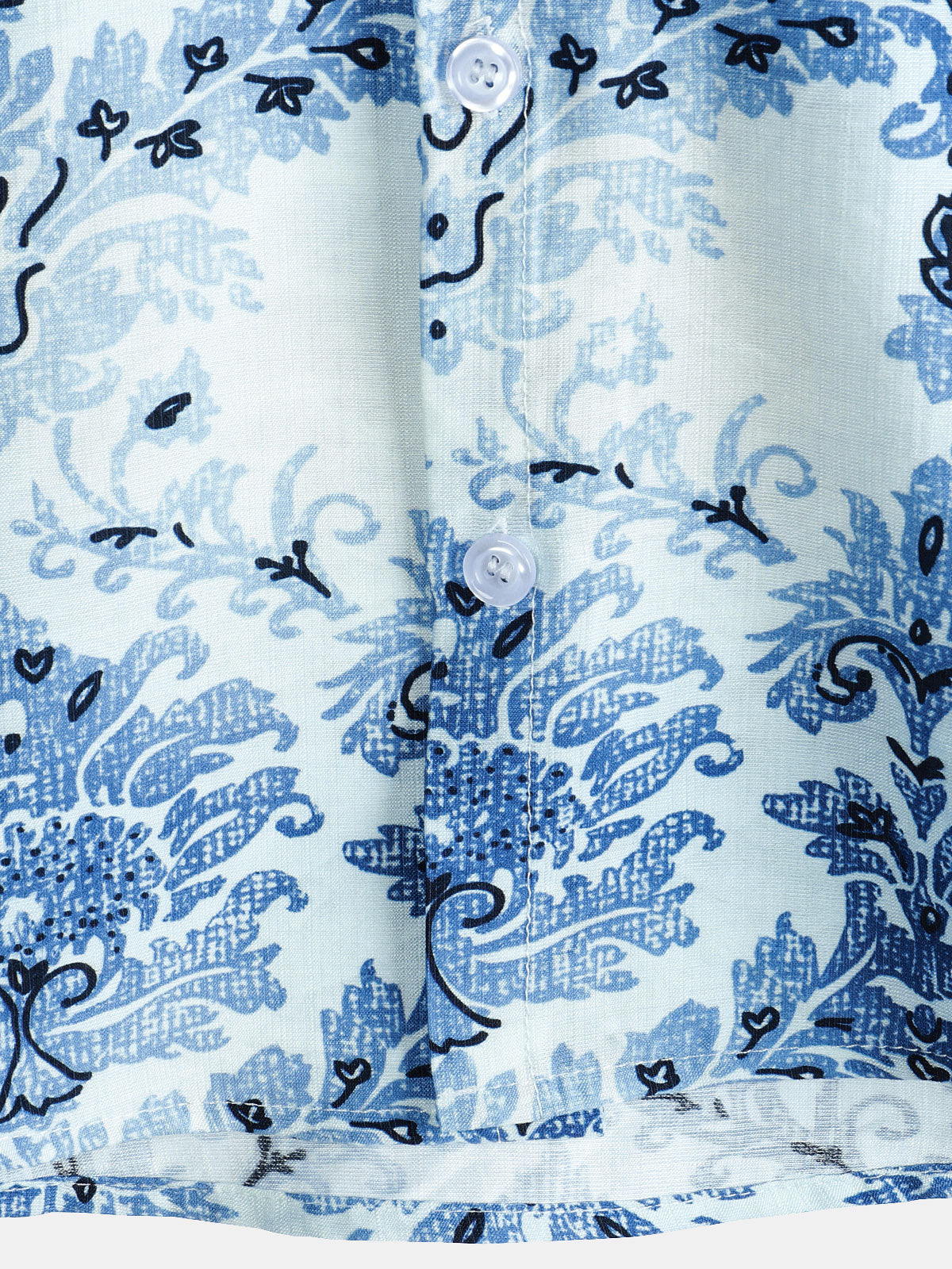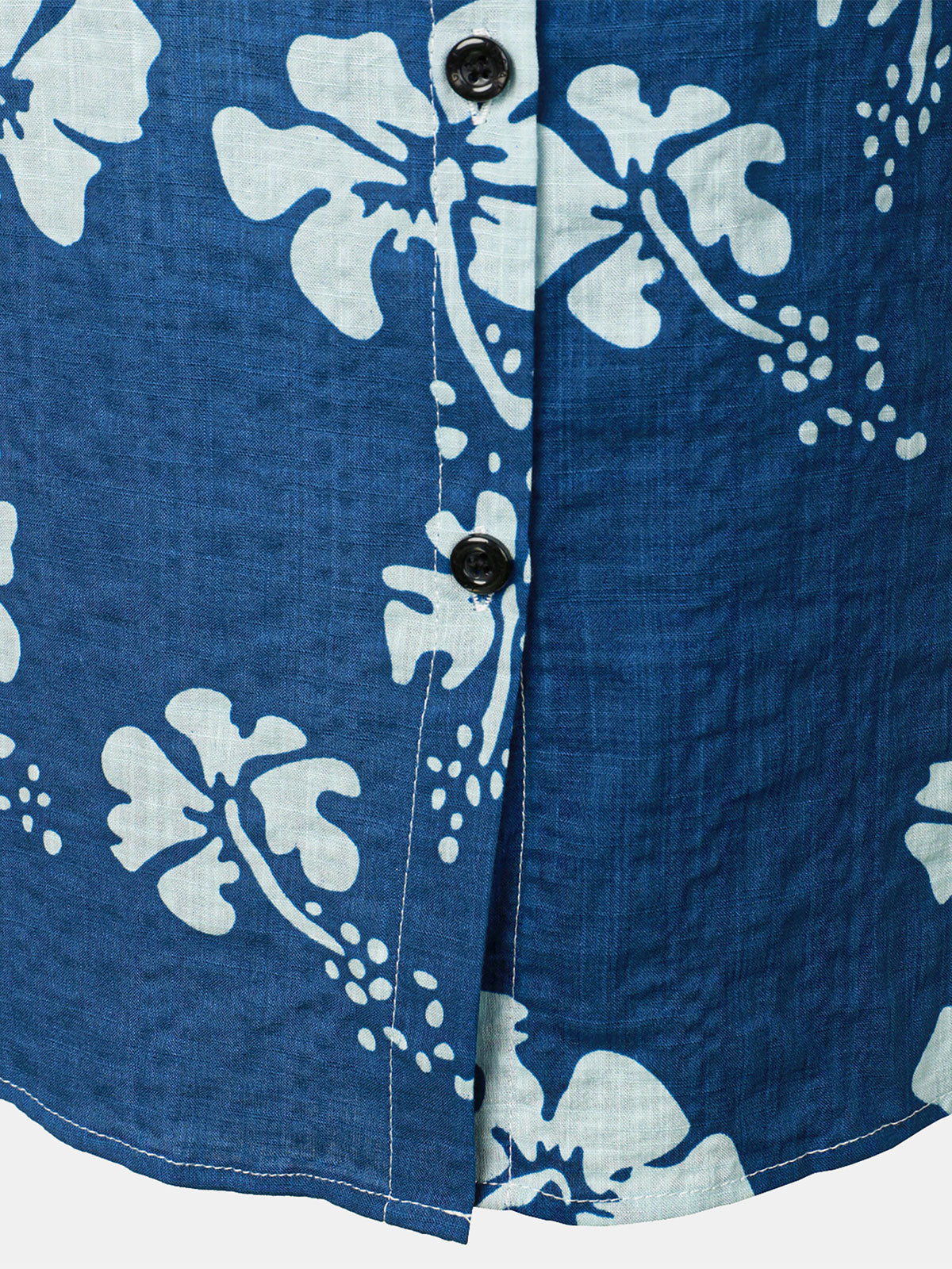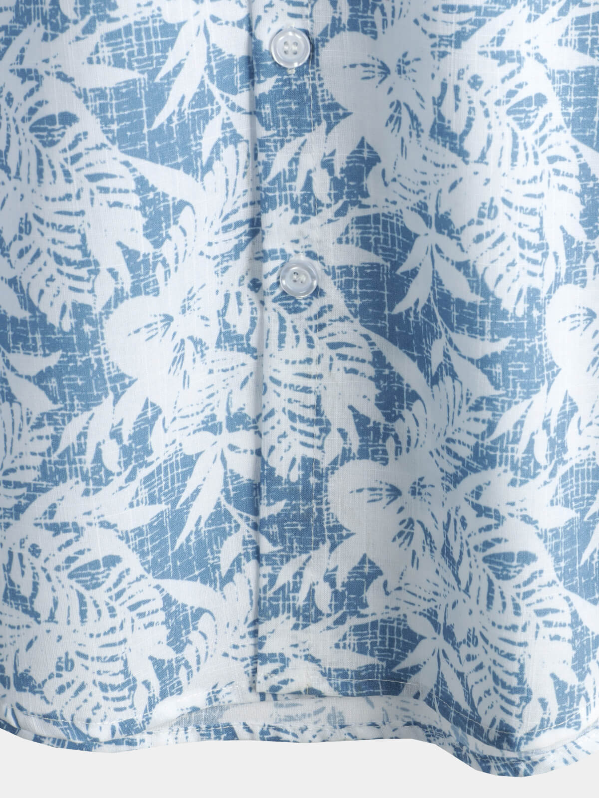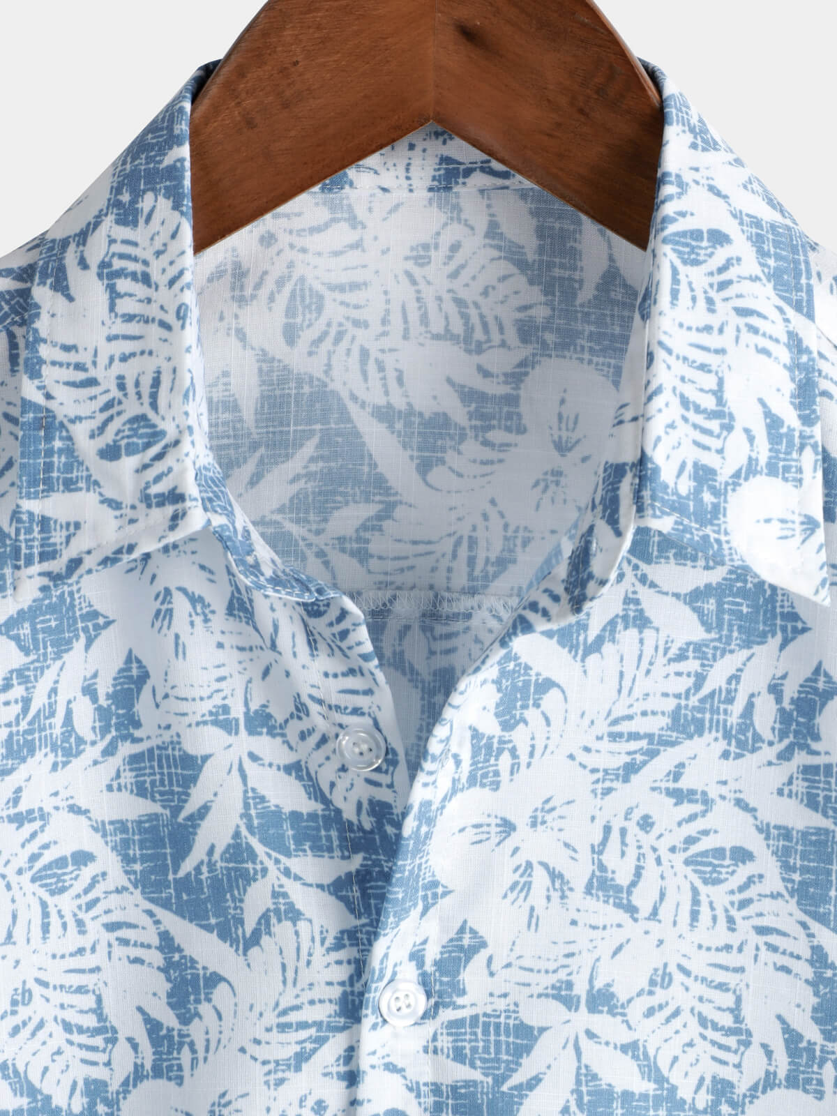 Men's Blue Cotton Vintage Floral Leaf Print Beach Hawaiian Short Sleeve Button Up Shirt