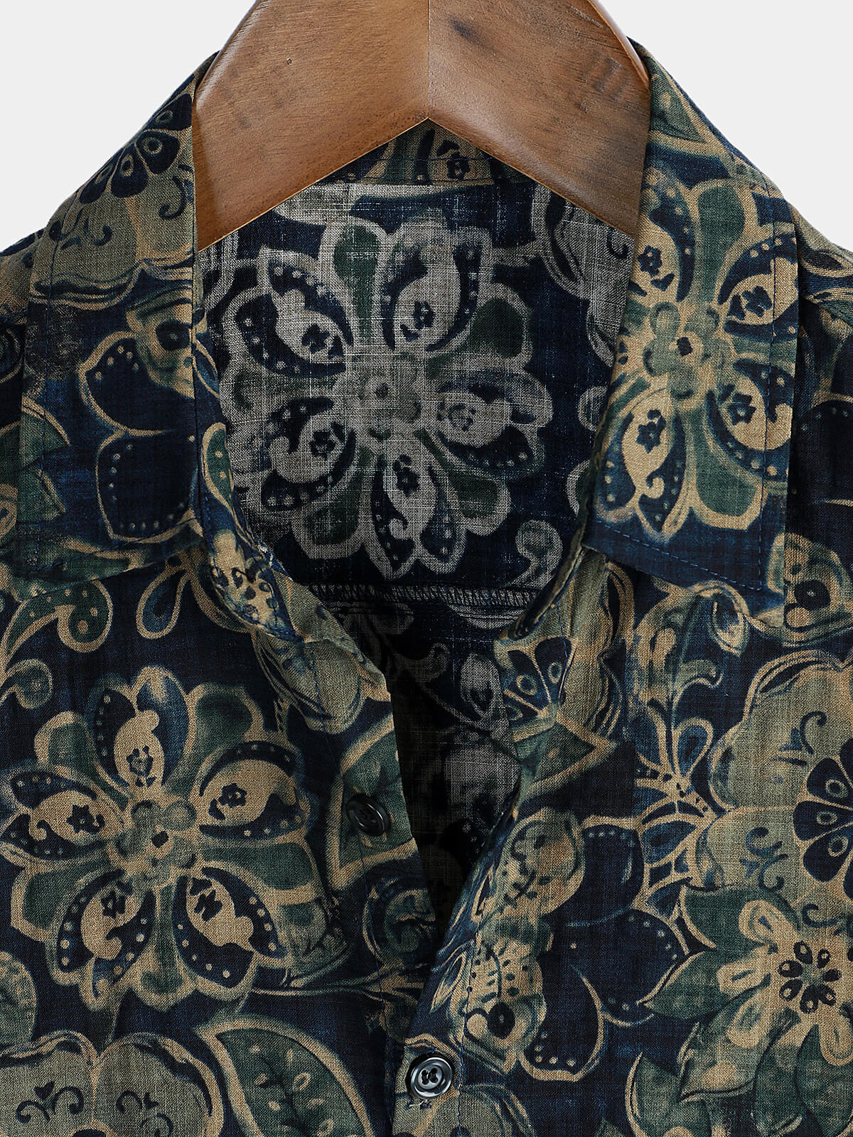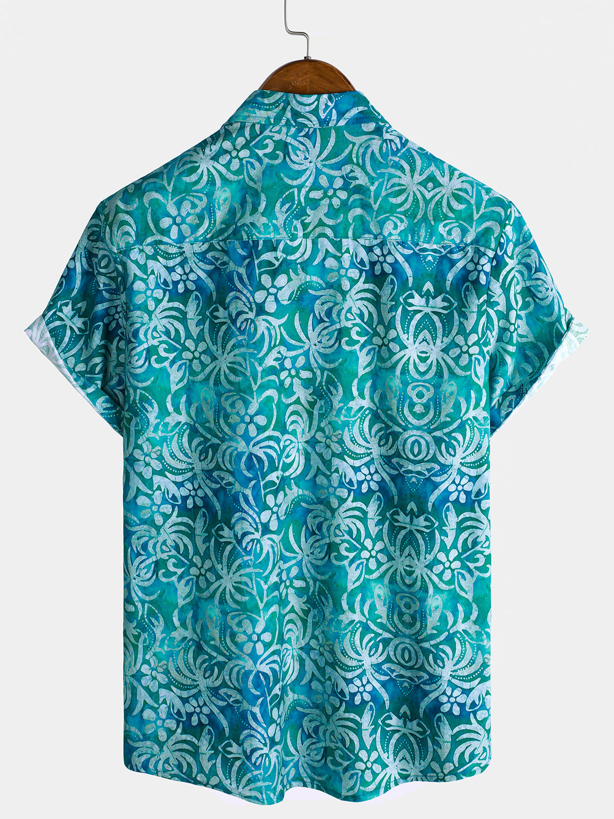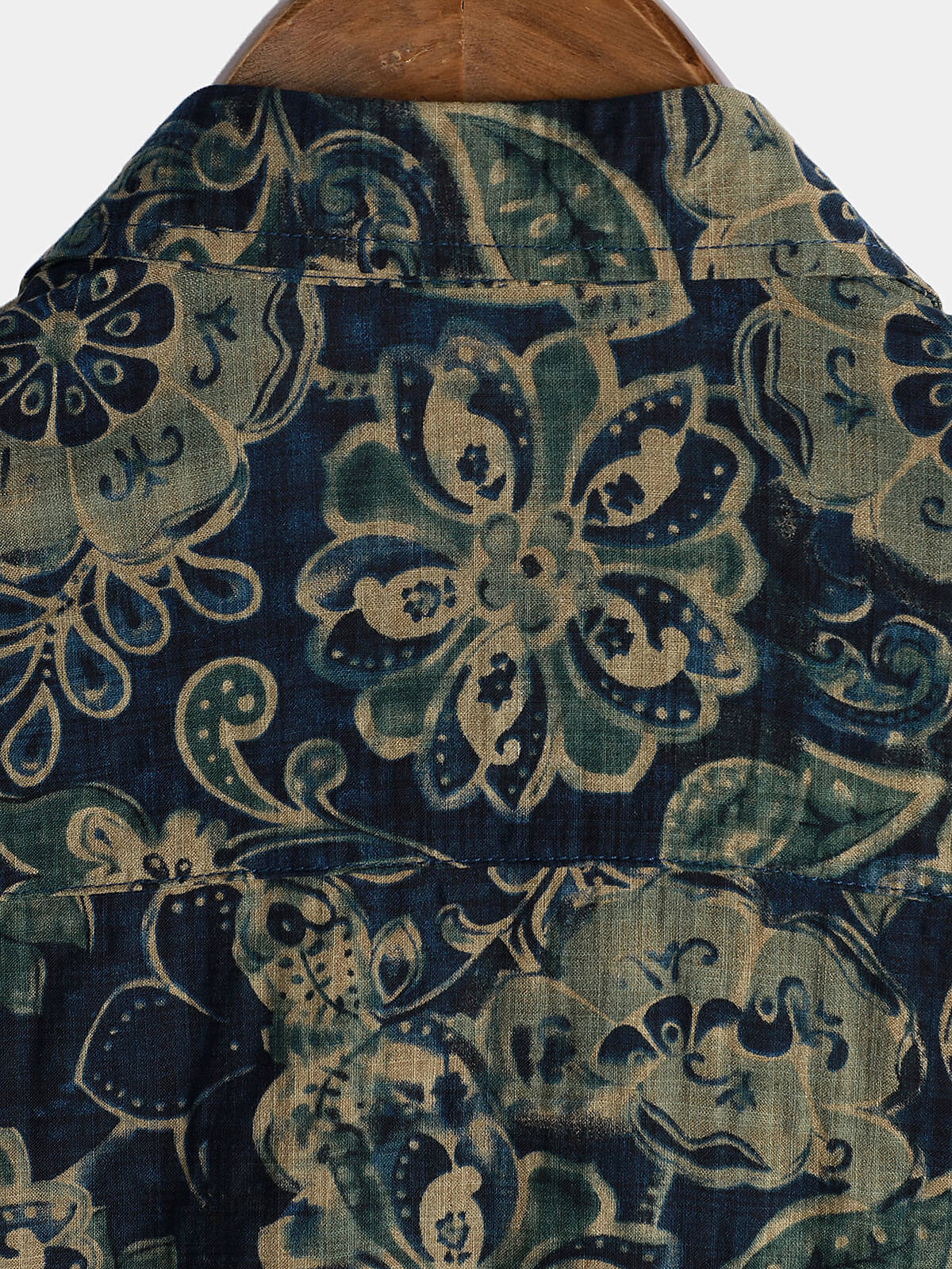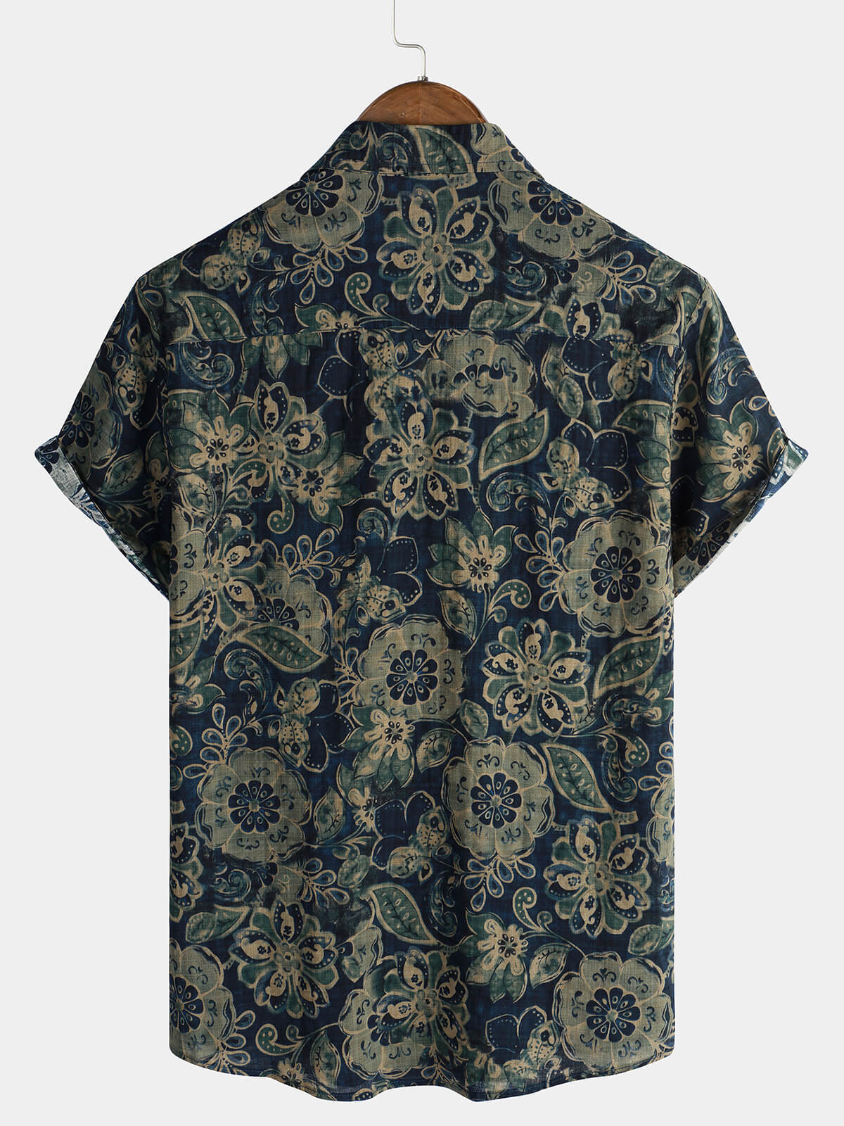 Men's Short Sleeve Casual Holiday Vintage Floral Button Green Cotton Shirt