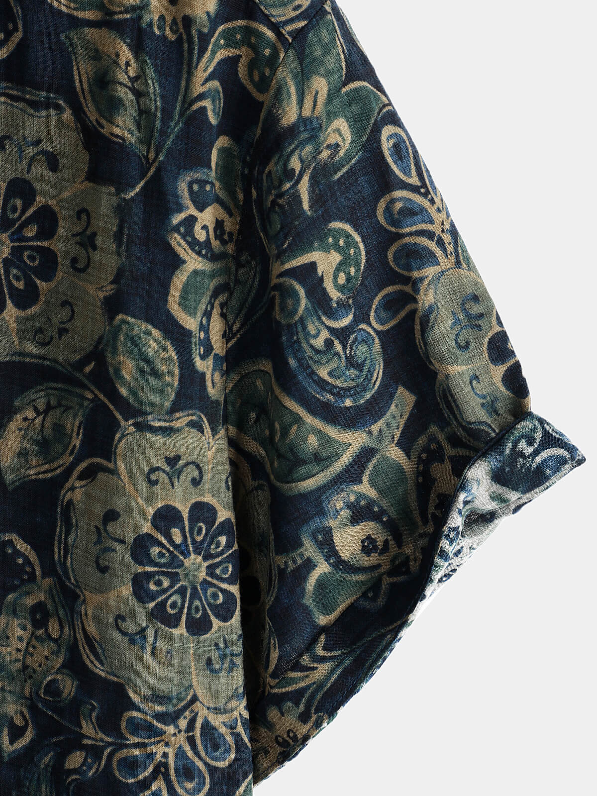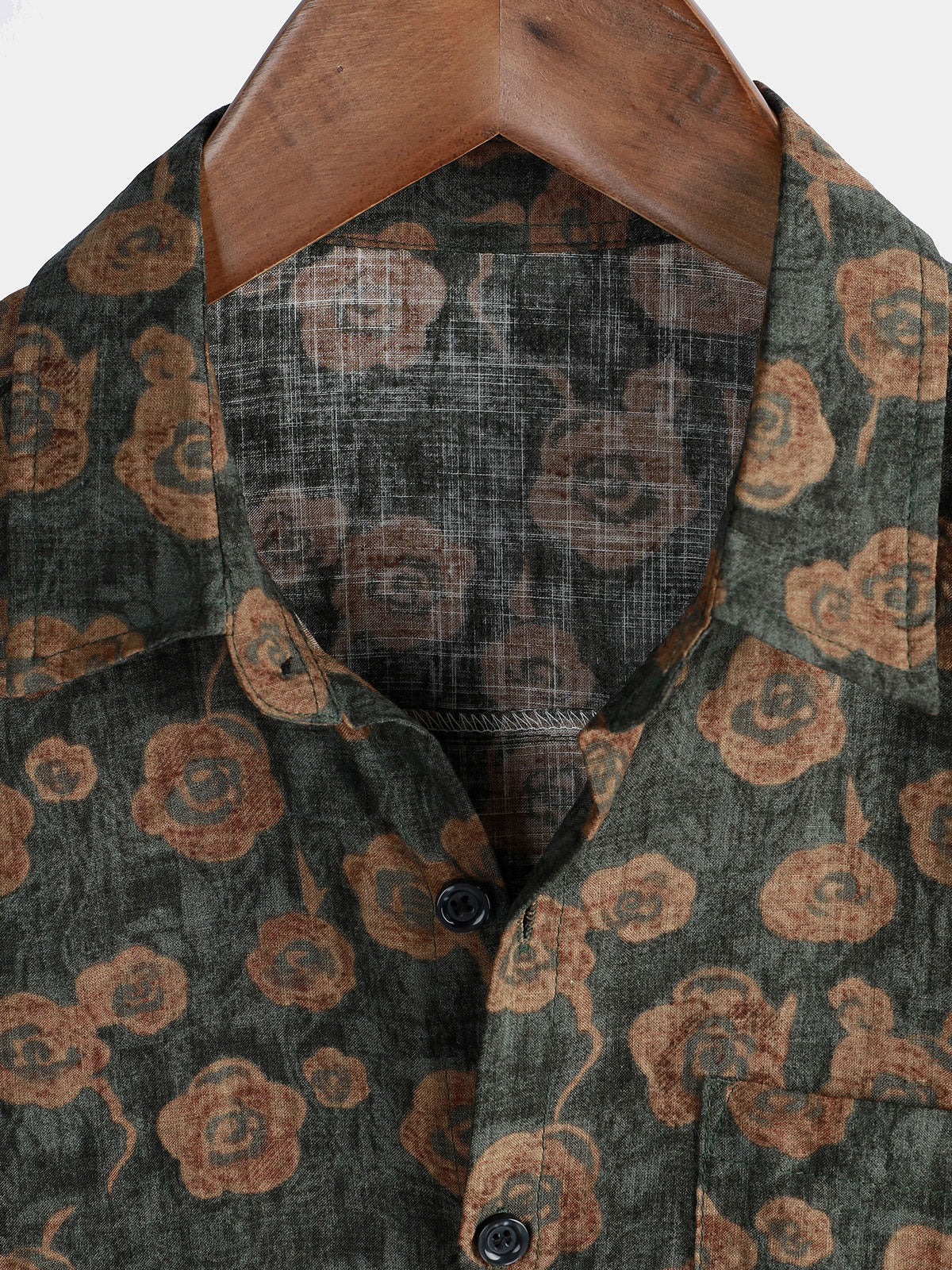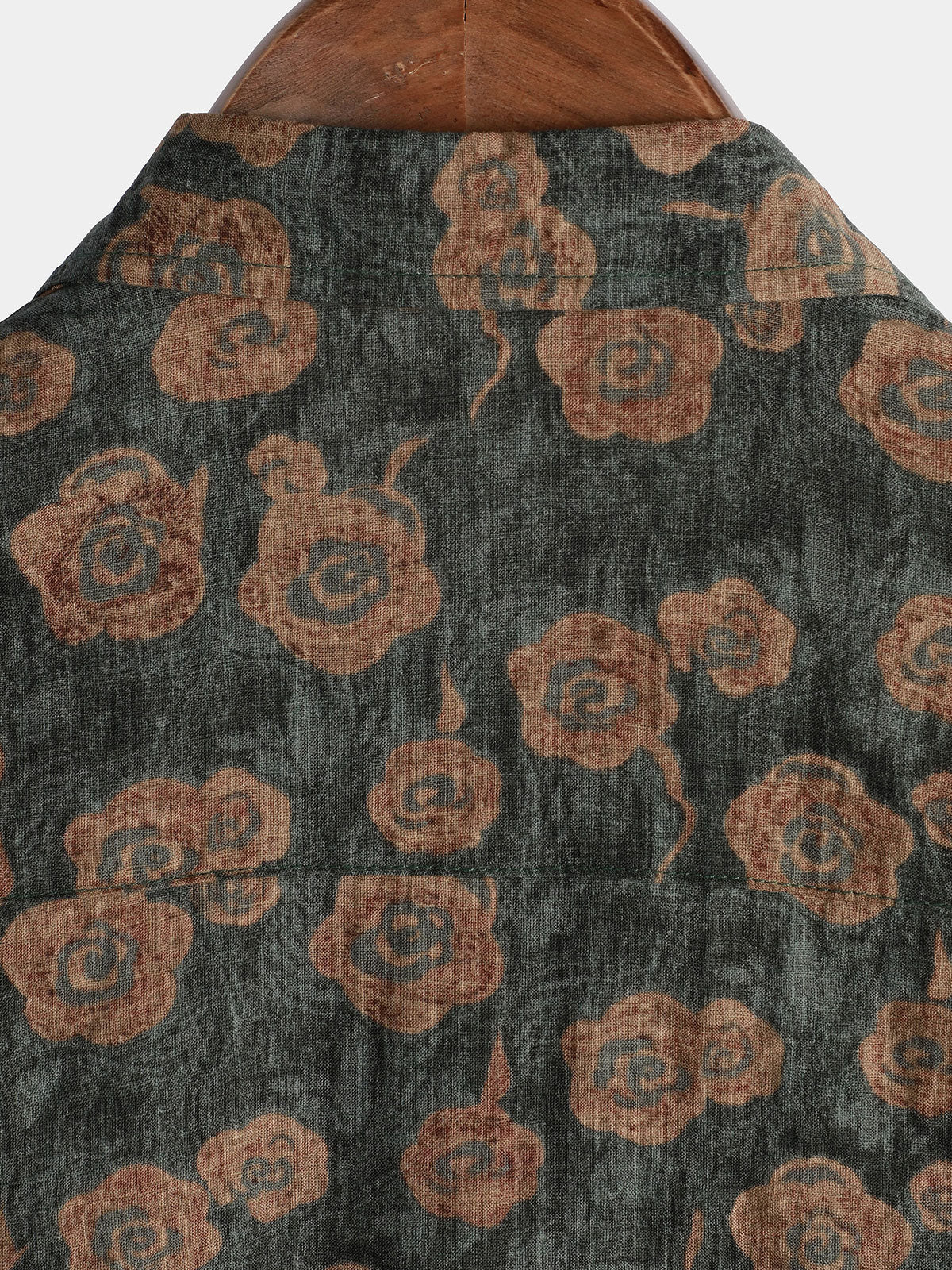 Men's Short Sleeve Casual Holiday Vintage Floral Button Green Cotton Shirt