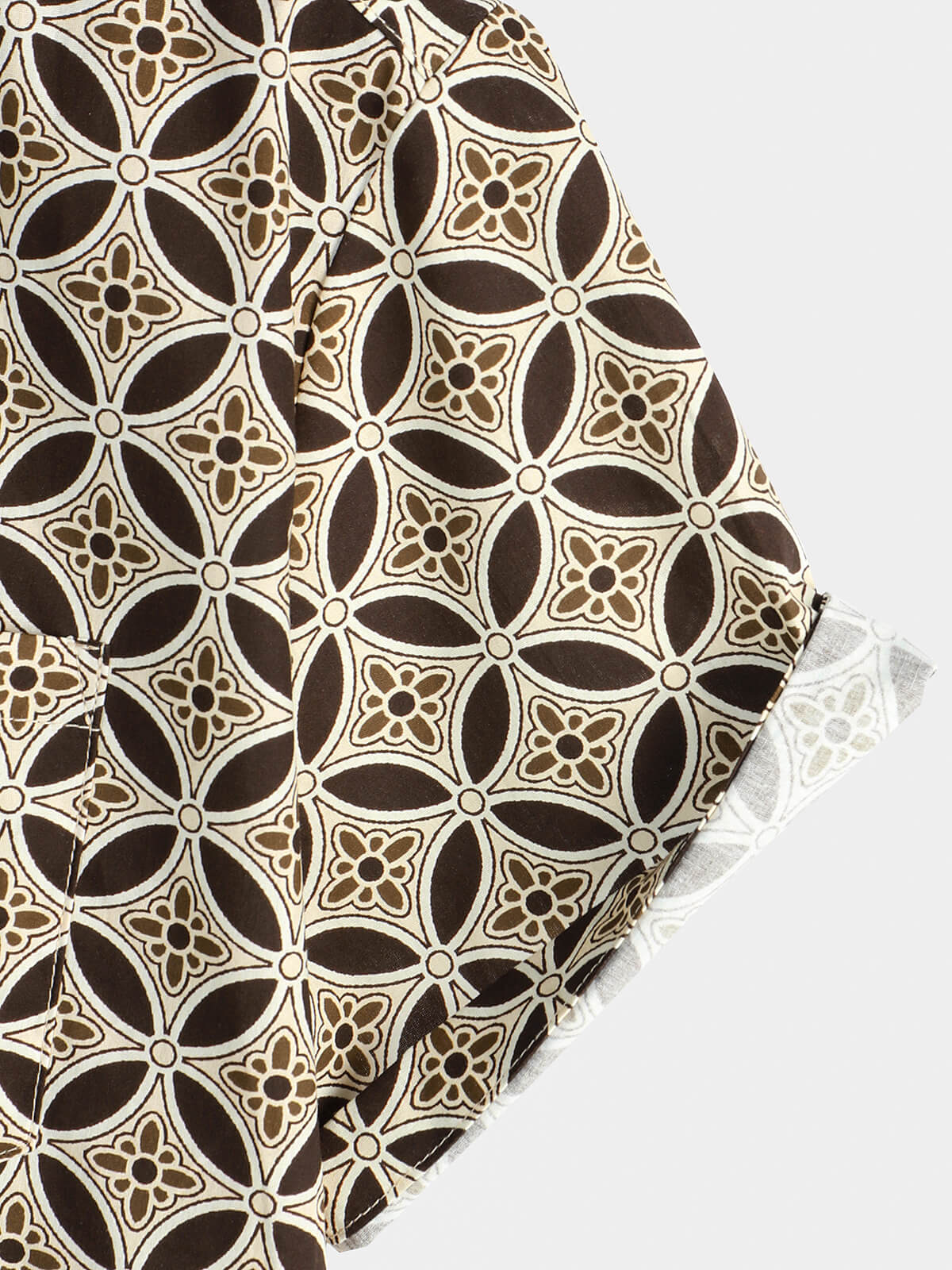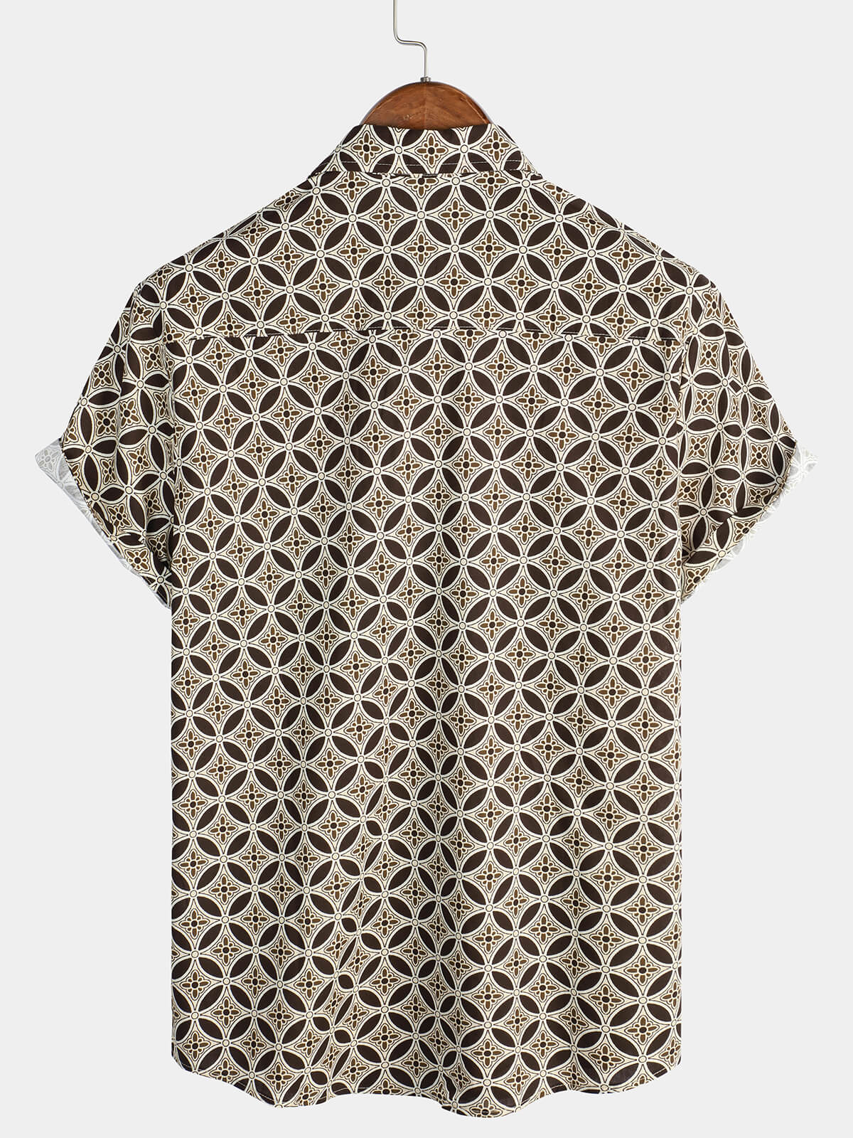 Men's Khaki Geometric Floral Pocket Short Sleeve Shirt