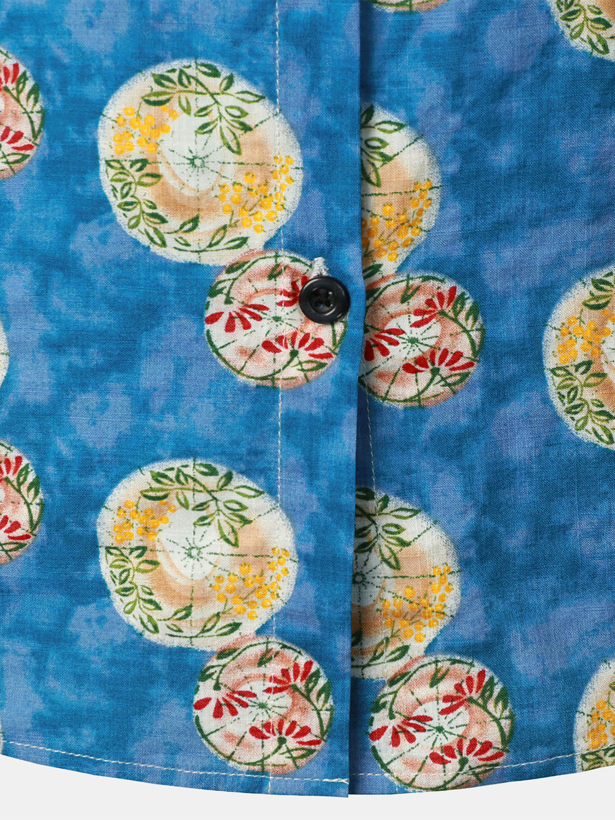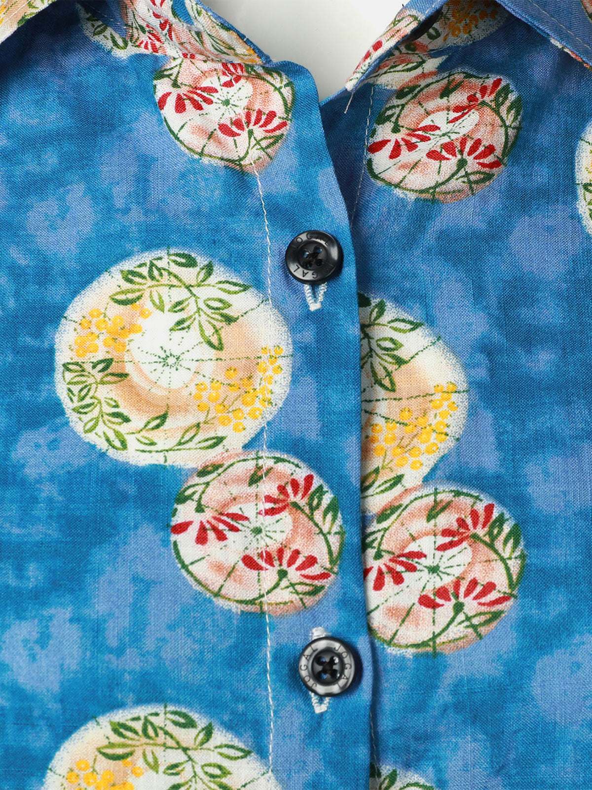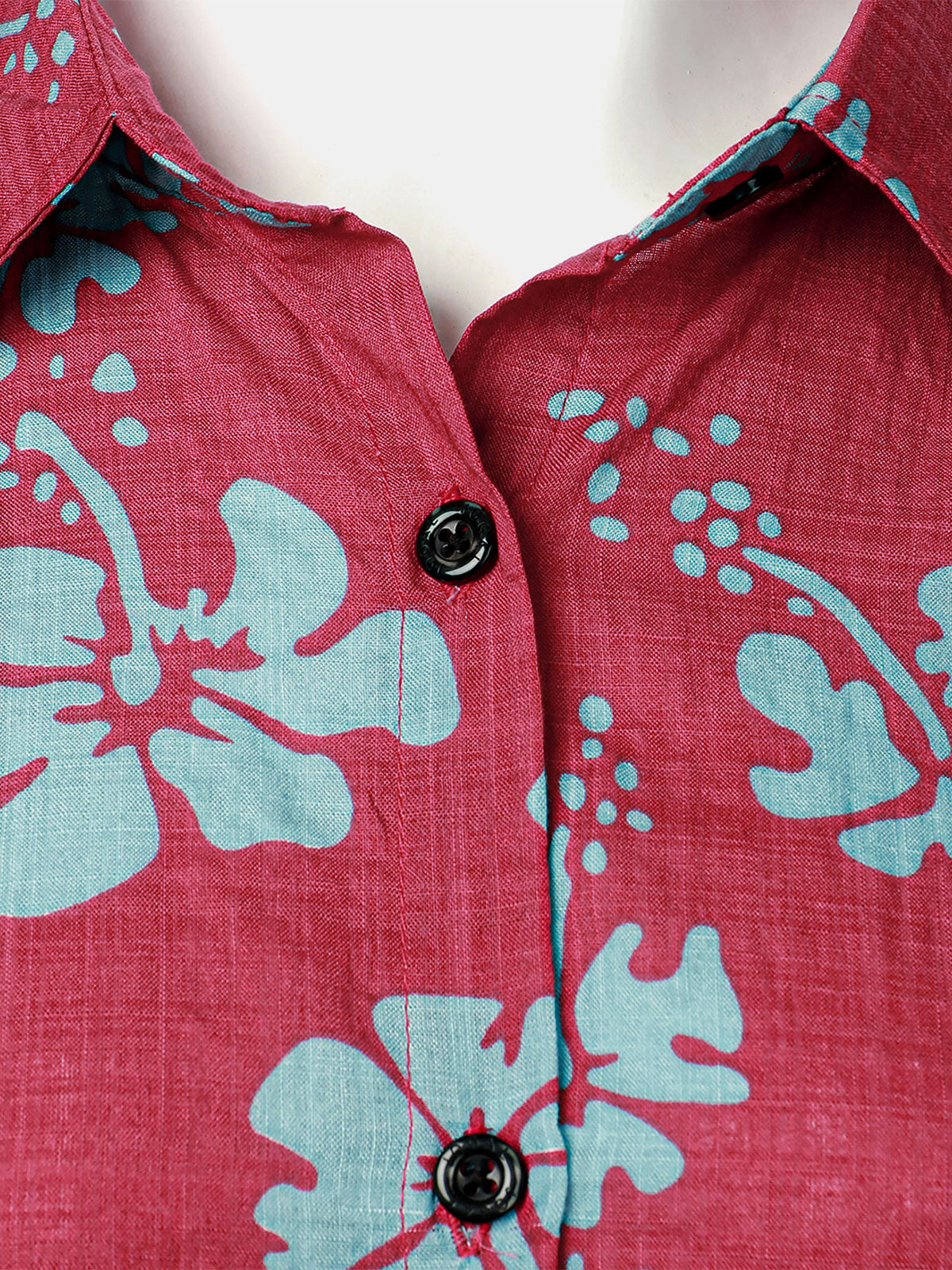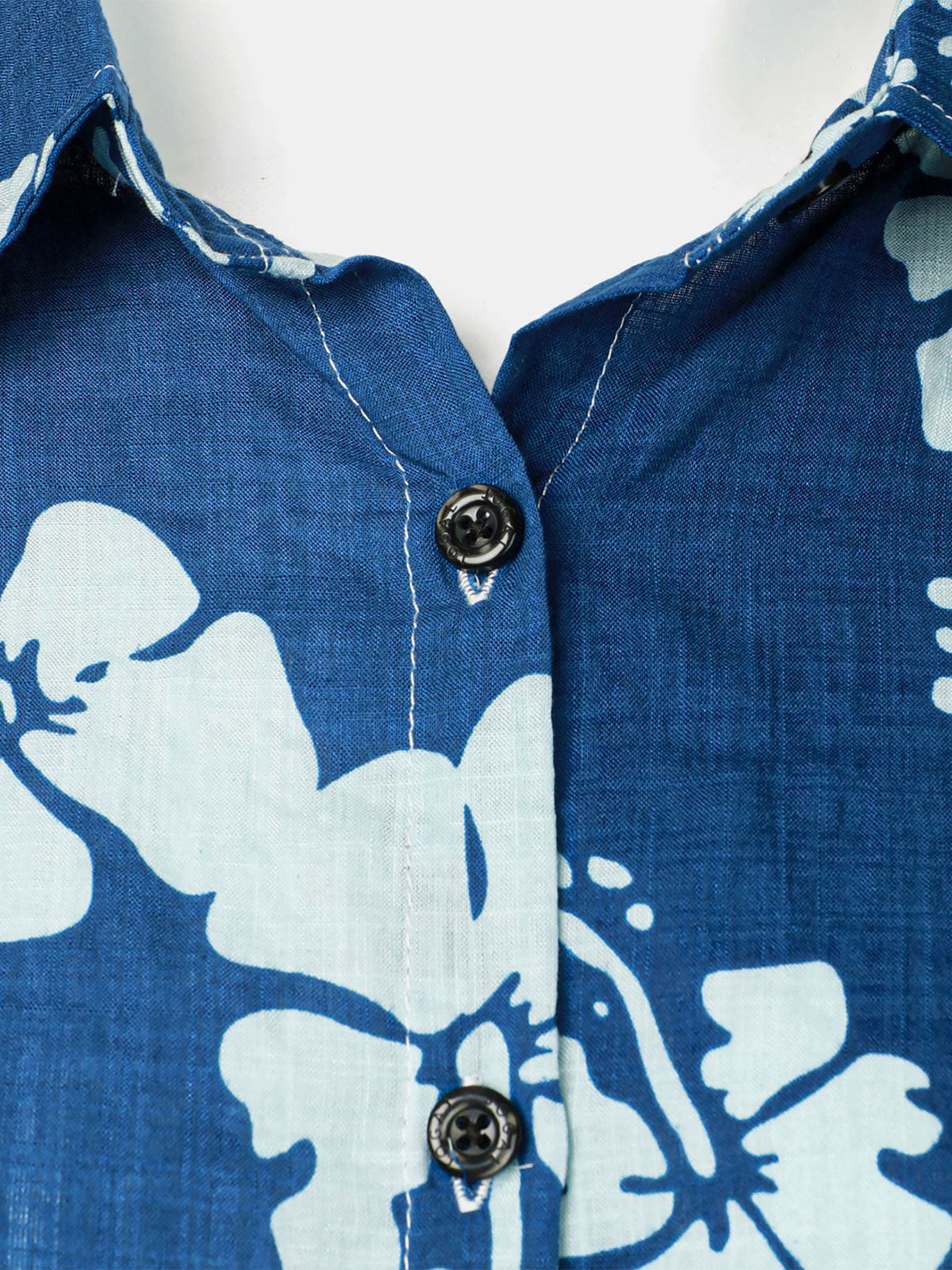 Women's Blue Floral Print Blouse Hawaiian Cotton Beach Summer Aloha Short Sleeve Shirt