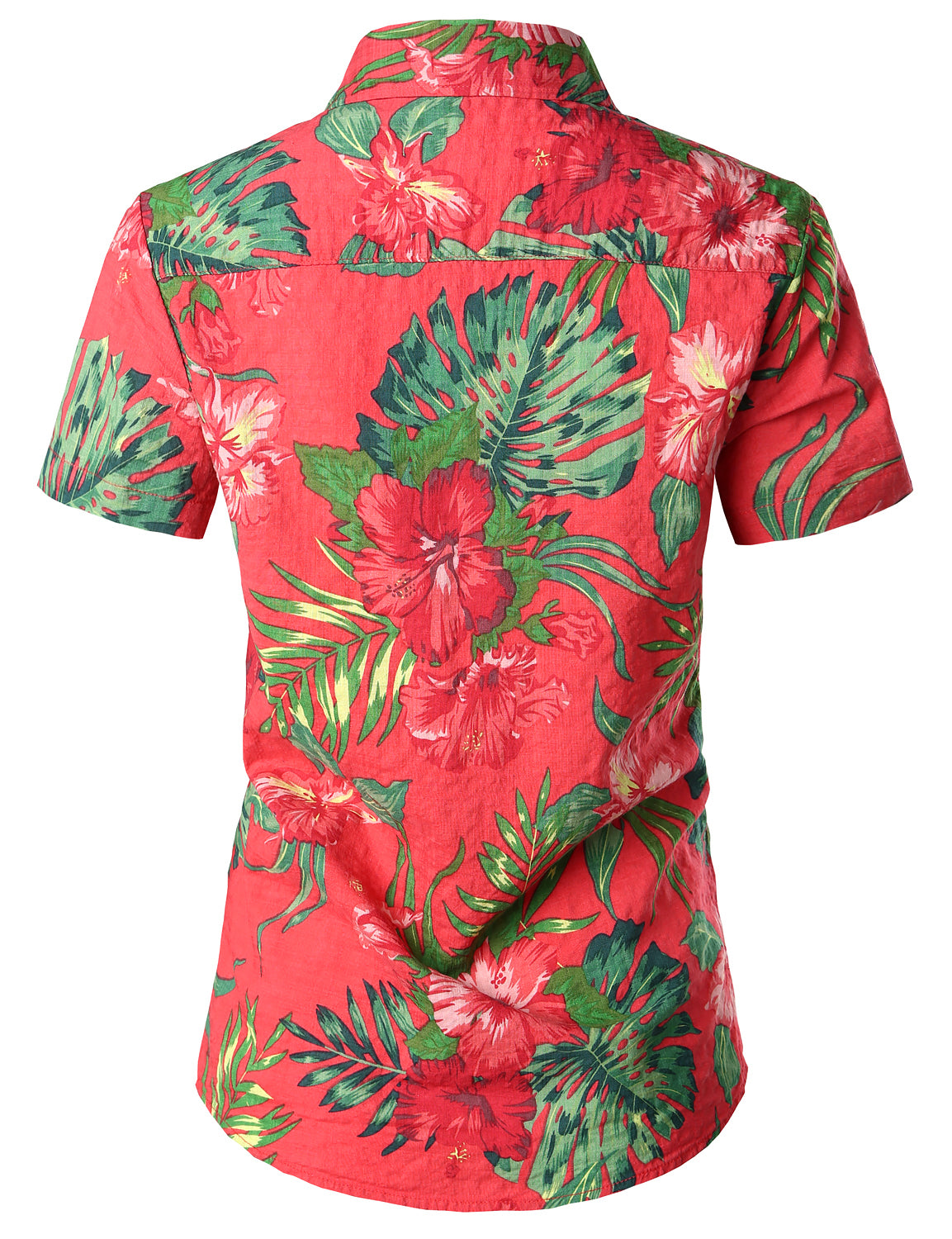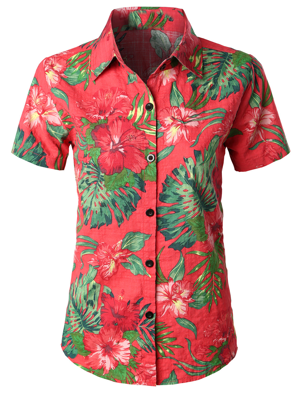 Women's Floral Print Breathable Blouse Cotton Aloha Short Sleeve Red Hawaiian Shirt