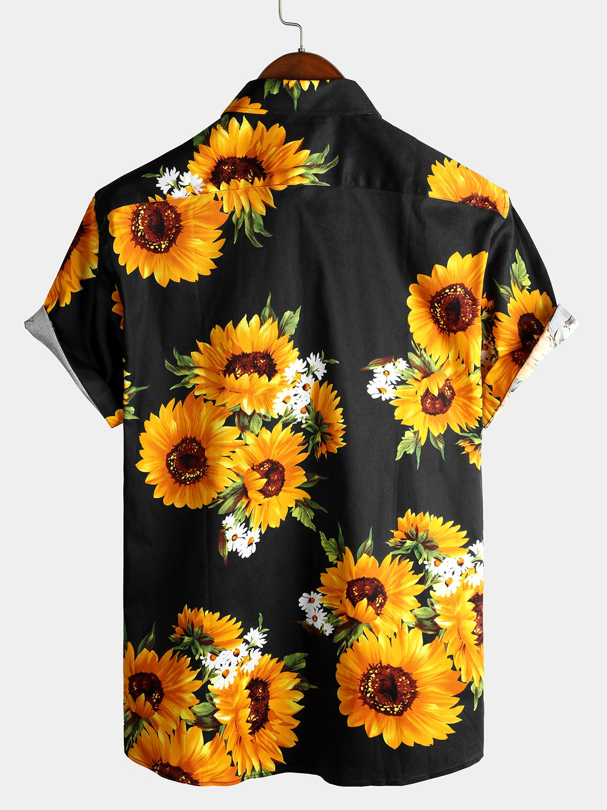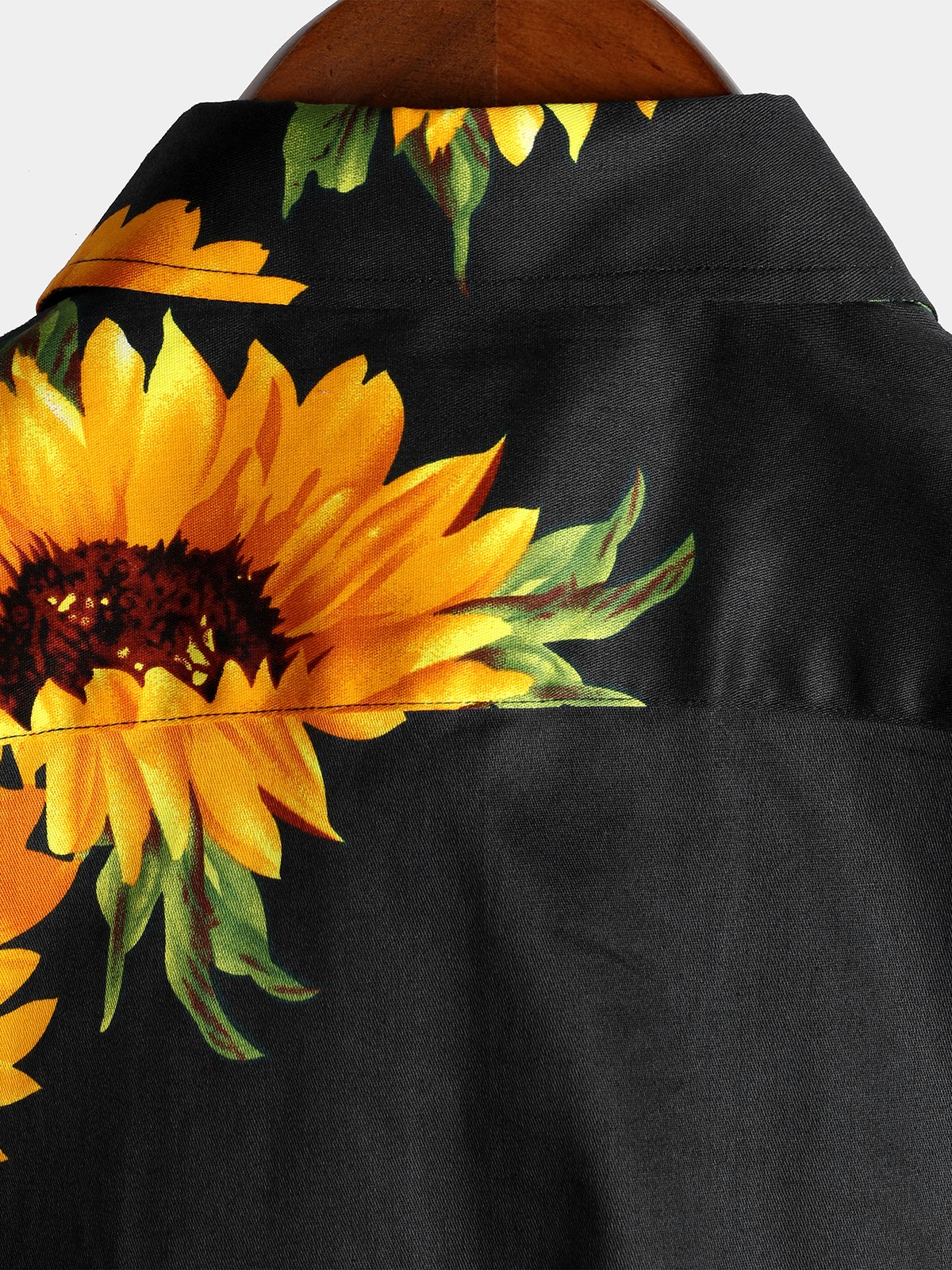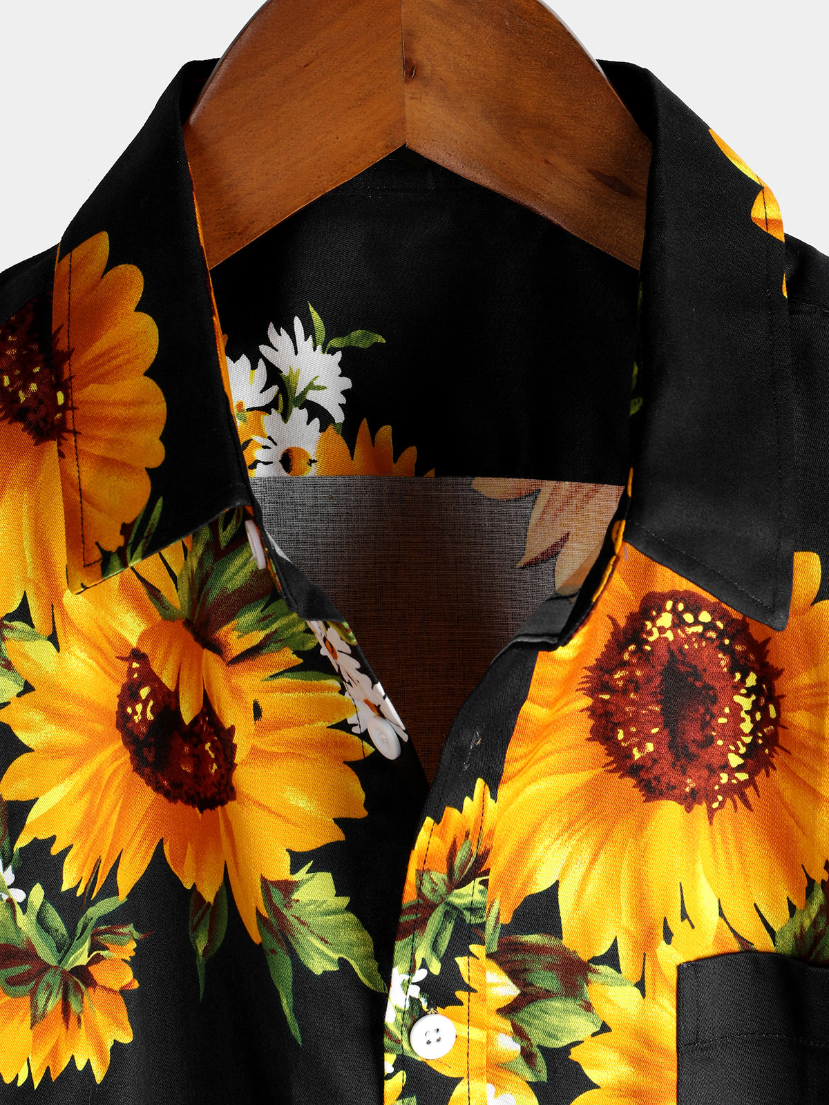 Men's Black Vintage Sunflower Pocket Short Sleeve Shirt