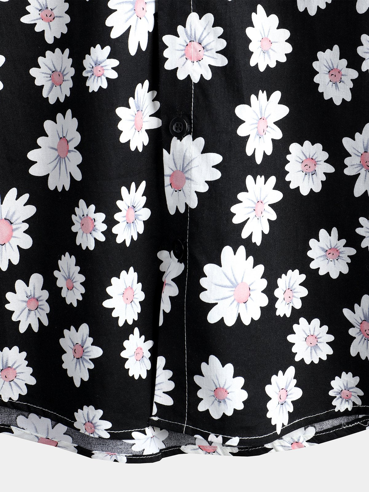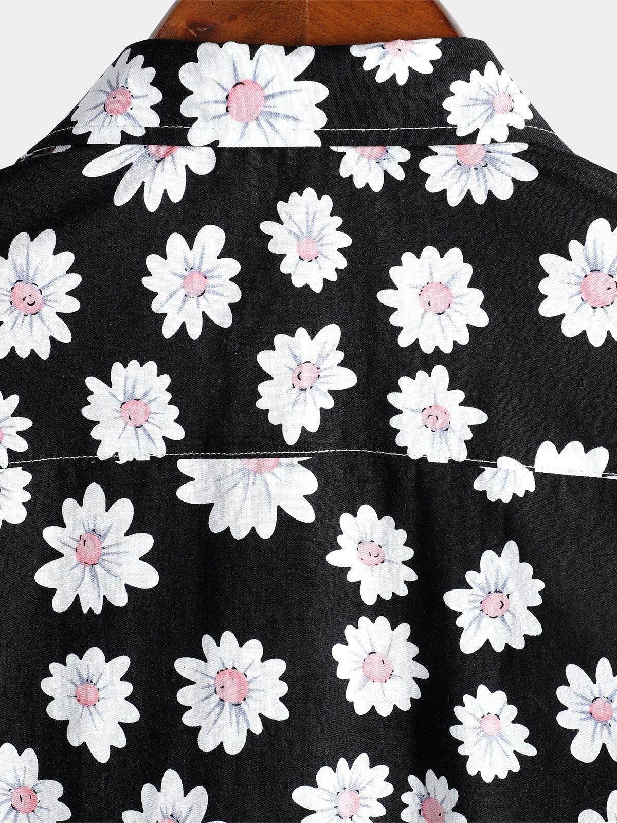Men's Floral Daisy Print Tropical Hawaii Cotton Black Shirt