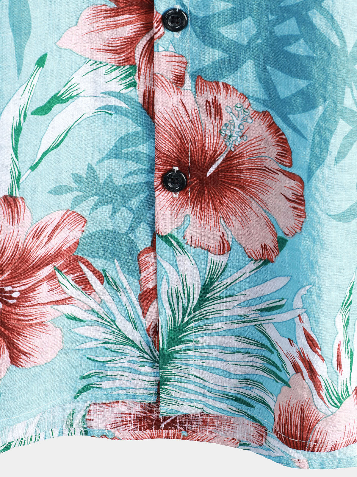 Men's Hawaiian Tropical Button Hibiscus Floral Print Vacation Beach Blue Short Sleeve Shirt
