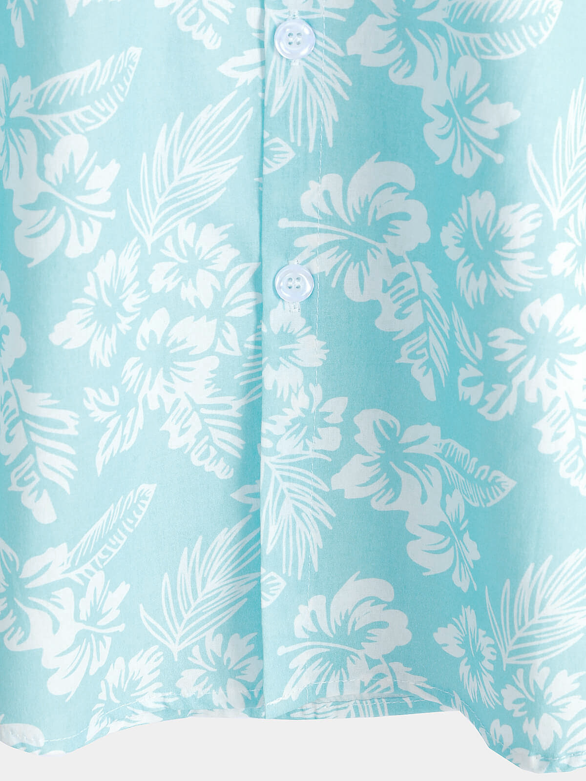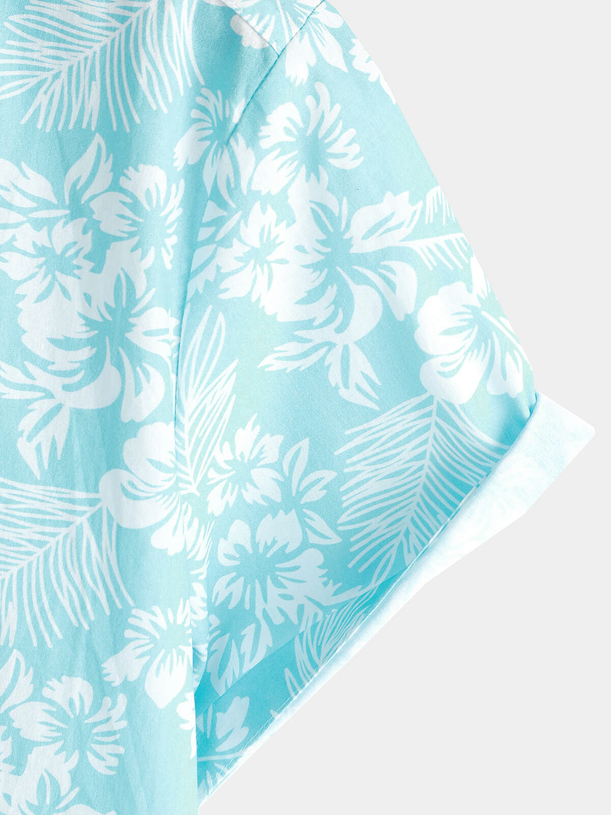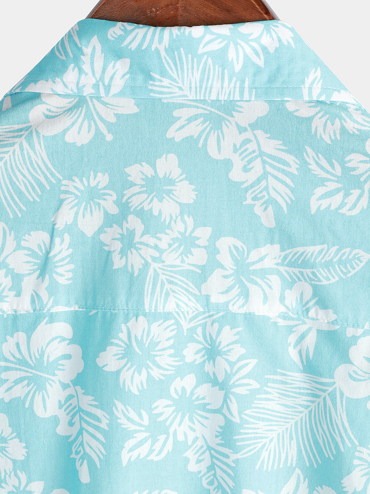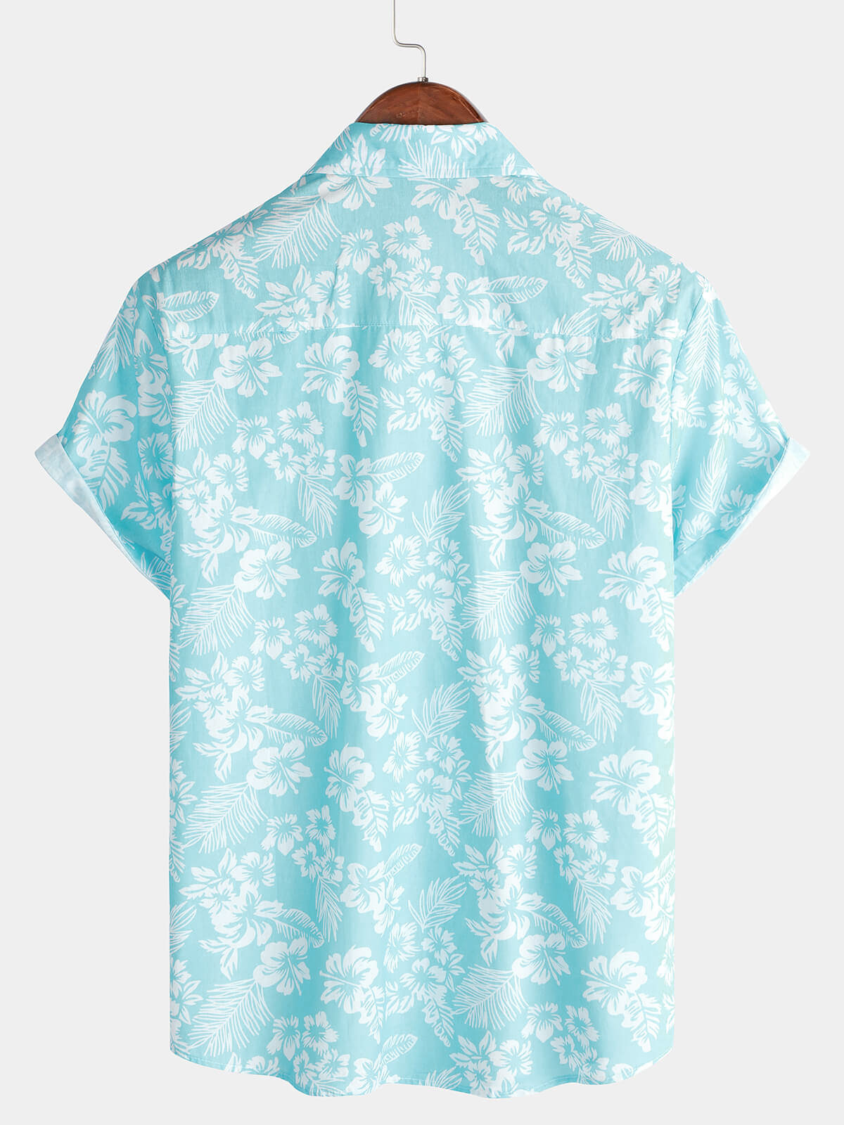 Men's Holiday Blue Hawaiian Floral Button Up Short Sleeve Shirt