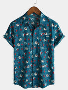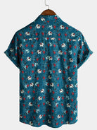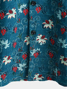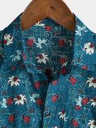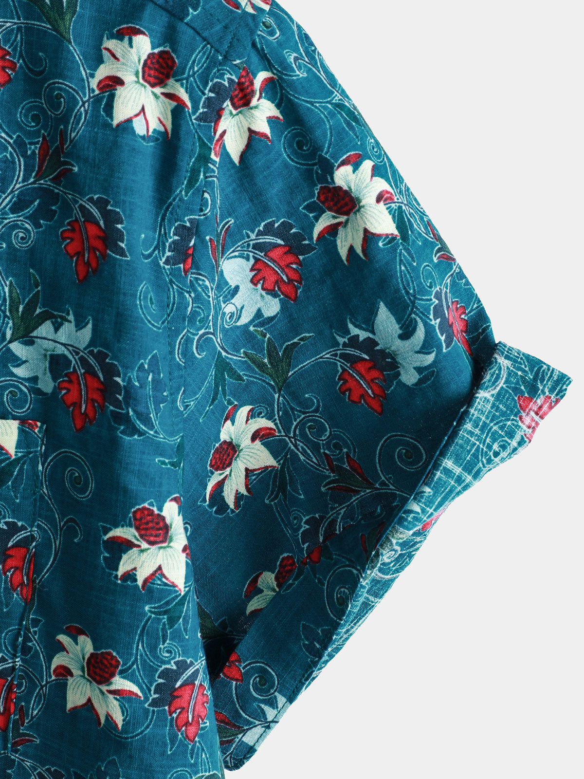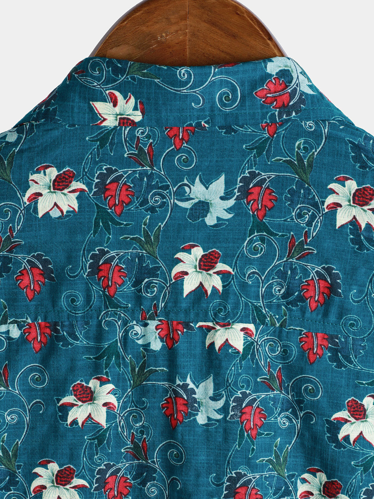 Men's Blue Tropical Flower Print Short Sleeve Cotton Shirt