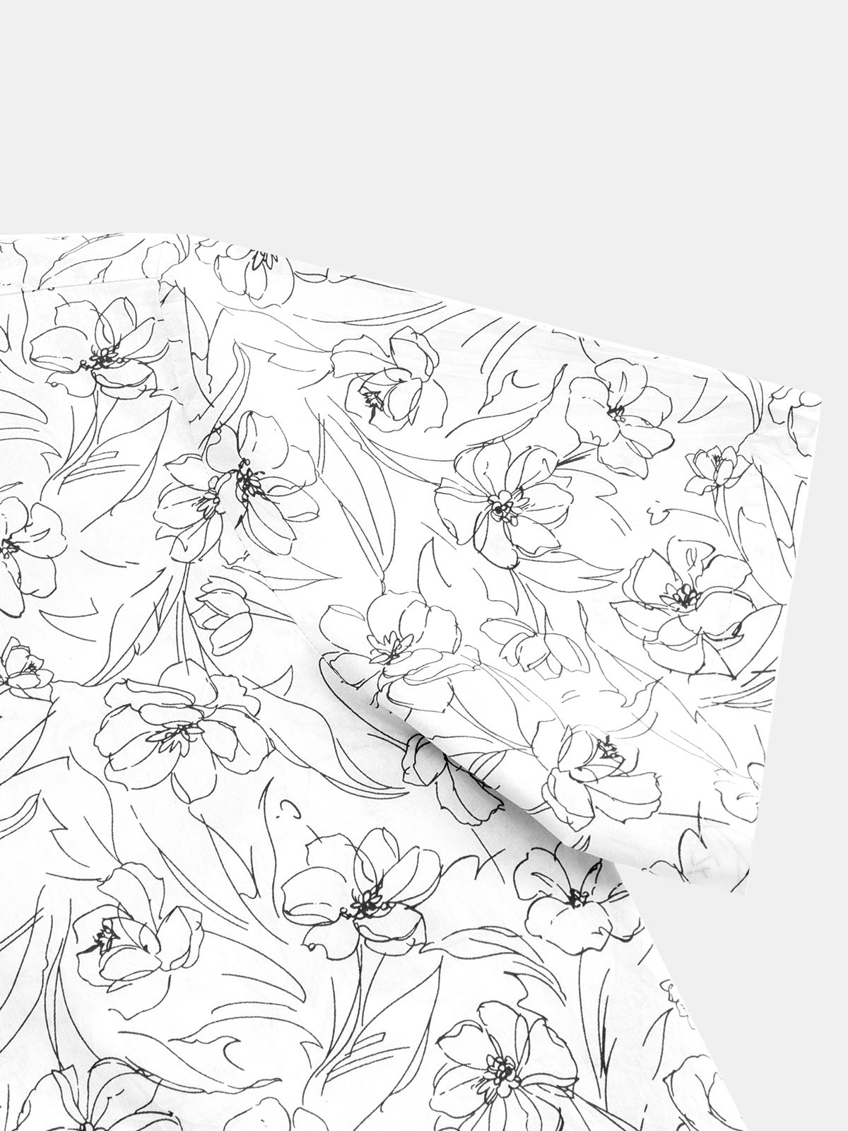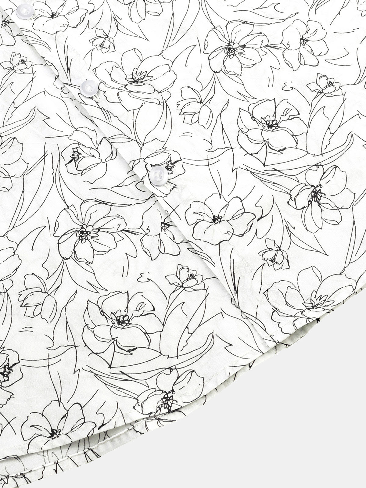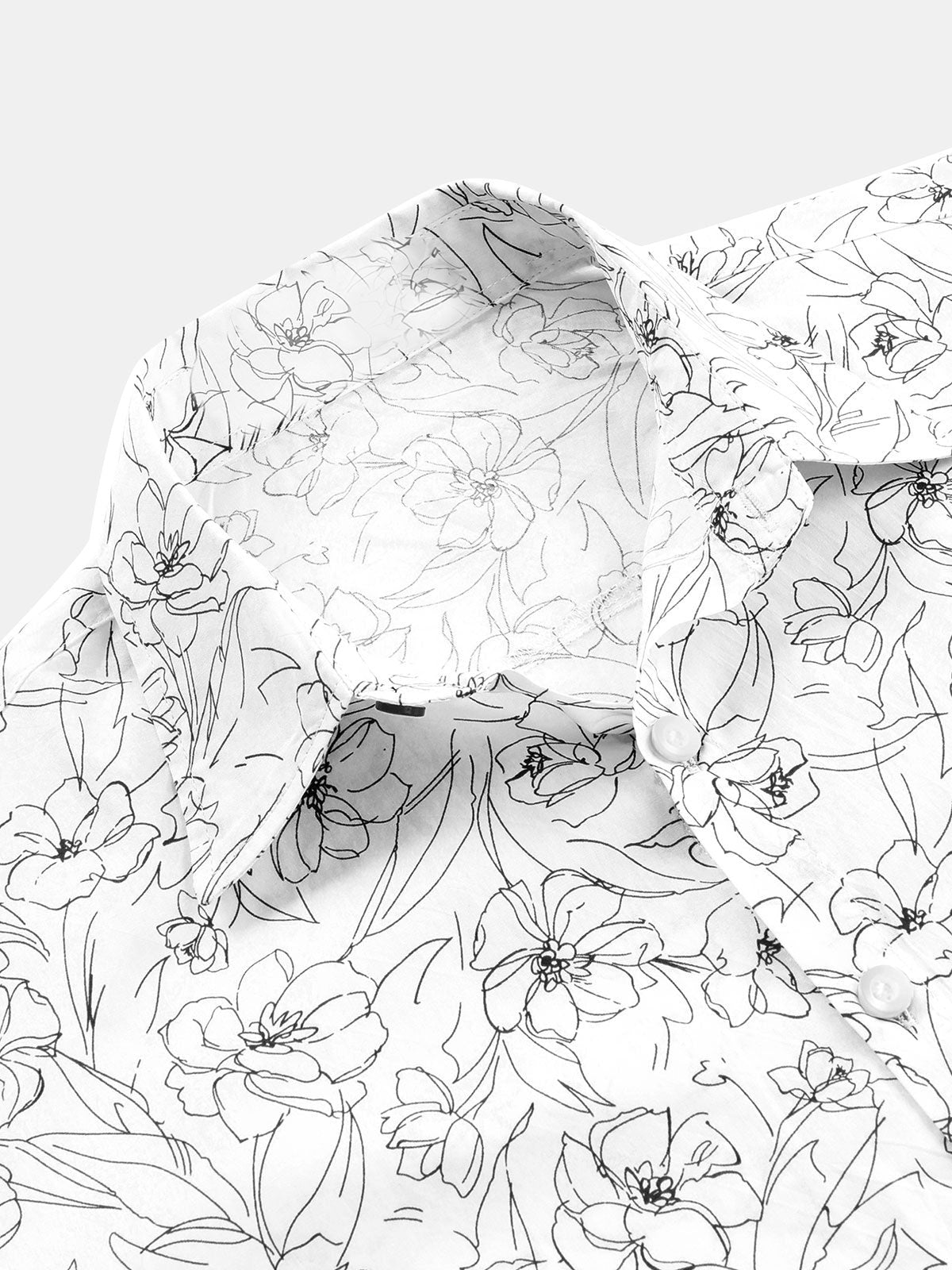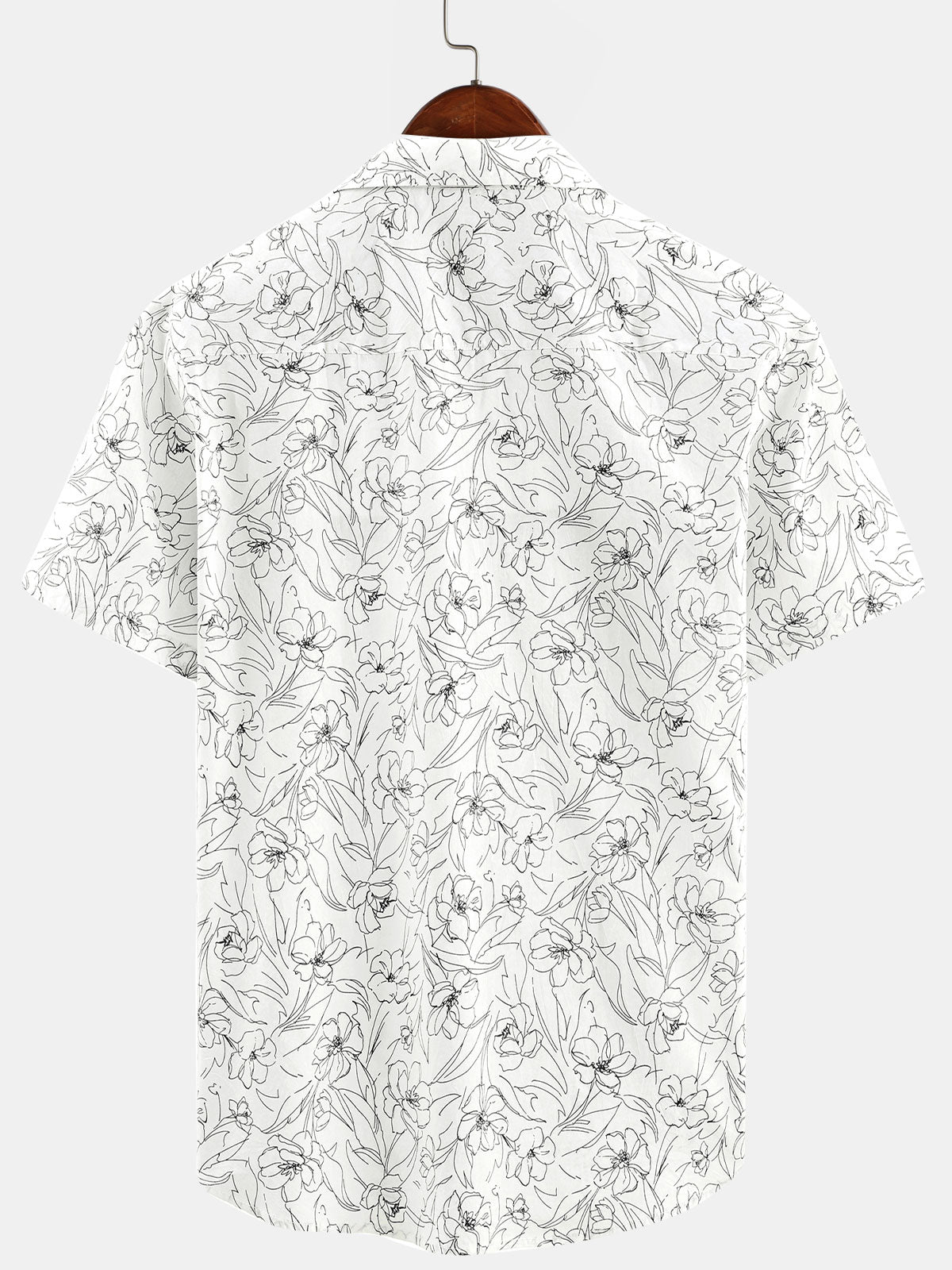 Men's Summer Casual Line Floral Print White Cotton Short Sleeve Shirt