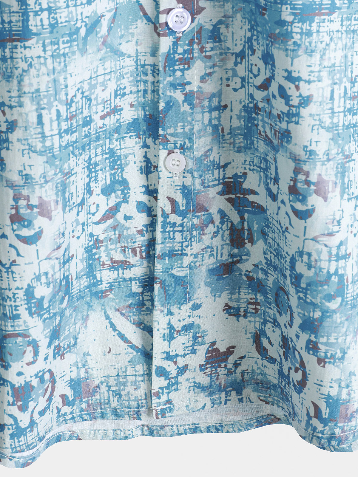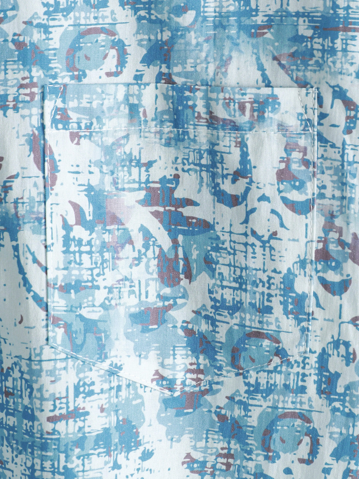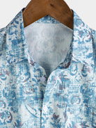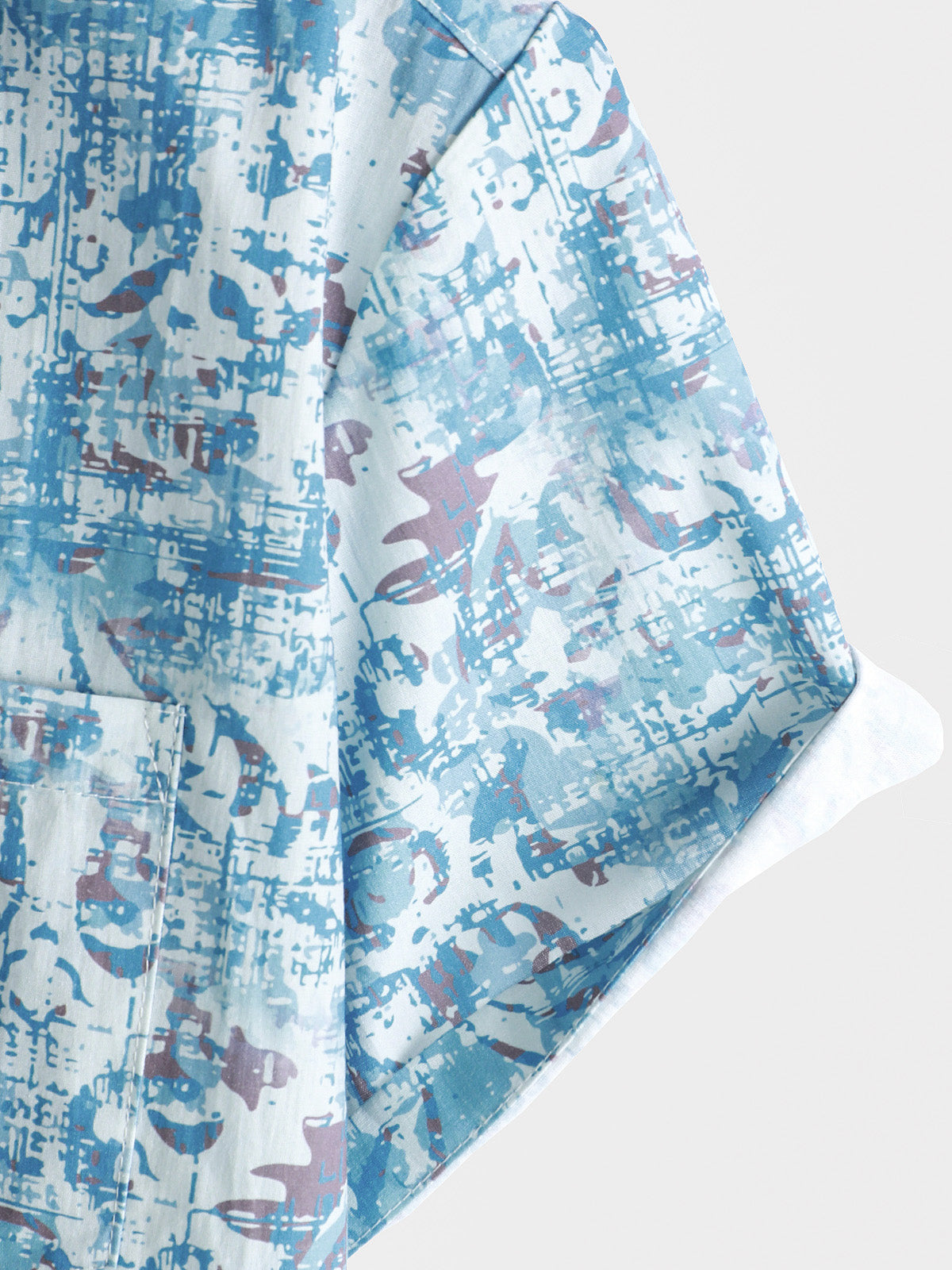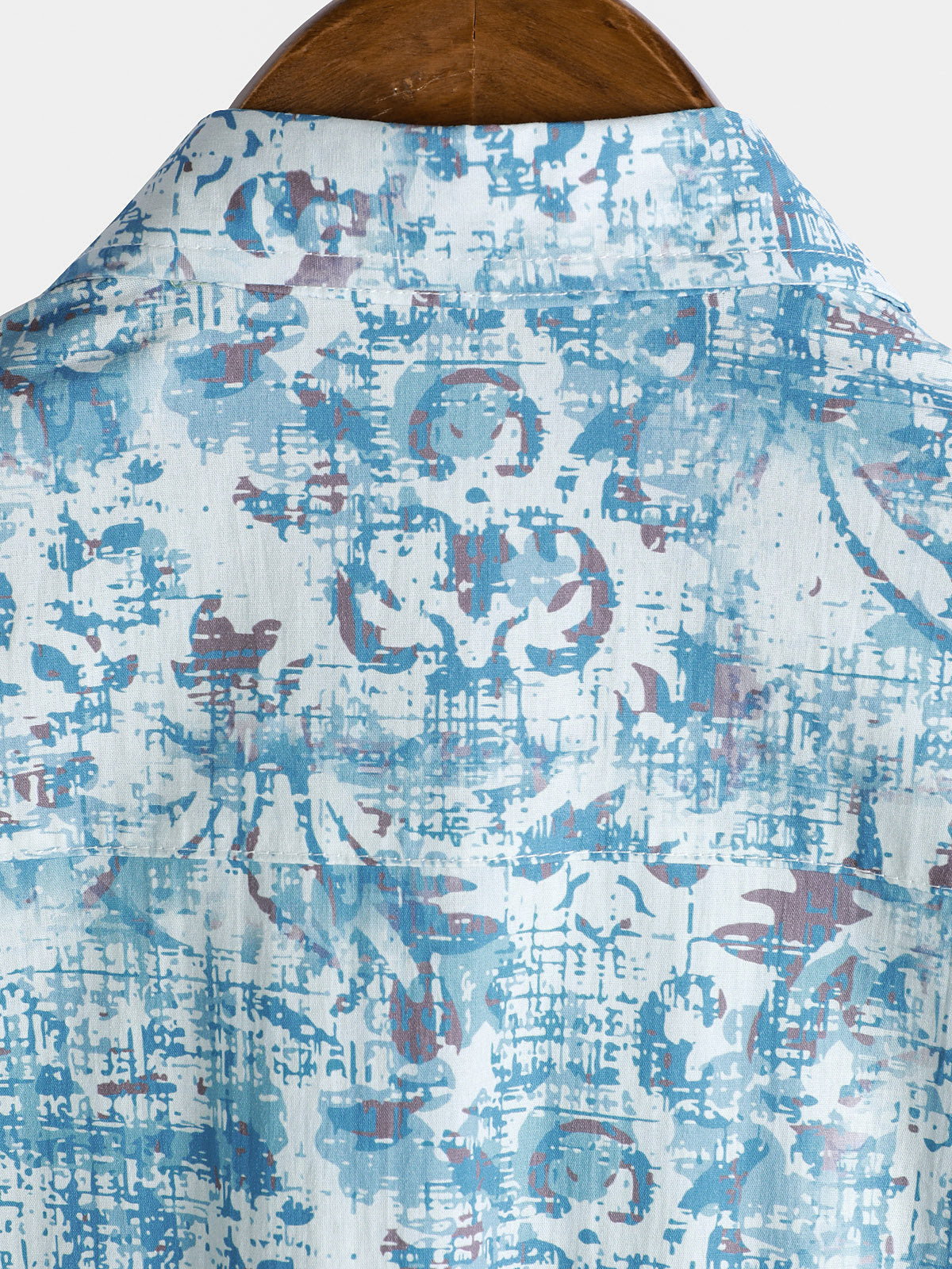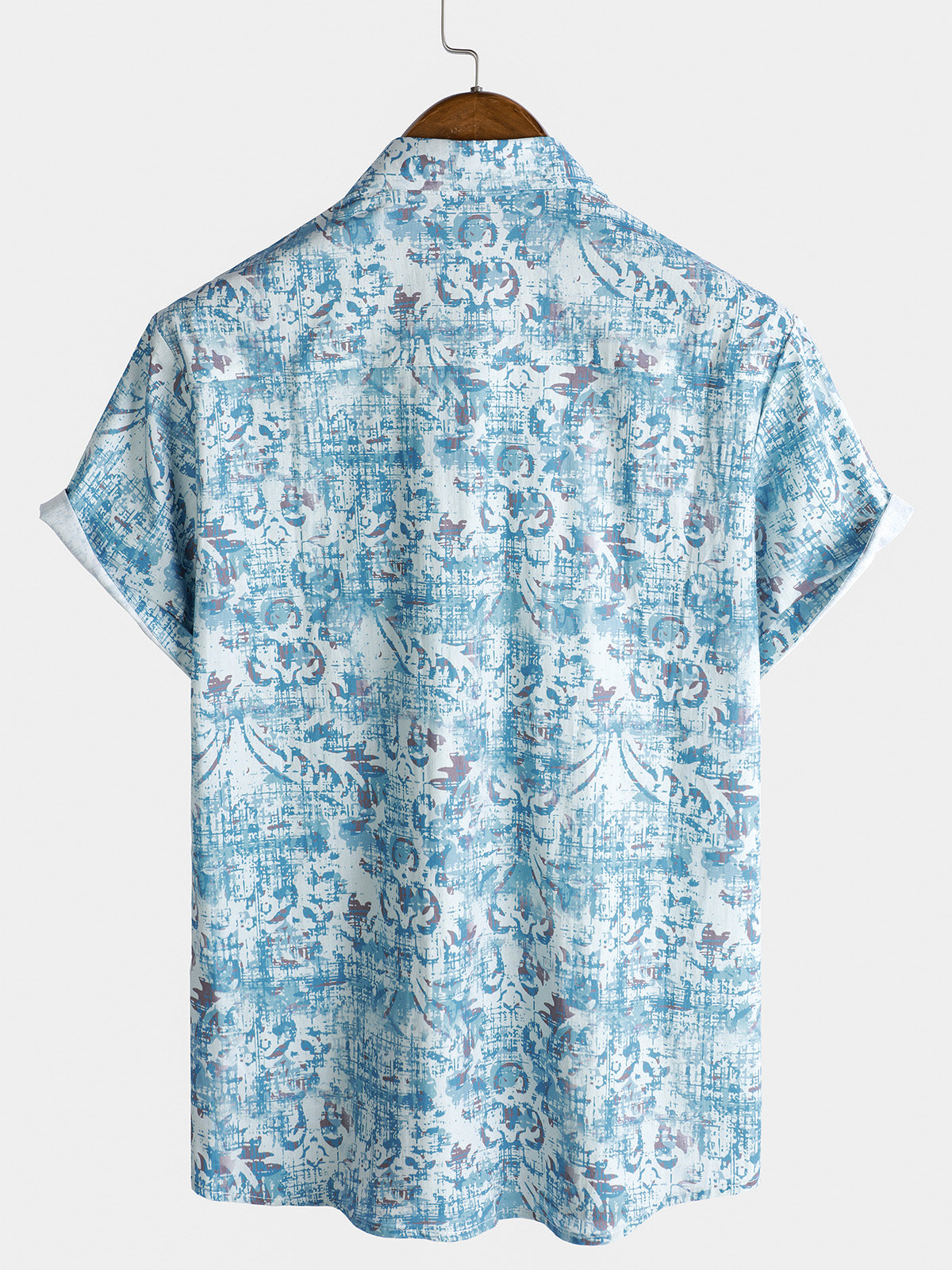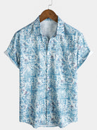 Men's Blue Floral Print Summer Breathable Pocket Short Sleeve Shirt