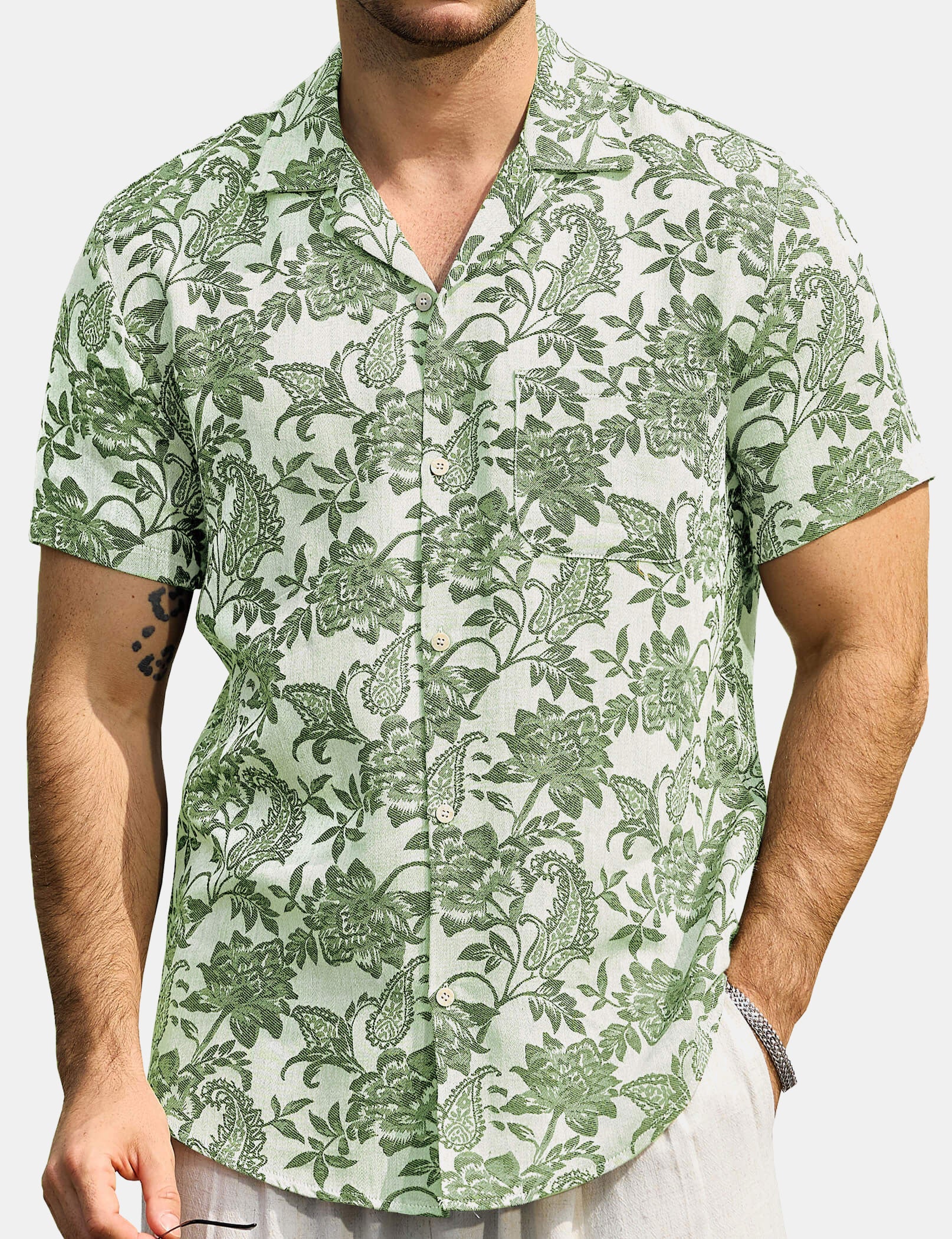 Men's Floral Hawaiian Pocket Green Button Up Short Sleeve Shirt