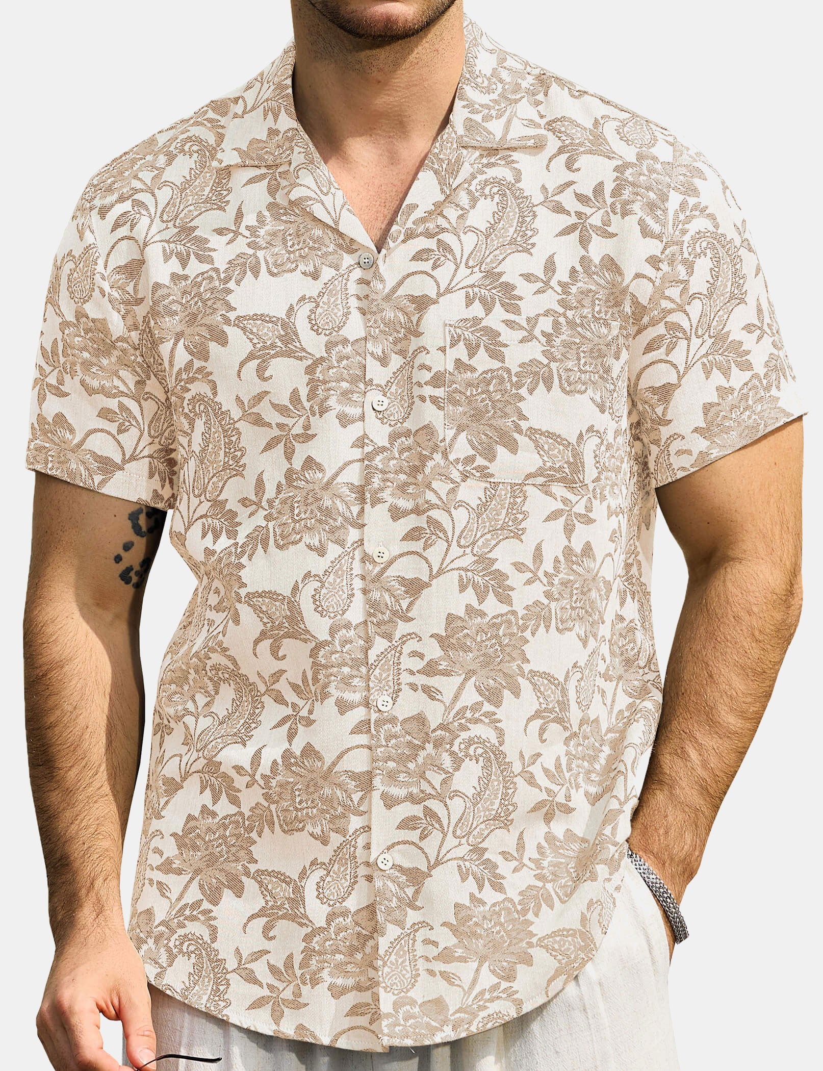 Men's Floral Casual Cotton Khaki Short Sleeve Hawaiian Shirt